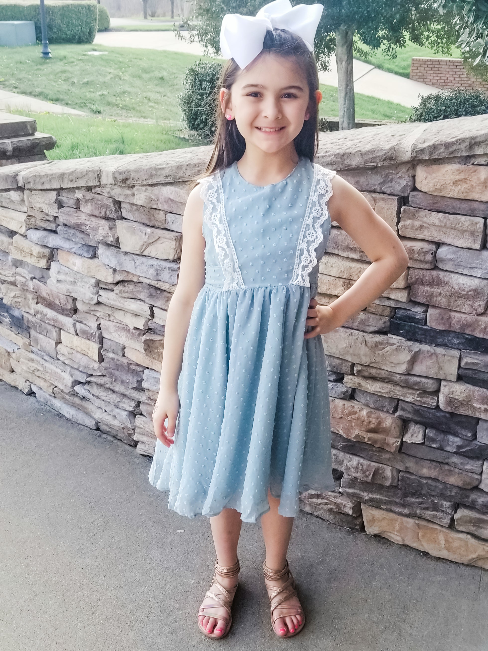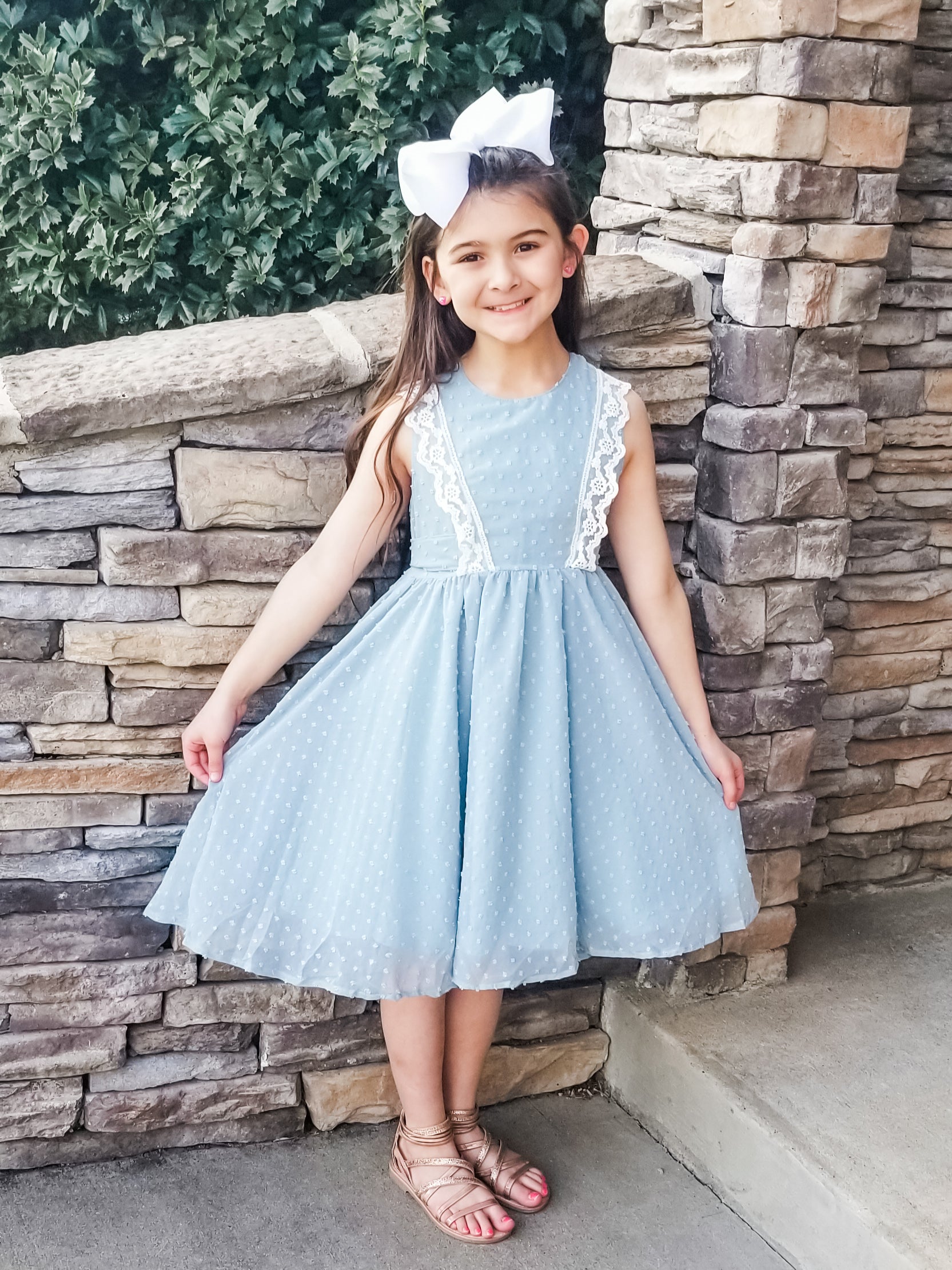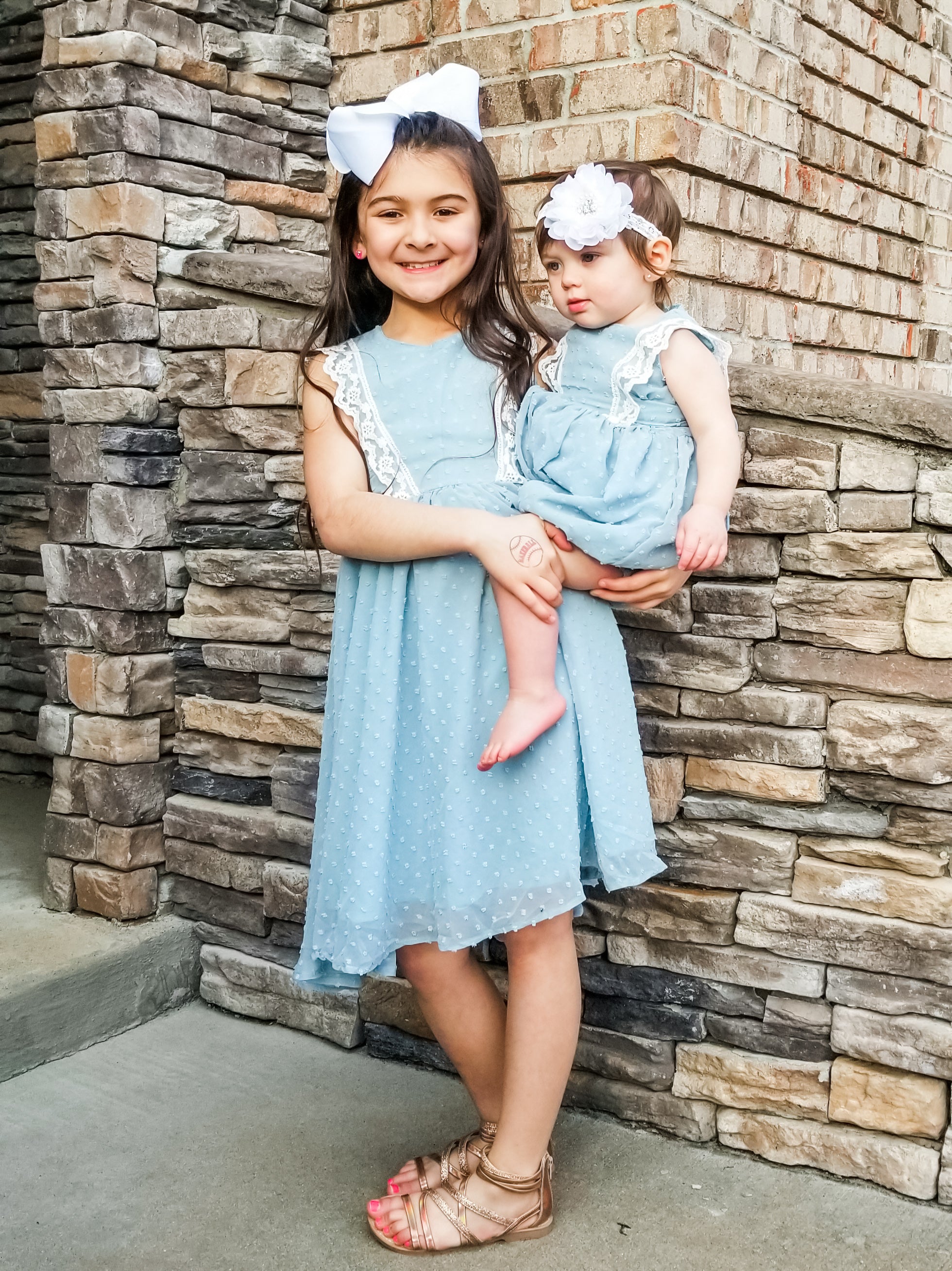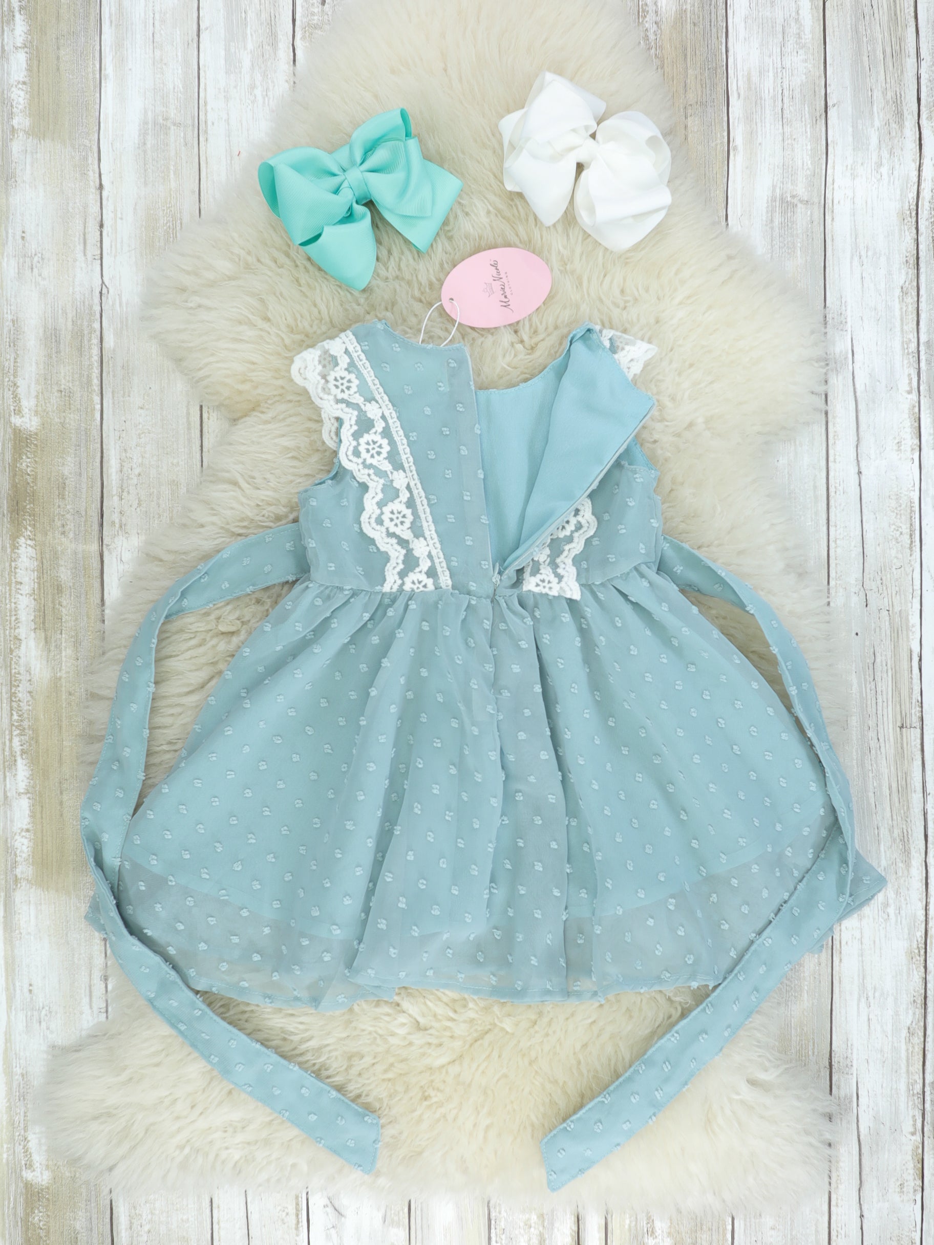 This MNC exclusive sister set is perfect for any special occasions your littles have planned during those warmer months! This ash blue dress features a precious Swiss dot pattern, embroidered lace details, an adjustable tie around the midsection, and a zippered back. Matching bloomers included with all sizes 2YRS AND UNDER.