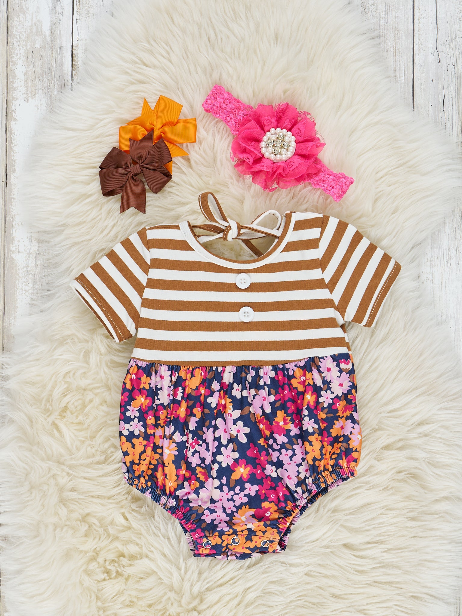 This is a style-savvy sister set that's sure to turn heads! It is perfect for little ones and features mixed prints of mocha stripes and ditsy purple and orange florals. A sweetly outstanding choice!