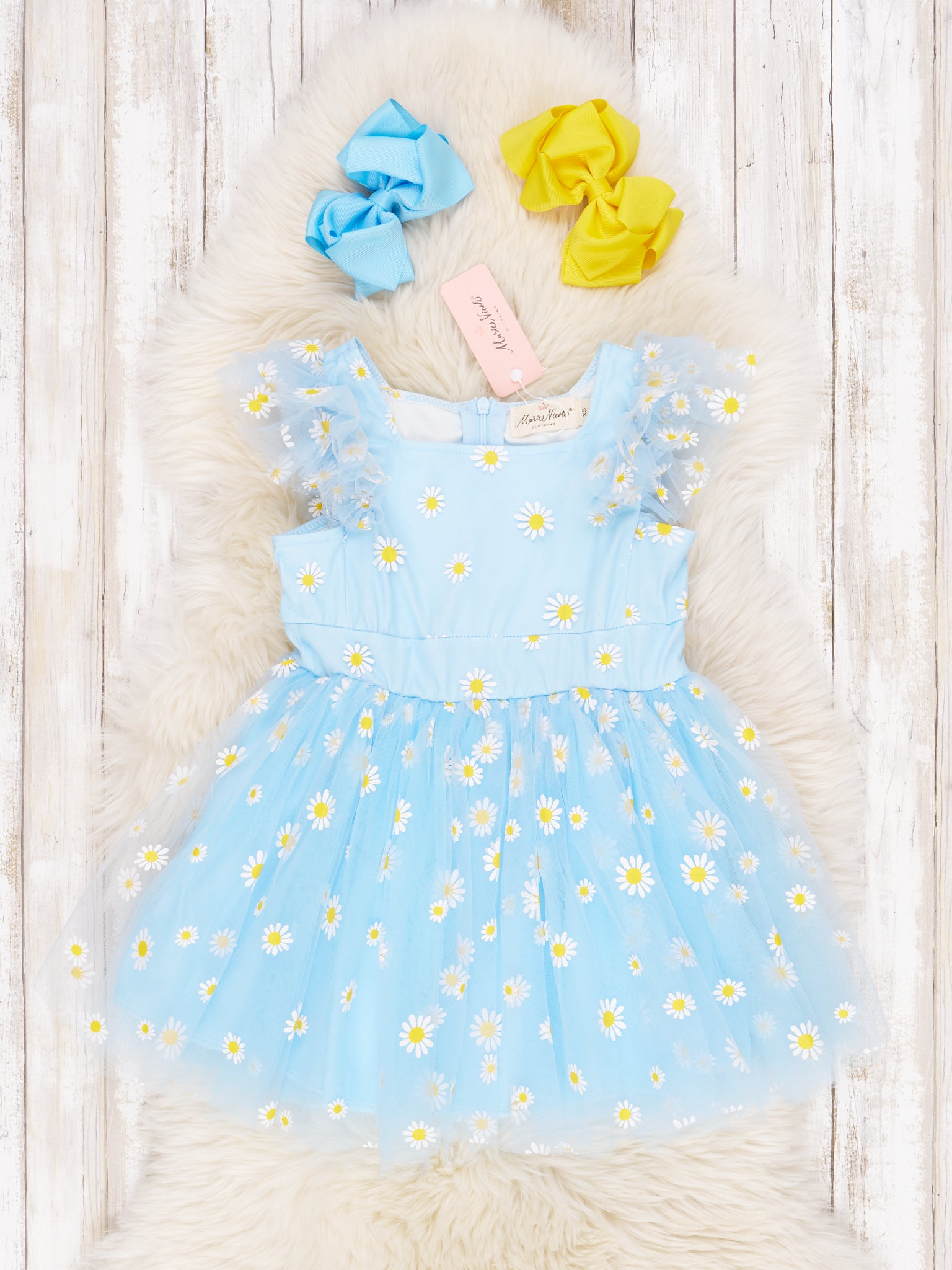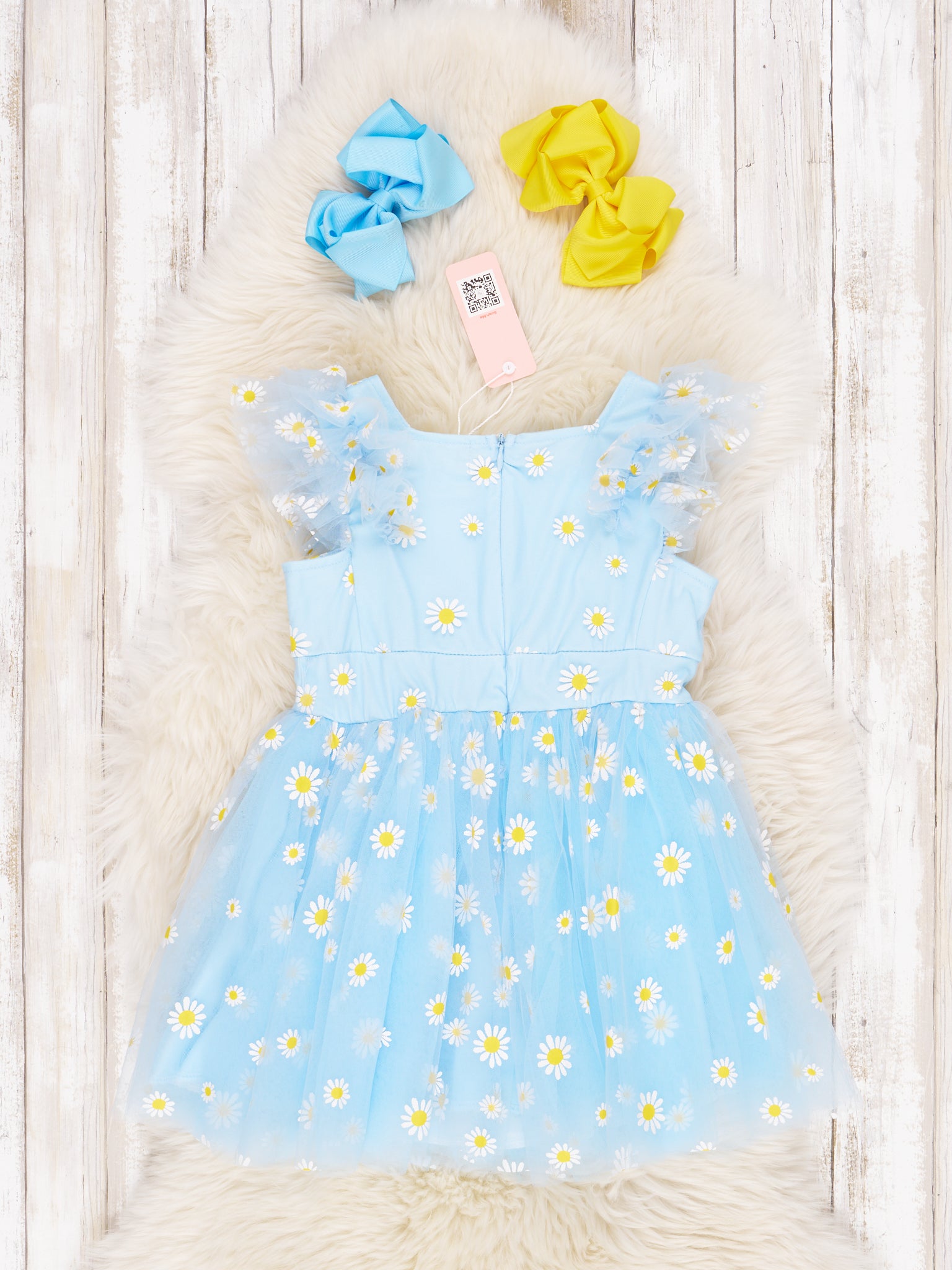This Baby Blue Tulle Daisy Ruffle Dress is a daisy-licious dream come true! It's perfect for special occasions, with a zippered back, daisy details, and ruffle sleeves that will have everyone buzzing. Its super-soft tulle will have your little one twirling and showing off her style. Blooming marvelous!