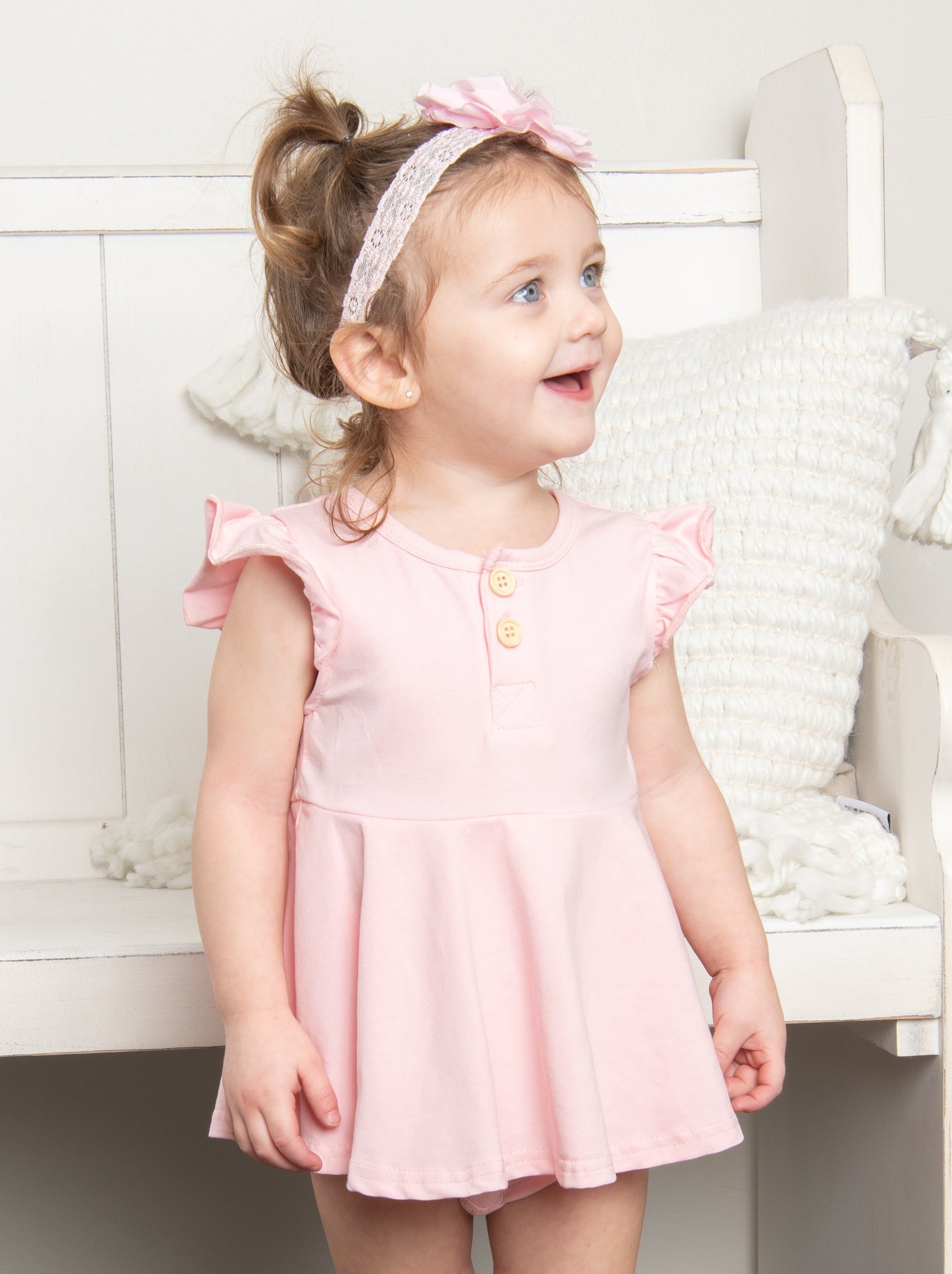 The softest cotton rompers for your sweet girls! This baby pink romper features functioning buttons, flutter sleeves, & snap buttons for easy changing!