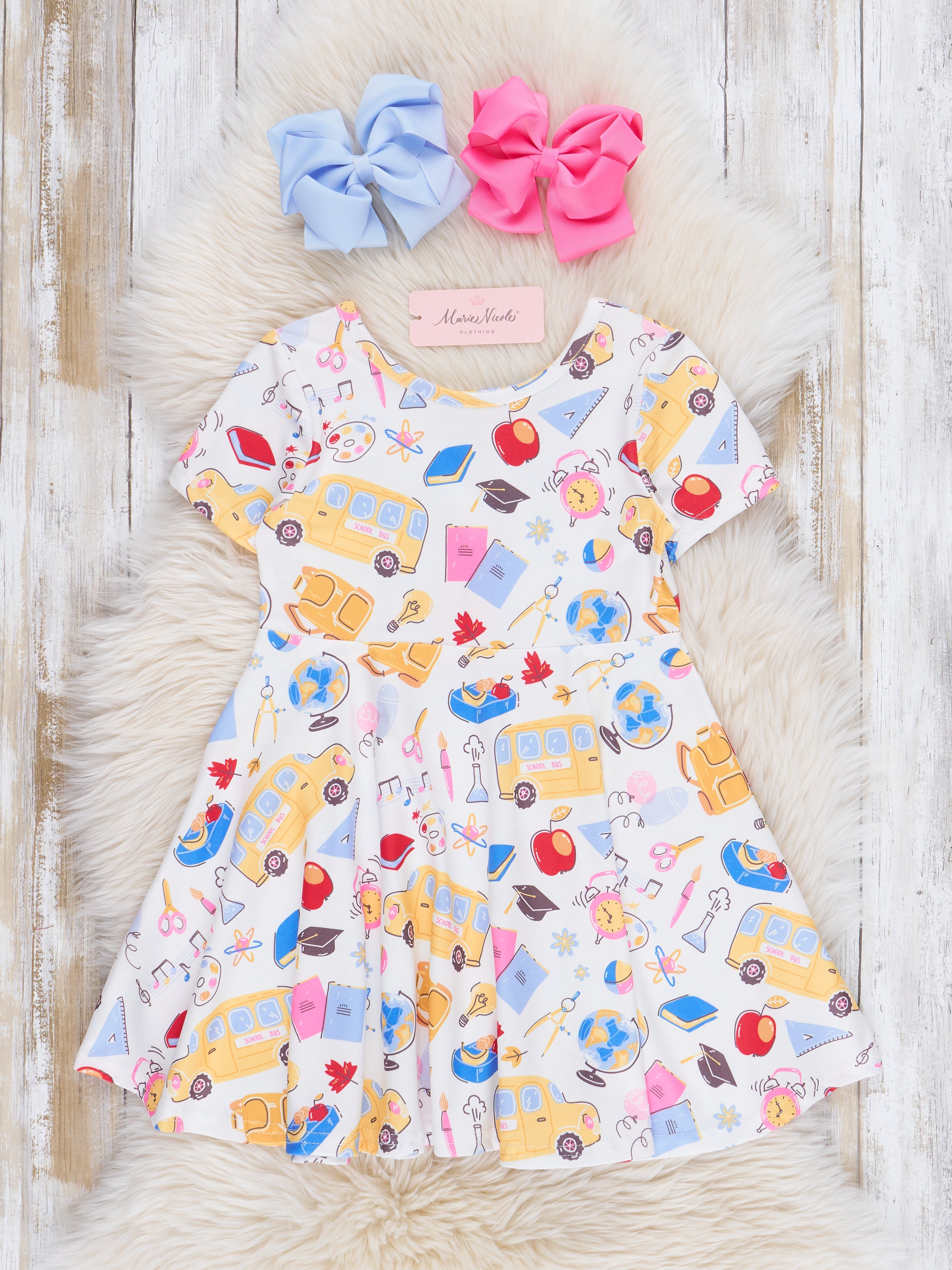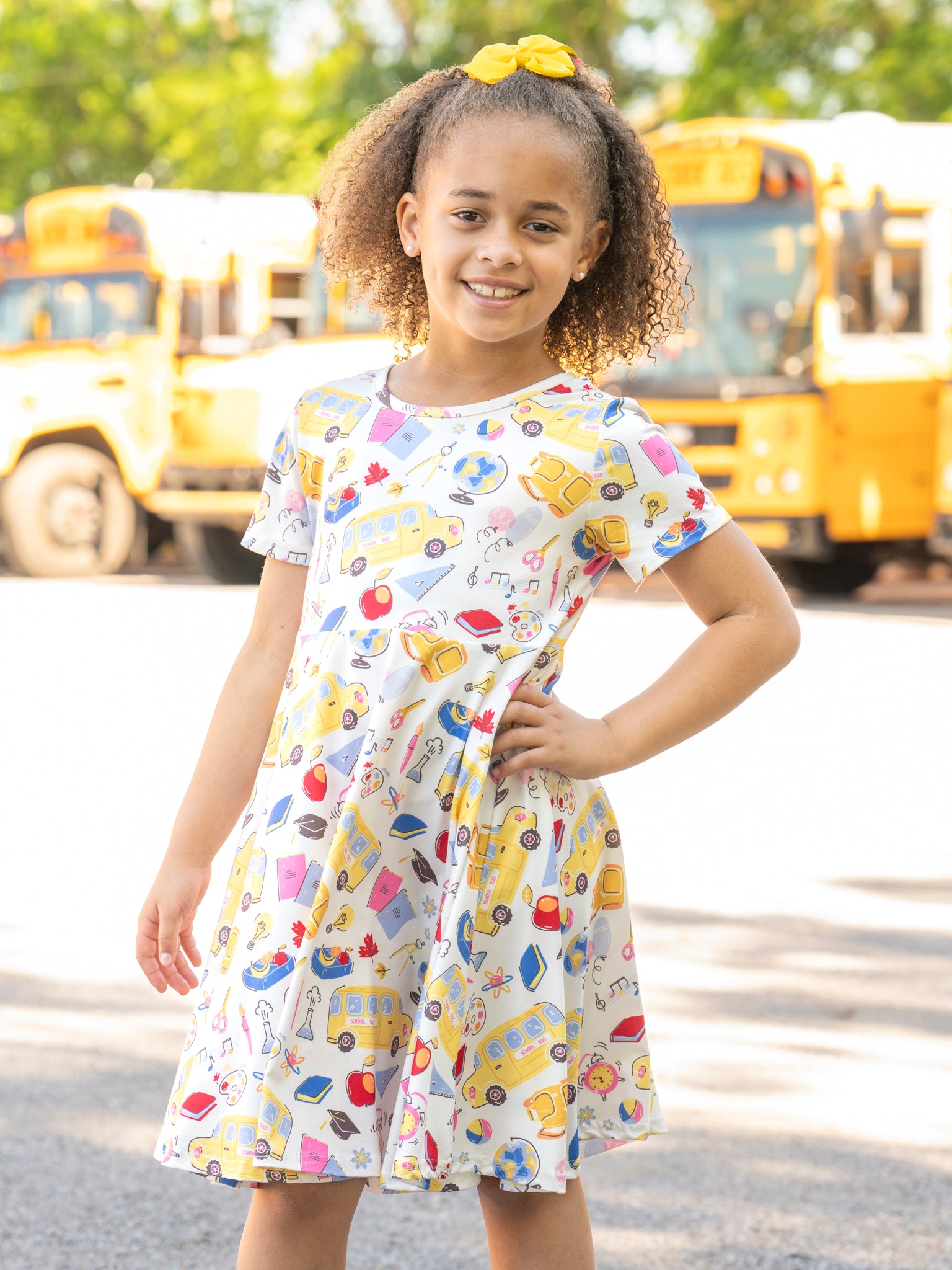 Hit the books in style with this playful school bus-printed swing dress! Perfect for your little scholar, its lightweight fit and fun print will make those long days of studying a breeze. Show up to the classroom in style; with the Watercolor School Bus Swing Dress, you'll be the coolest kid on campus!