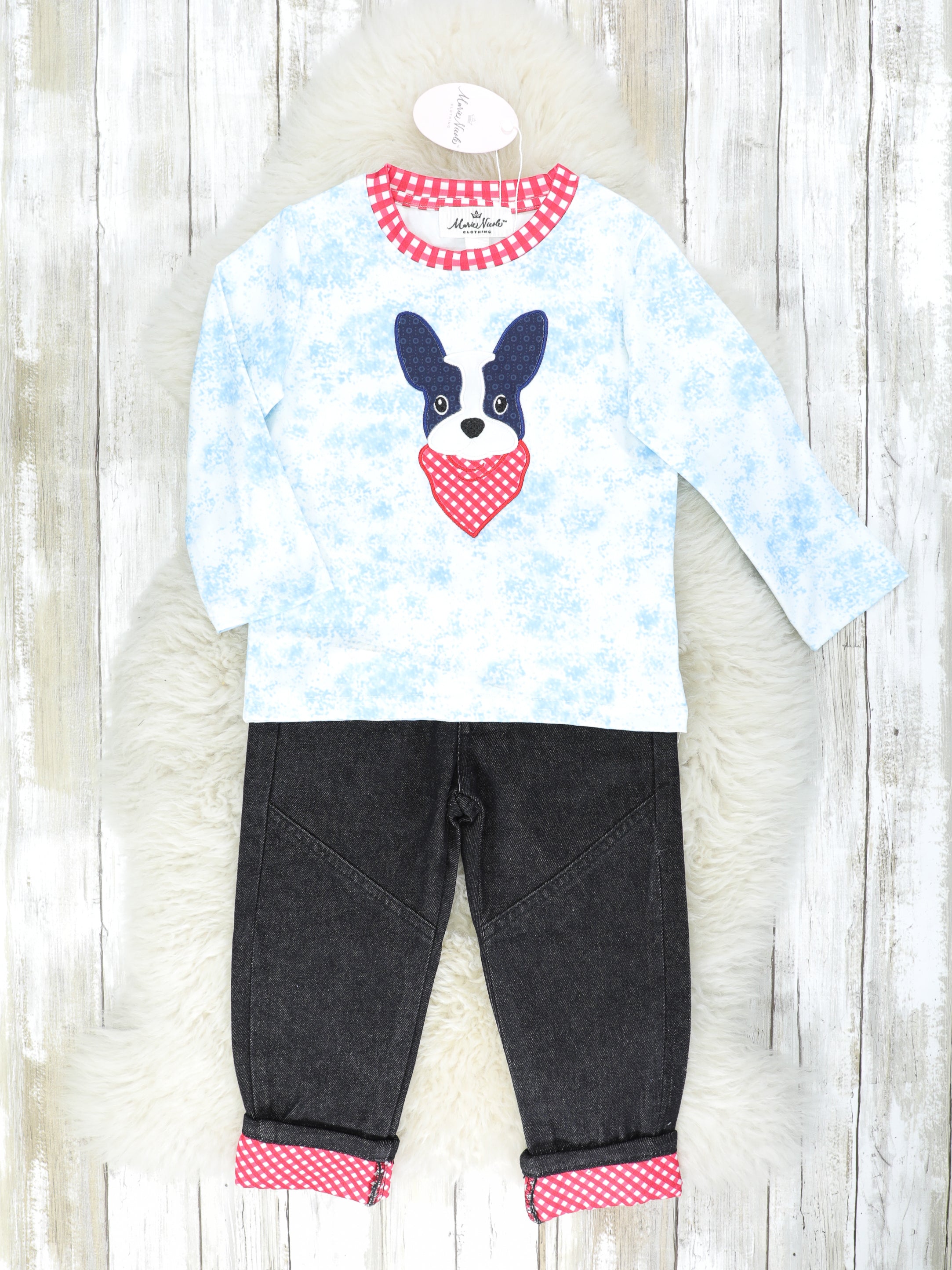 A paw-some set for your pups! This outfit features a blue tie-dye top with a dog wearing a bandana detail & black denim with red polka dot trim.