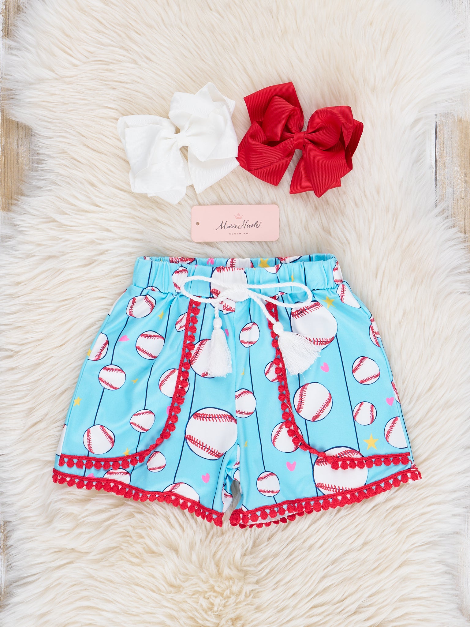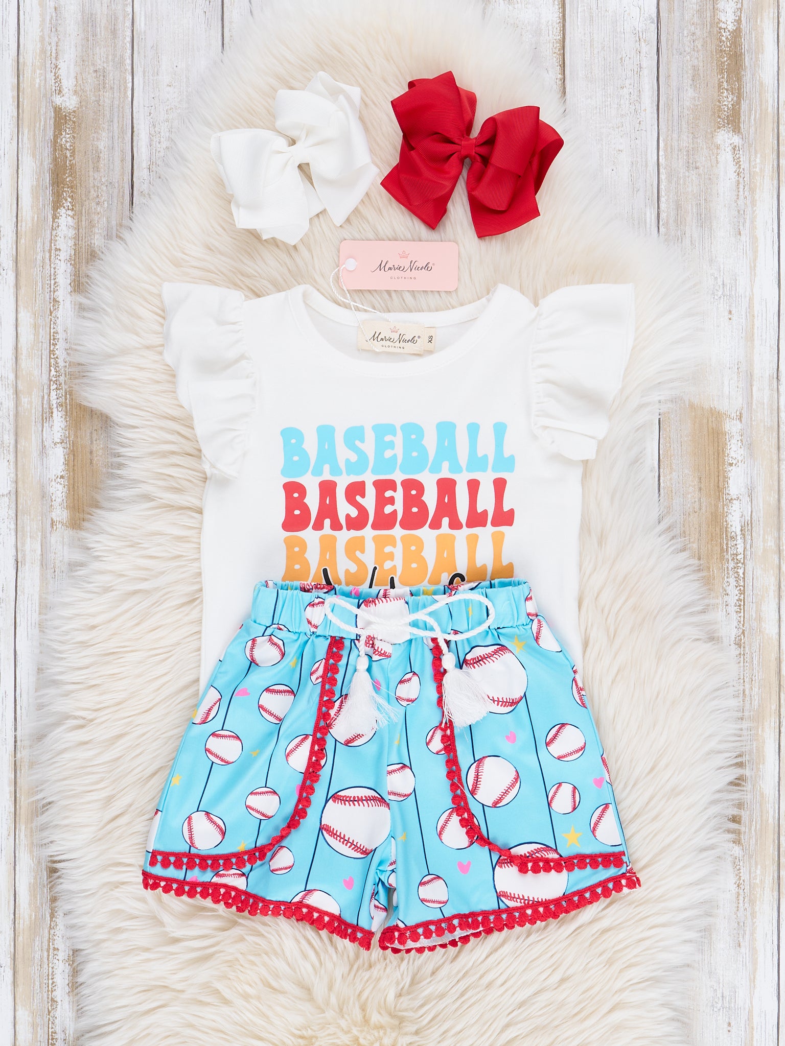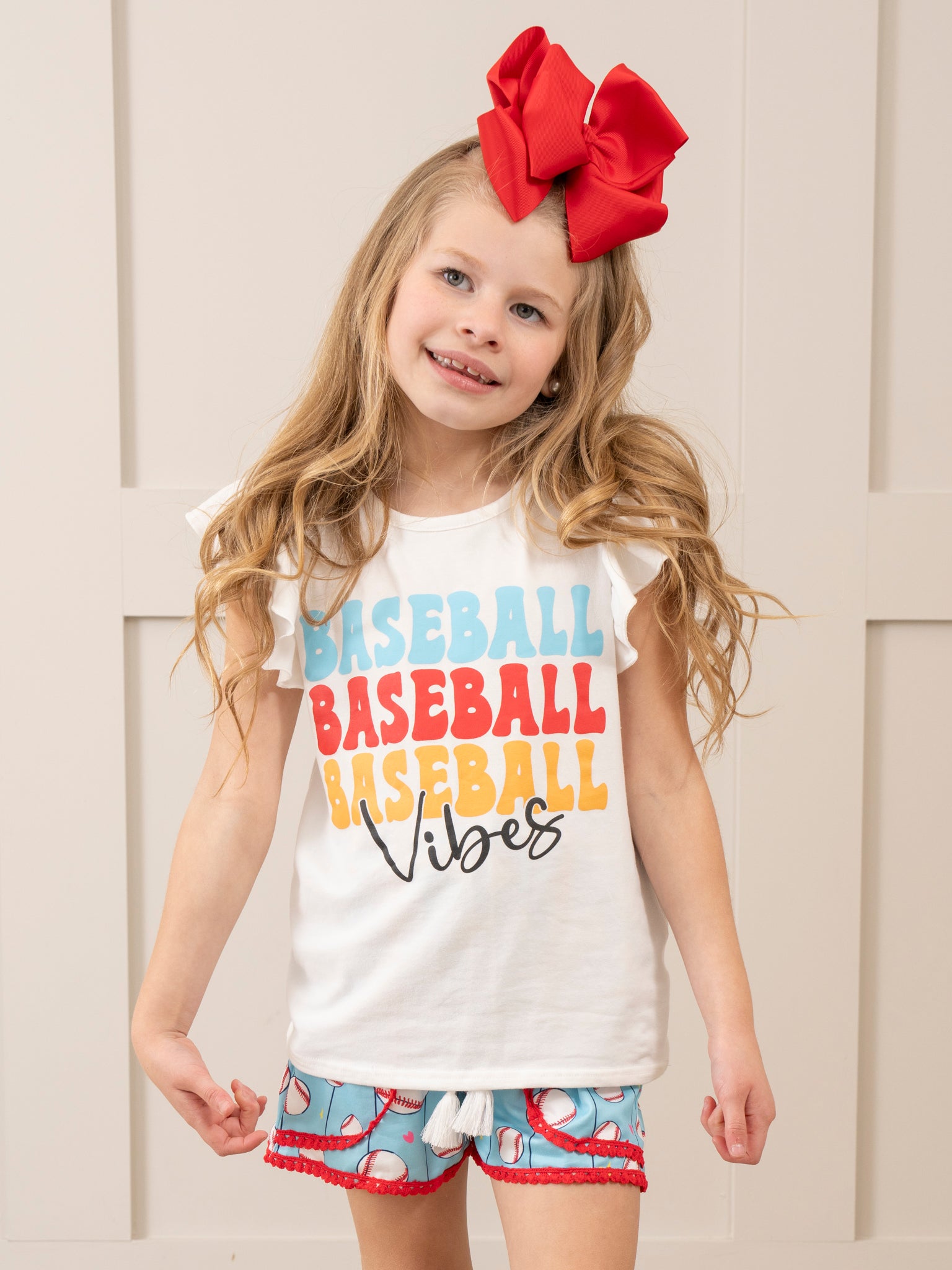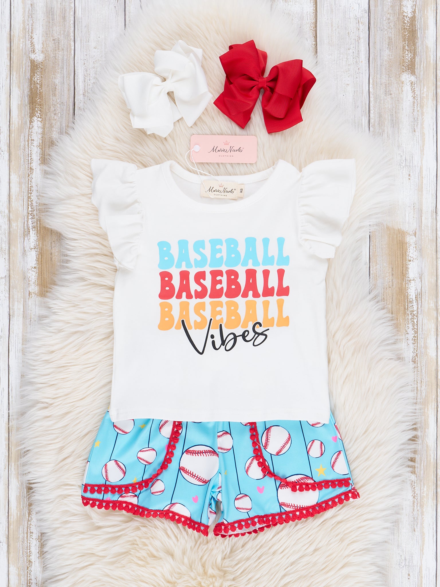 Get in the game with this Baseball Vibes Ruffle Outfit! Featuring a ruffle t-shirt and pompom trim baseball shorts, this outfit is sure to bring the fun to any occasion. Perfect for both casual wear and sports events, this outfit will have you looking stylish and feeling comfortable all day long. ⚾️