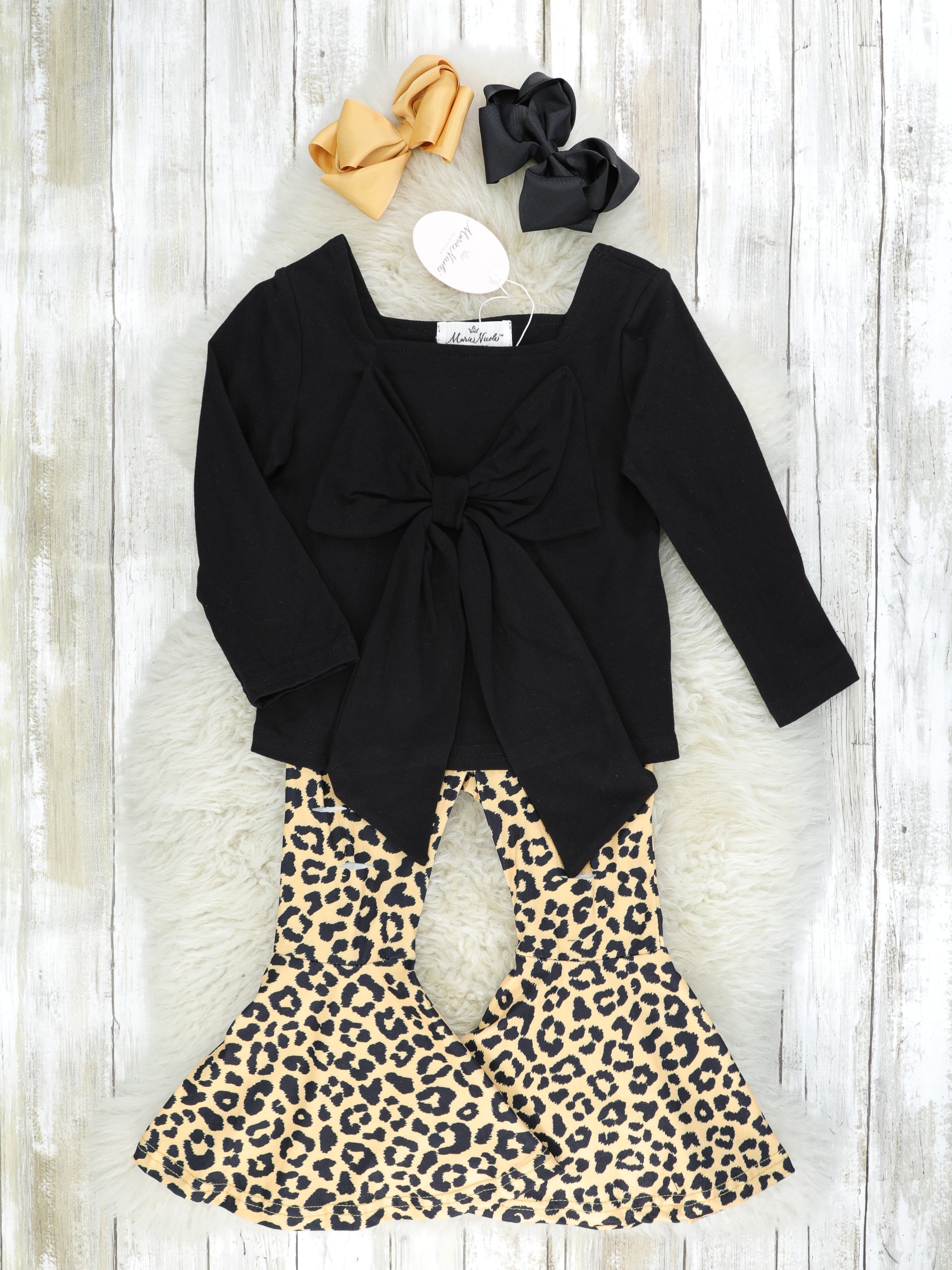 Black Bow Top & Leopard Bell Bottoms Outfit