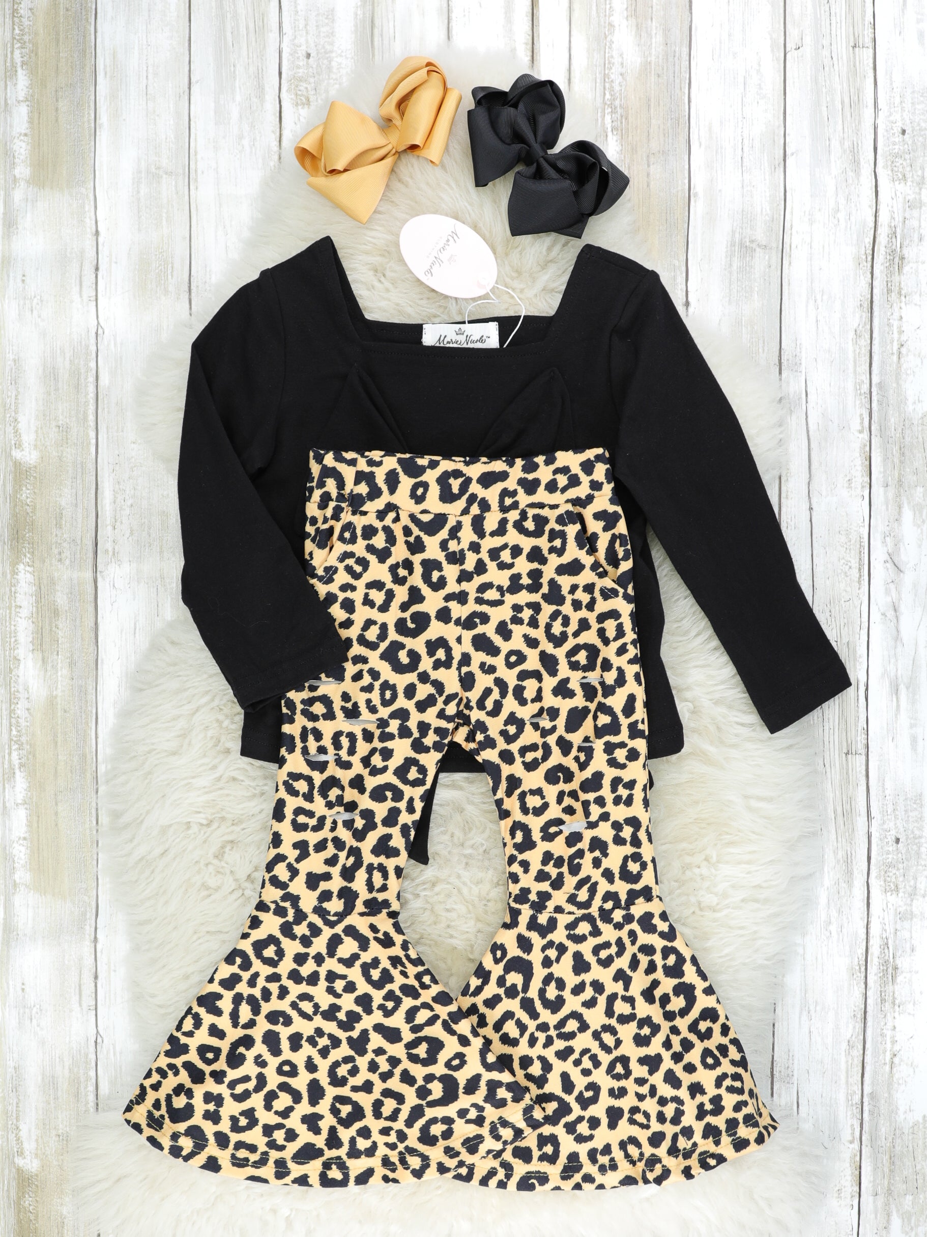 A stunning outfit for your leopard lovers! This black top features a square neckline and a beautiful bow with leopard print bell bottoms.