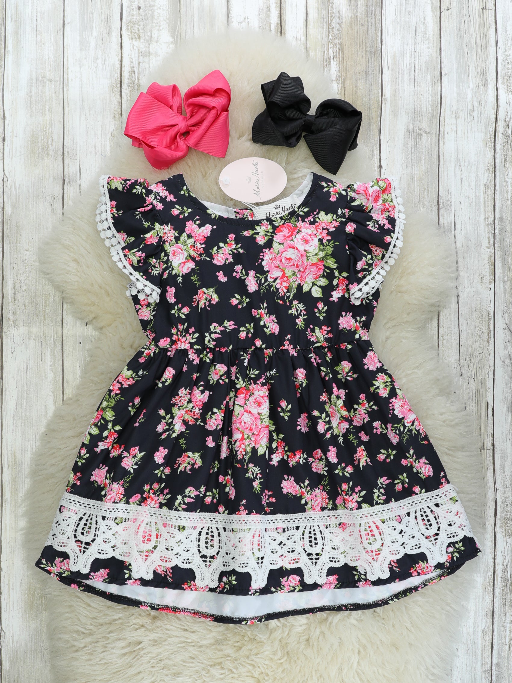 Florals & lace is everything your girly girl needs in a dress! This black swing dress features flutter sleeves, a pretty pink floral print, & embroidered lace.