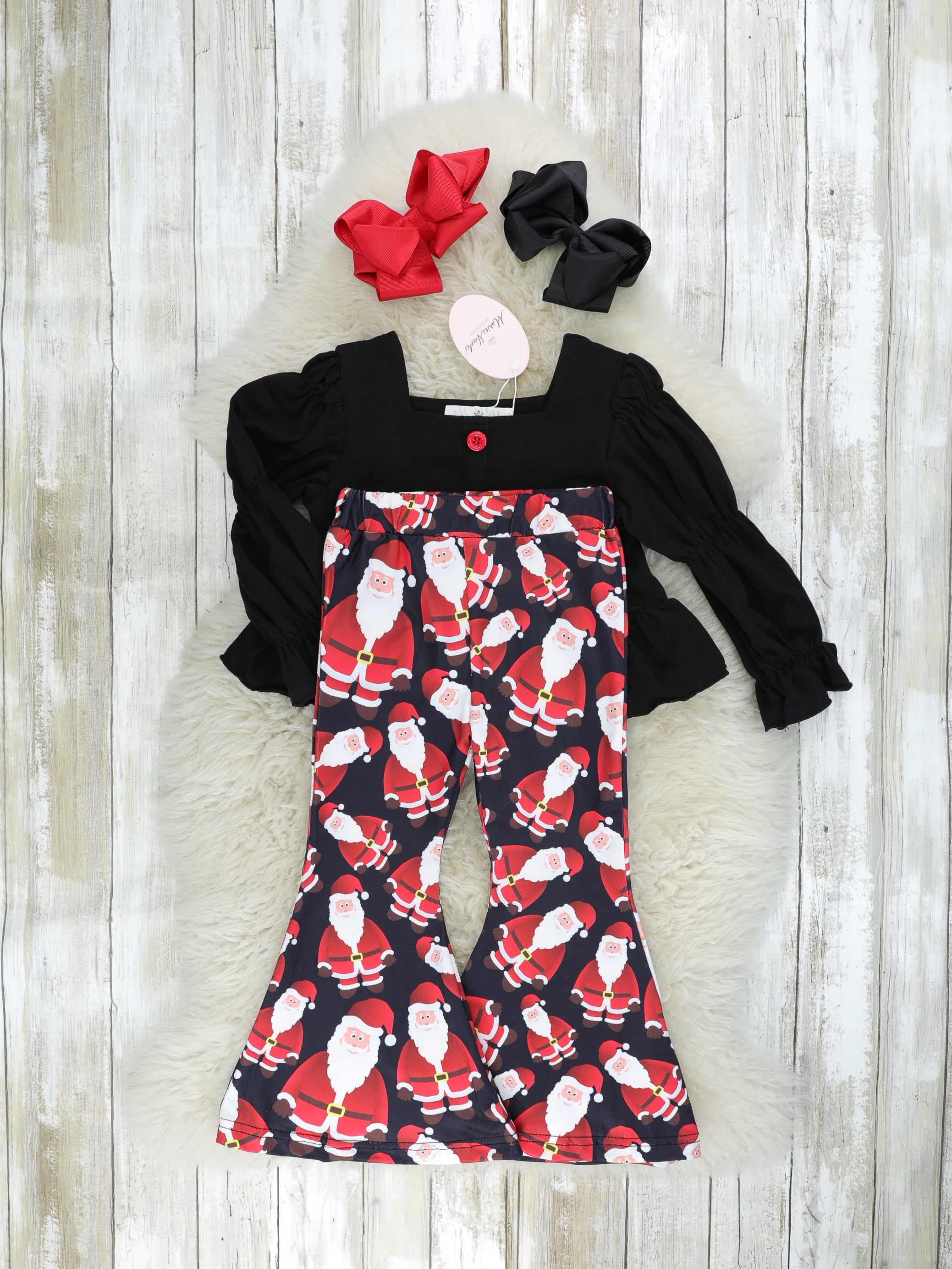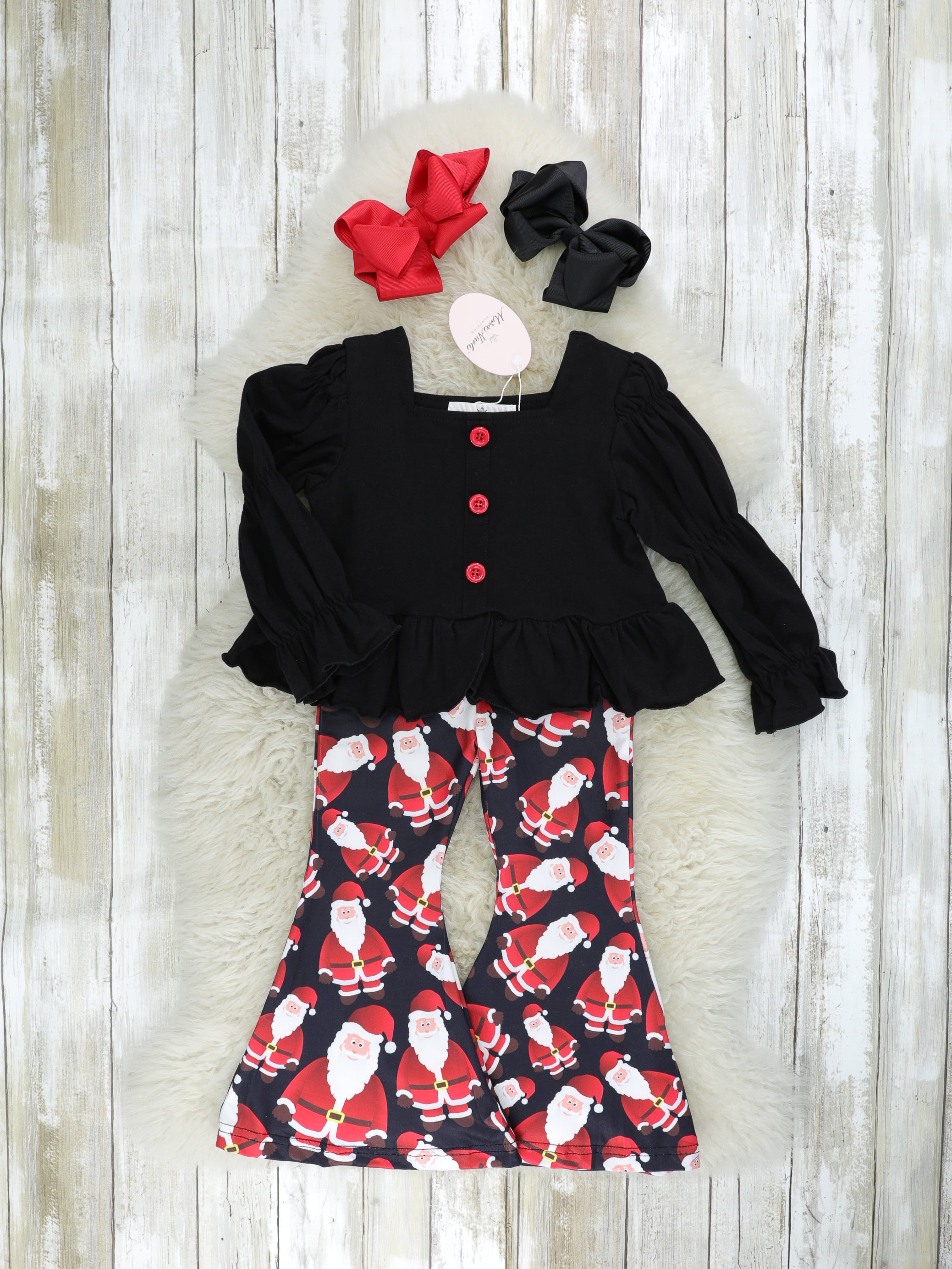 Sink your Claus into this charming outfit! This outfit features a black top with puff sleeves, ruffle trim, decorative buttons, & Santa bell bottoms.