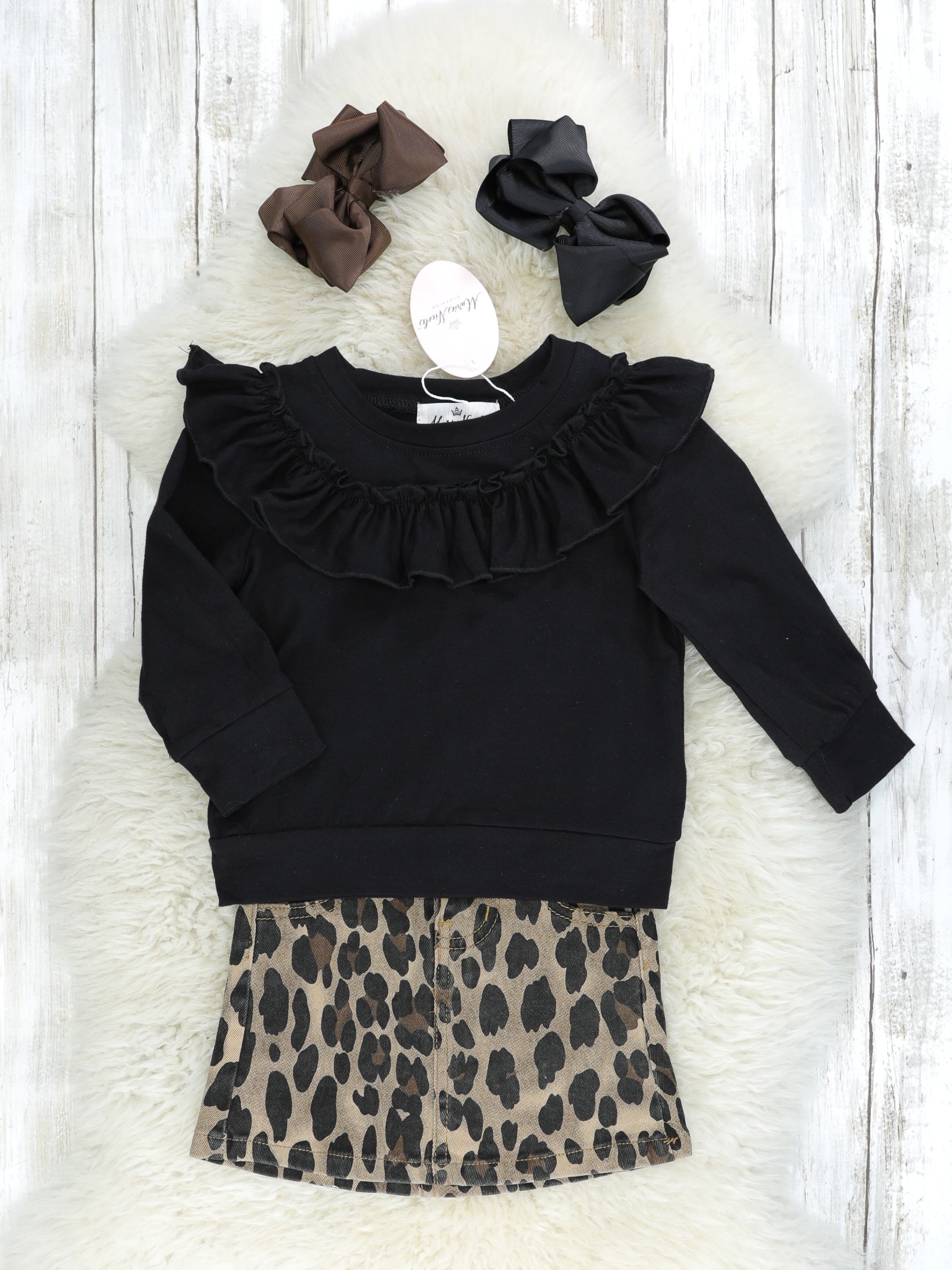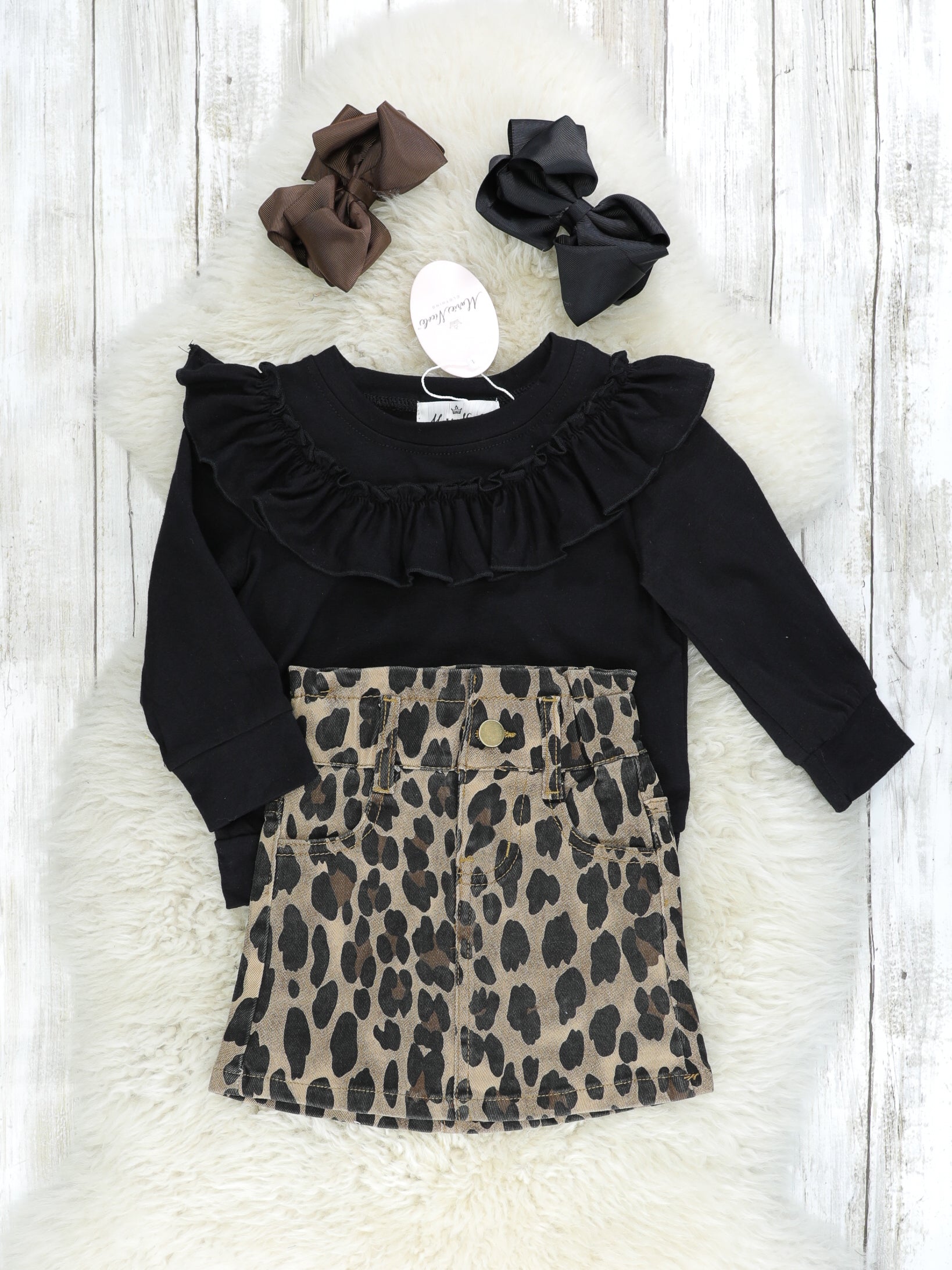 A darling outfit for your leopard lovers! This outfit features a black top with flutter trim & leopard denim skirt.