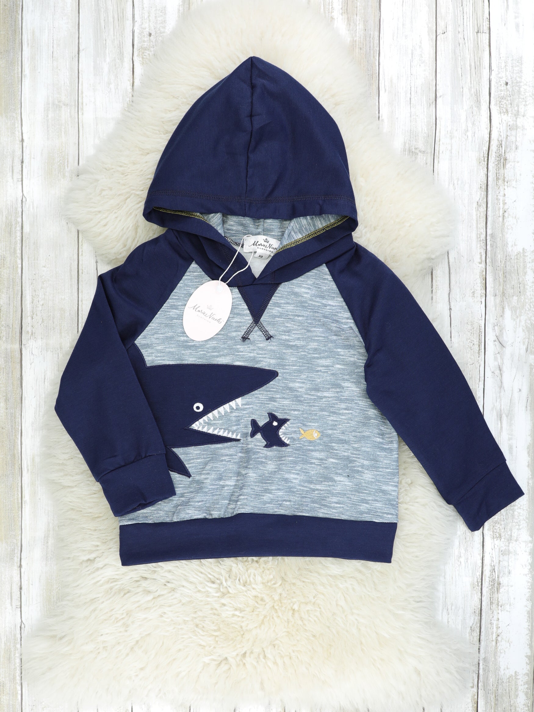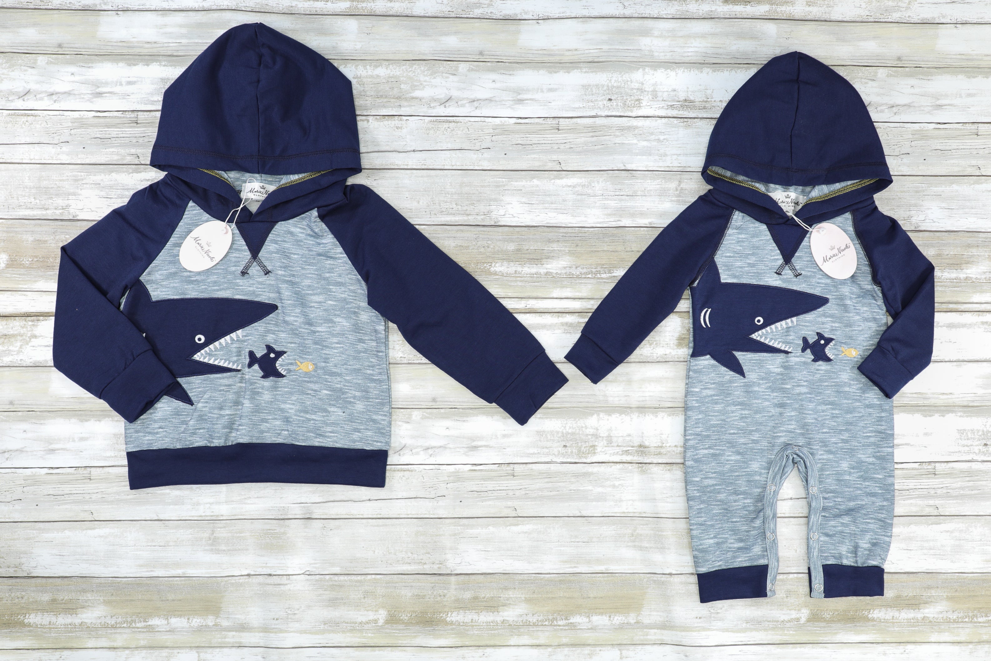 This adorable brother set is absolutely FINtastic! This hoodie features a shark food chain appliqué & black raglan sleeves.