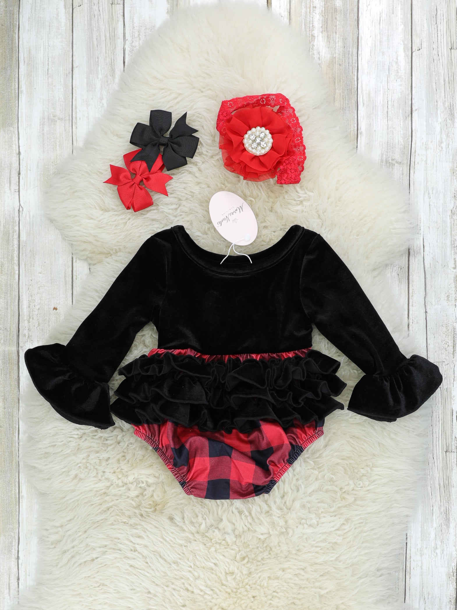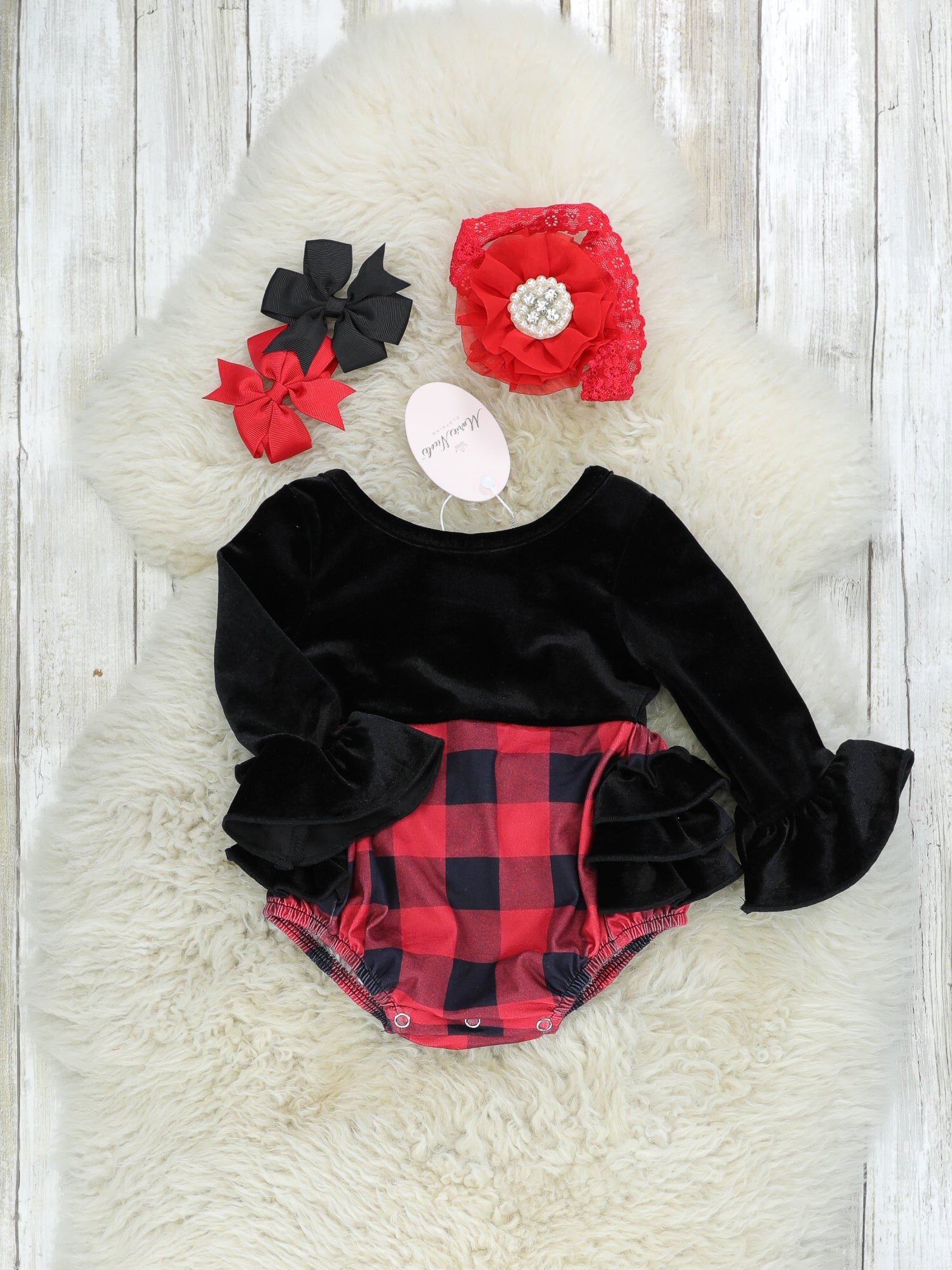The perfect sister set for Winter pictures! This velvet romper features bell sleeves, the sweetest ruffle butt, & buffalo plaid.