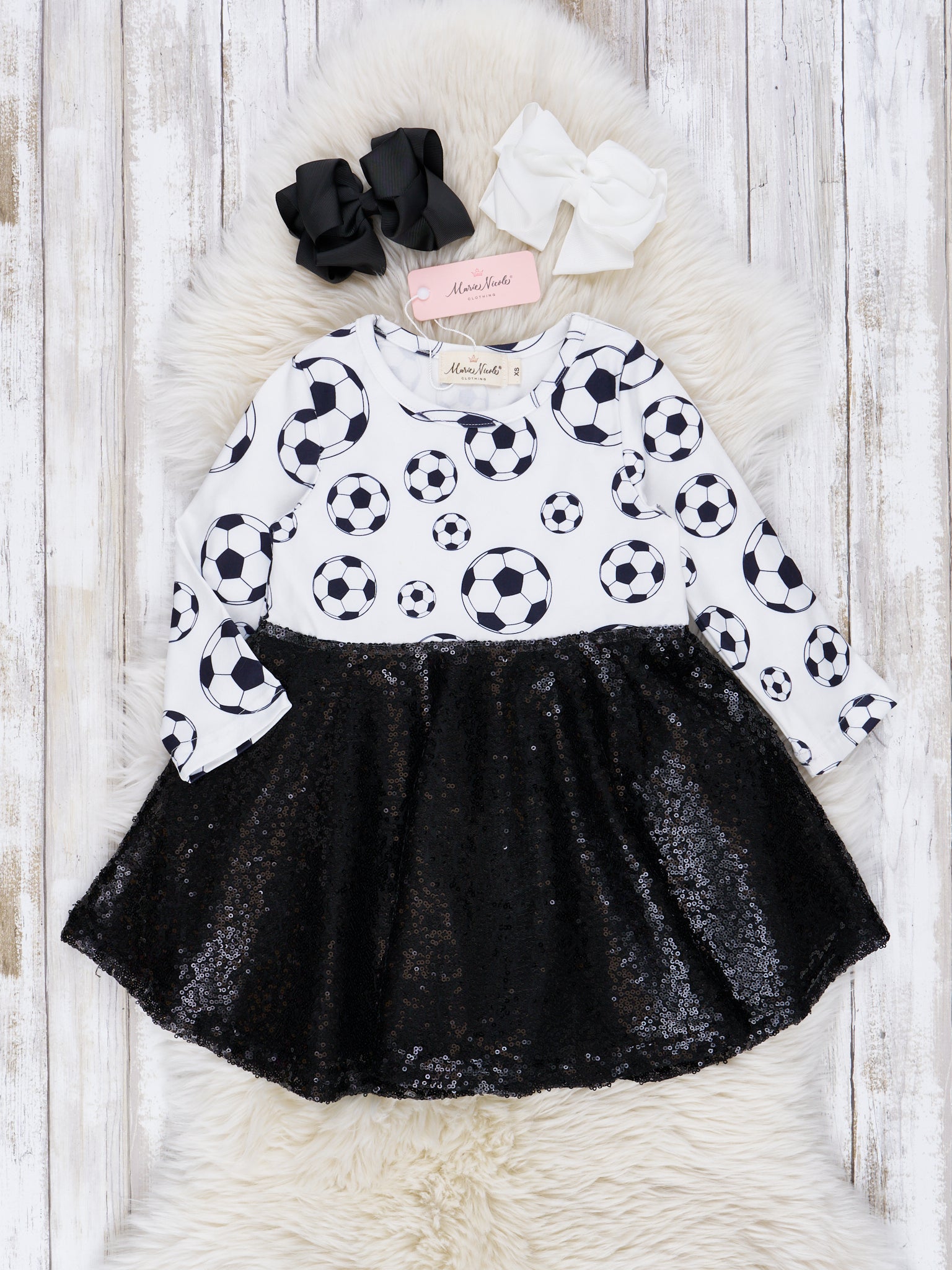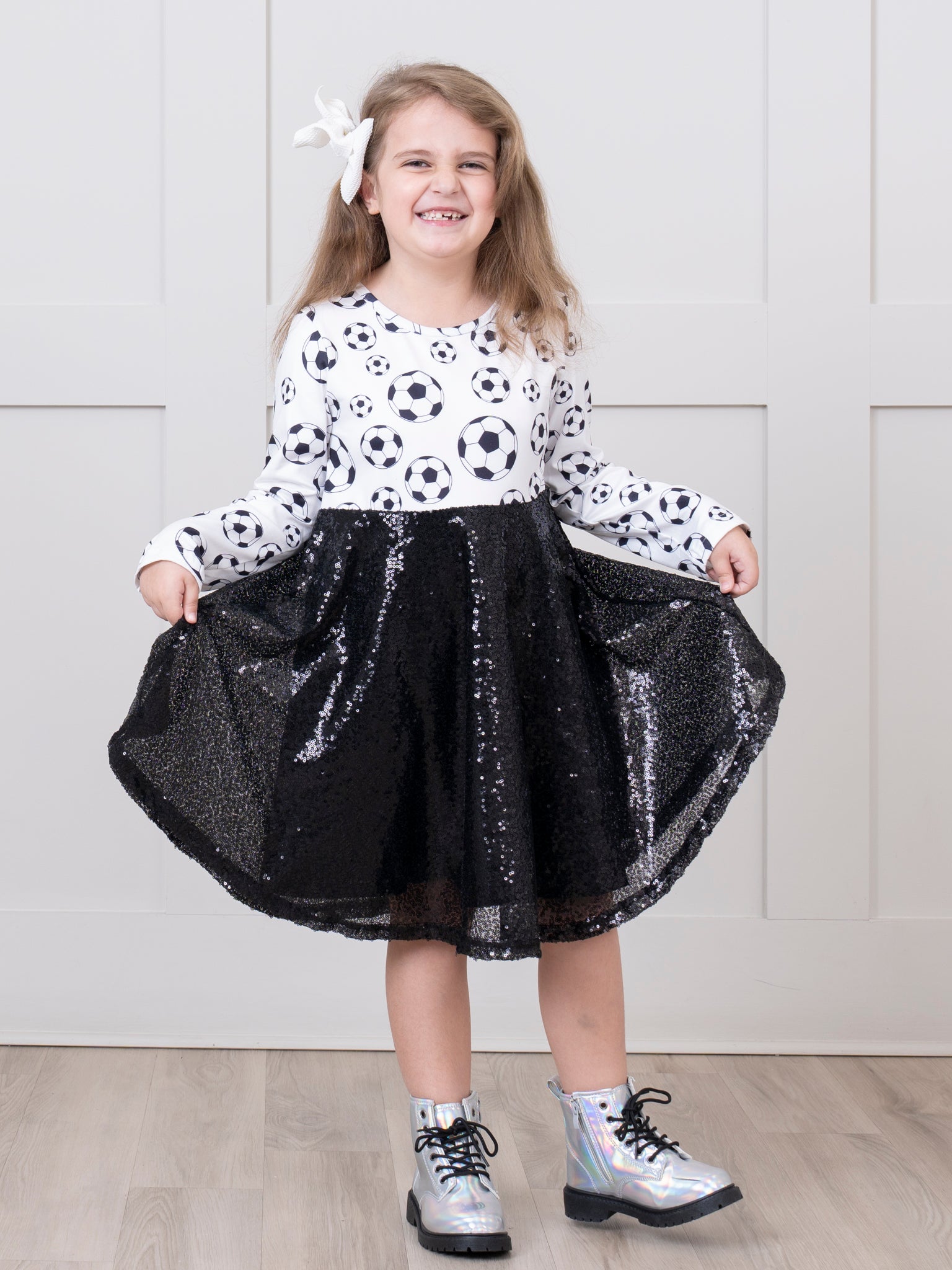 Kick it up a notch in this groovy Black & White Soccer Sequin Swing Dress! With an eye-catching black sequin skirt and soccer details, this sassy number guarantees she'll be the MVP of the party! The long-sleeved design makes sure she's always ready to do a victory dance in style. Get ready to score some serious fashion goals!