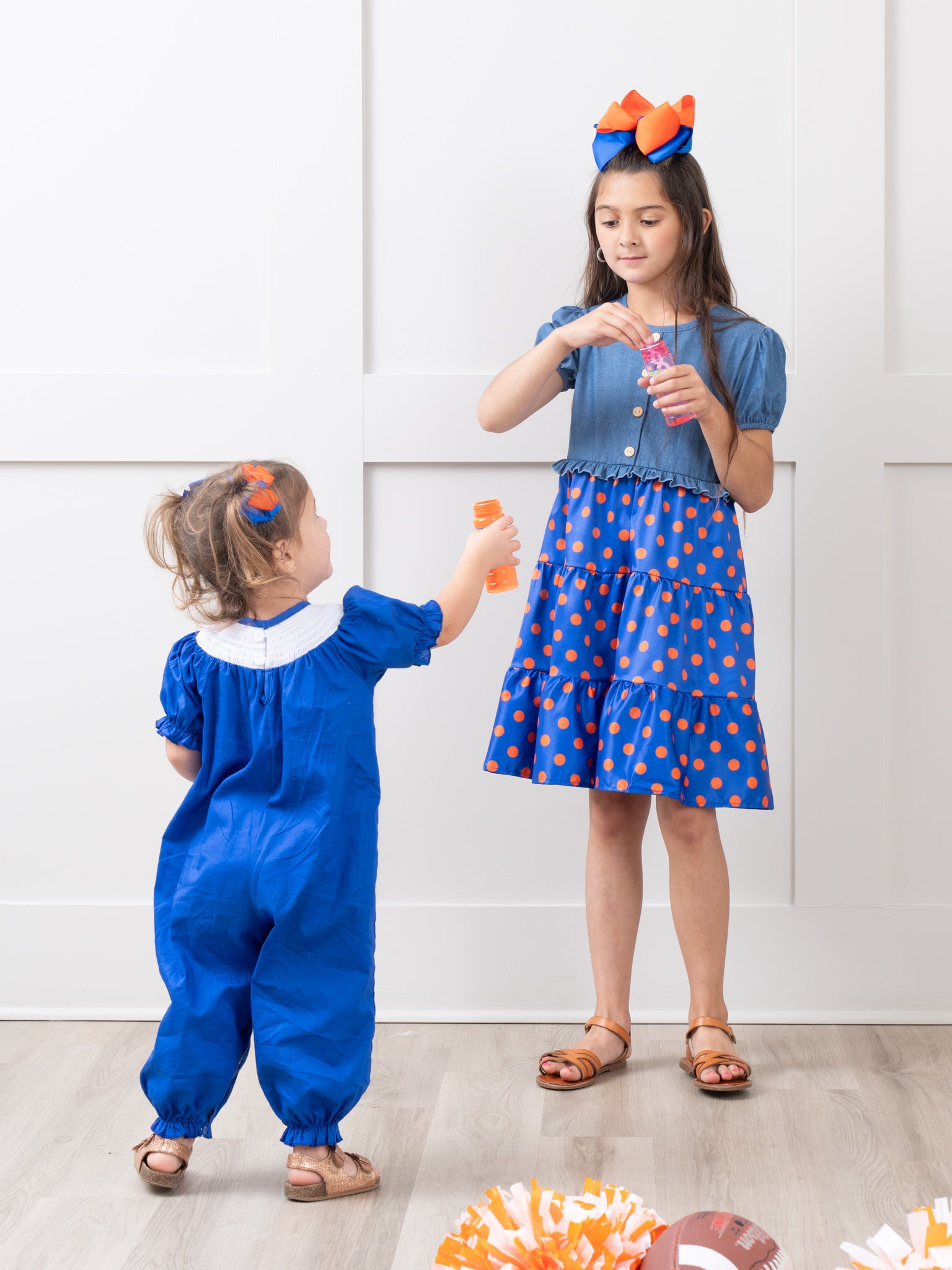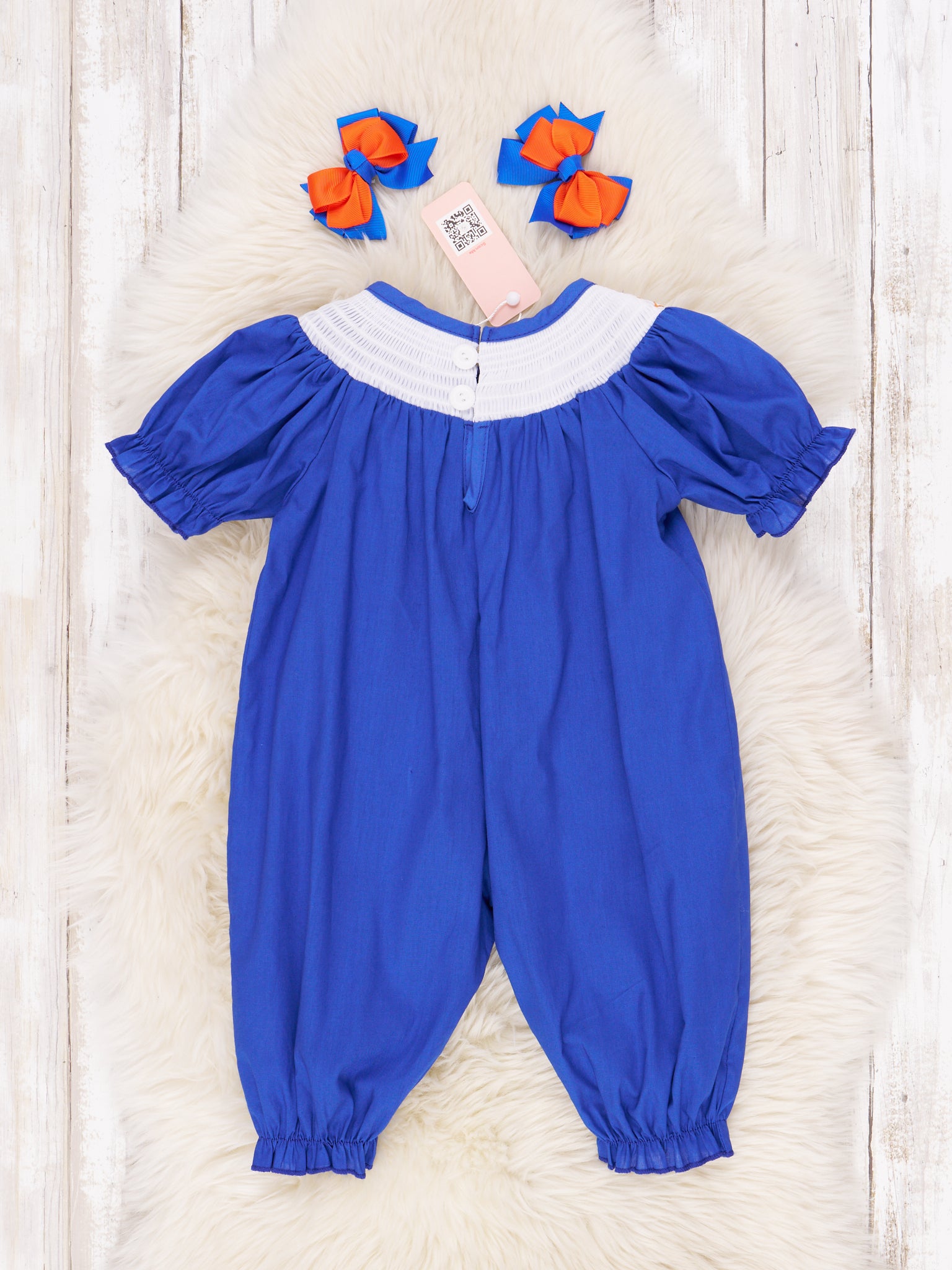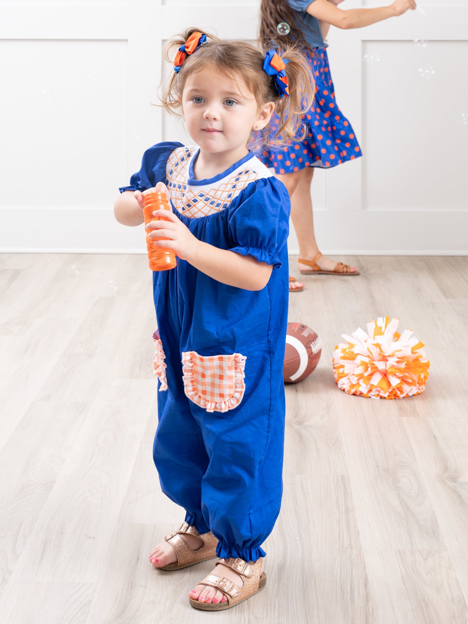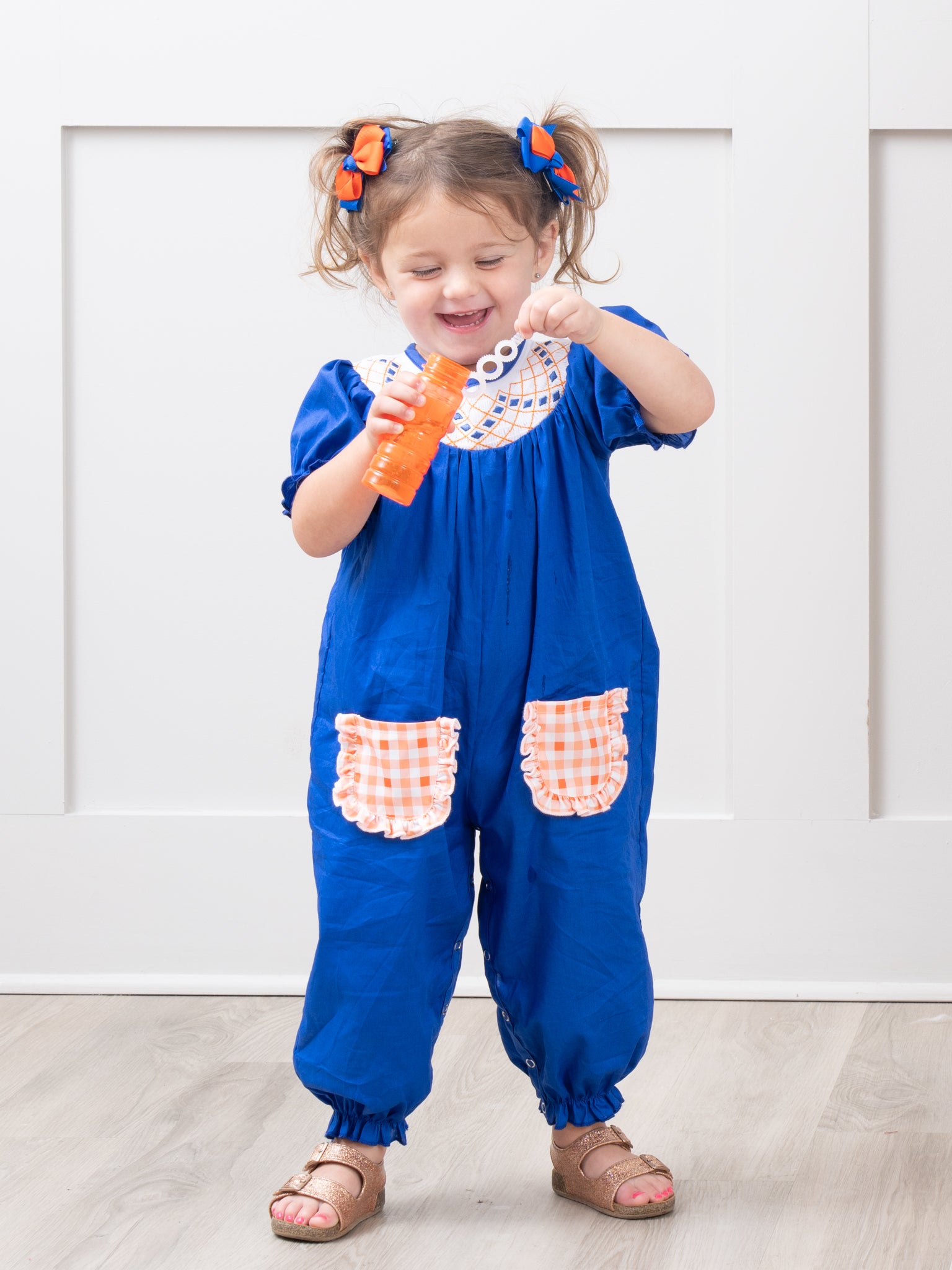 Stay stylish with this family-friendly collegiate set! Our Blue & Orange Romper comes in a fresh gingham design and is perfect for any family outing. Get your matching set now and show your sports-themed pride!