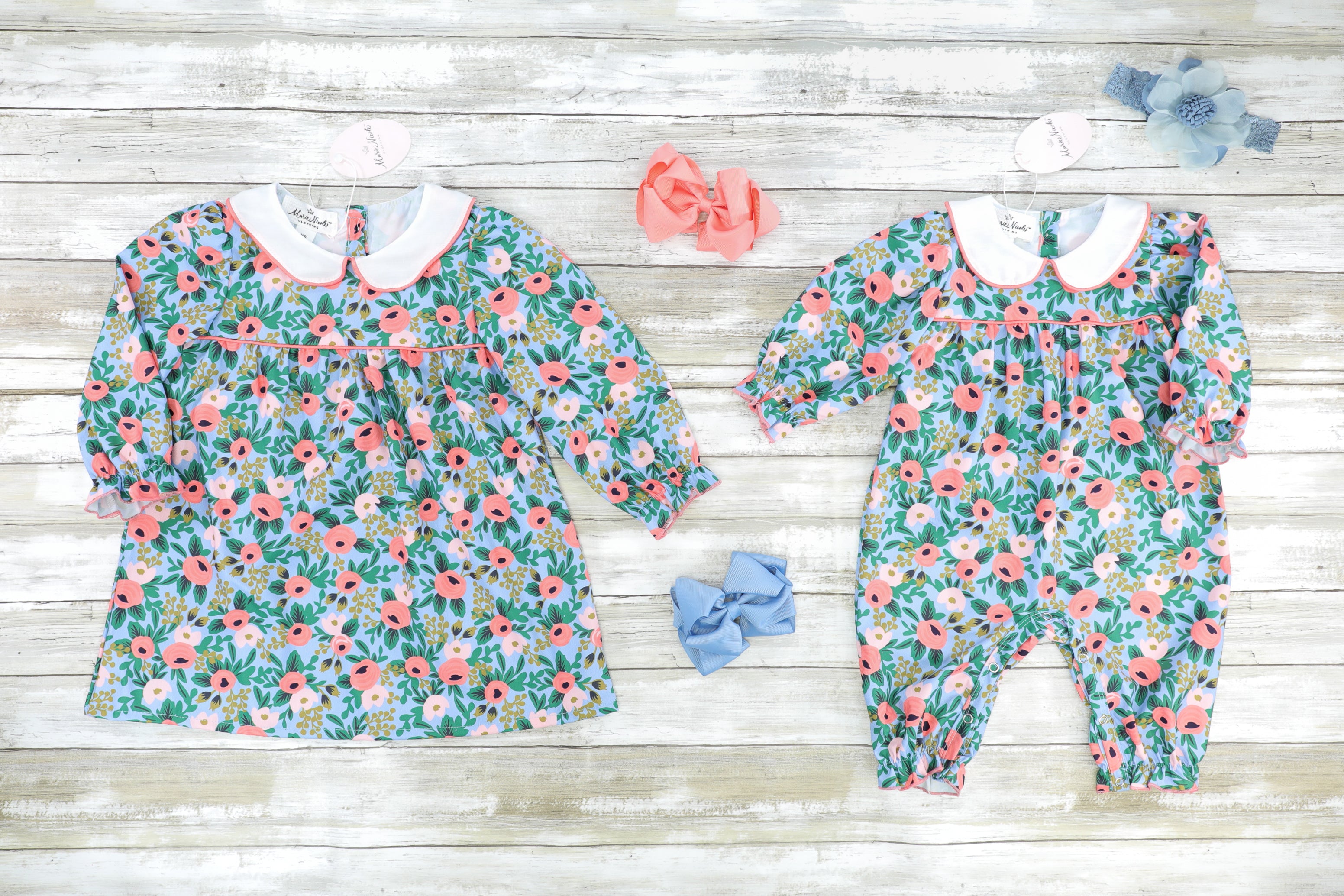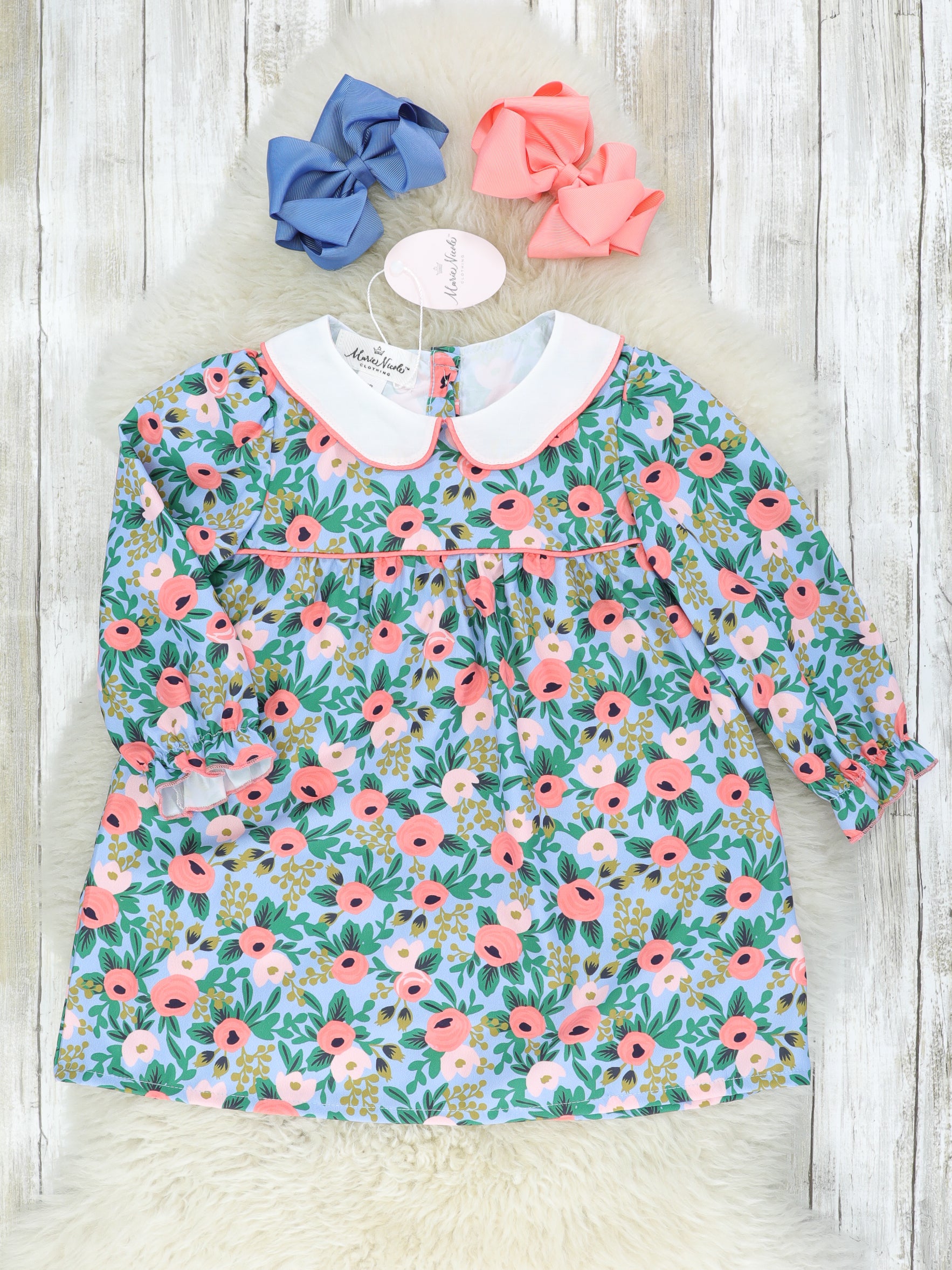 A darling sister set for your girls who shine in bright colors! This dress features stunning florals, a peter pan collar, & cinches at the wrists.