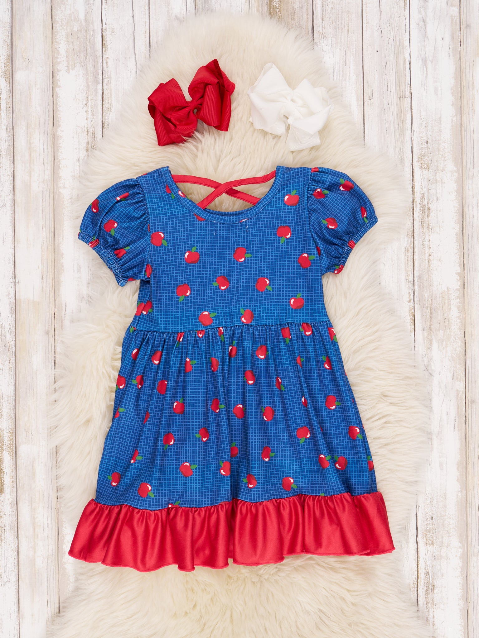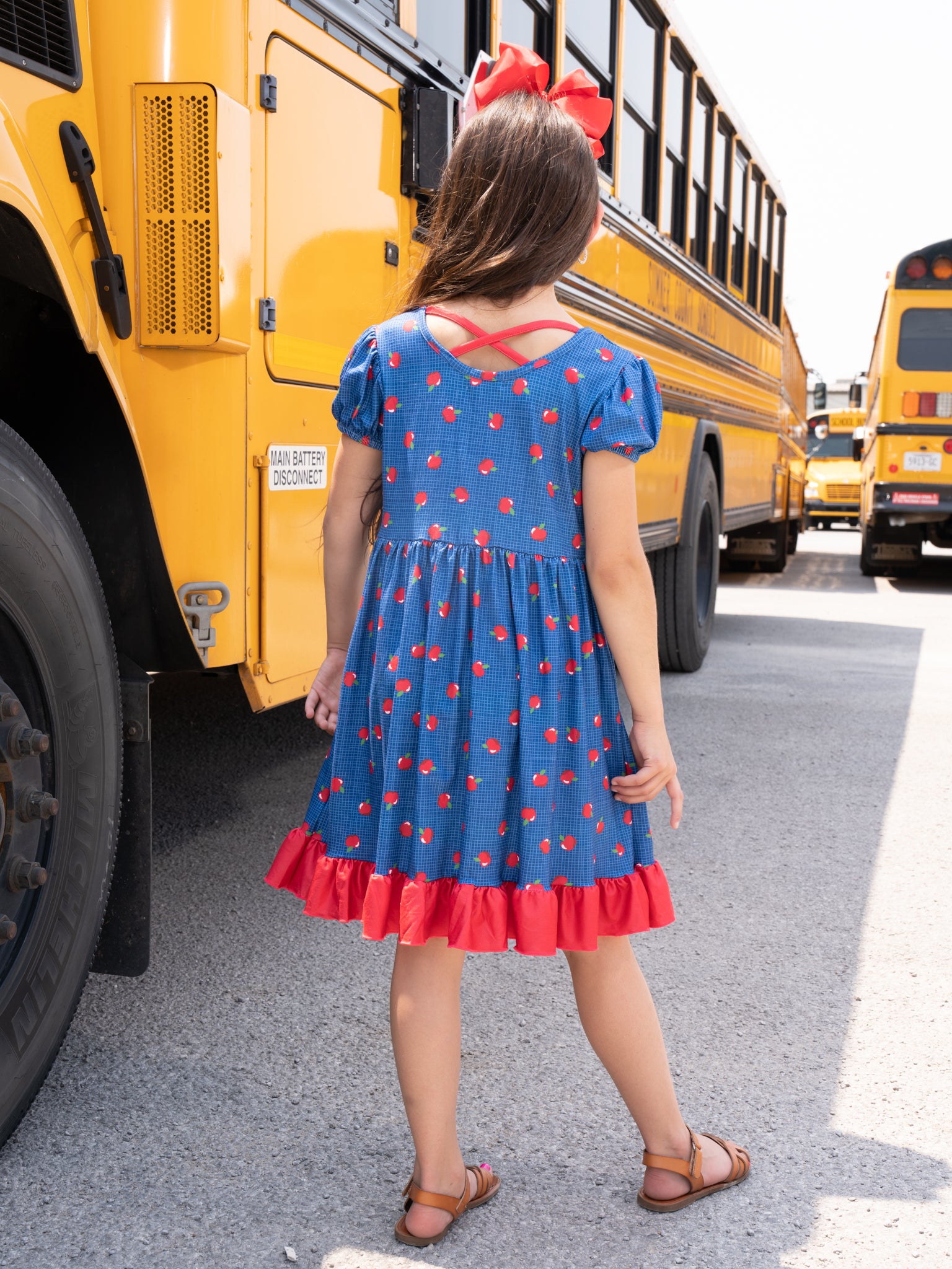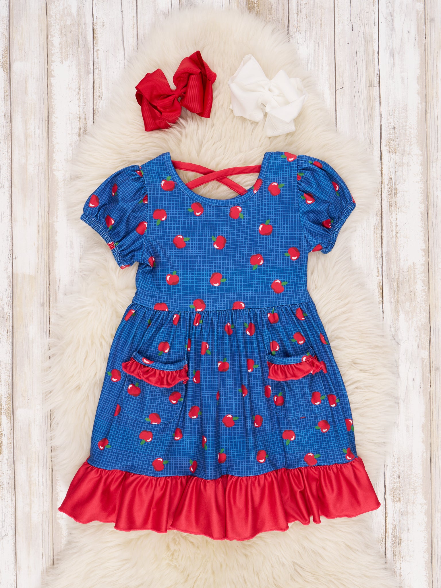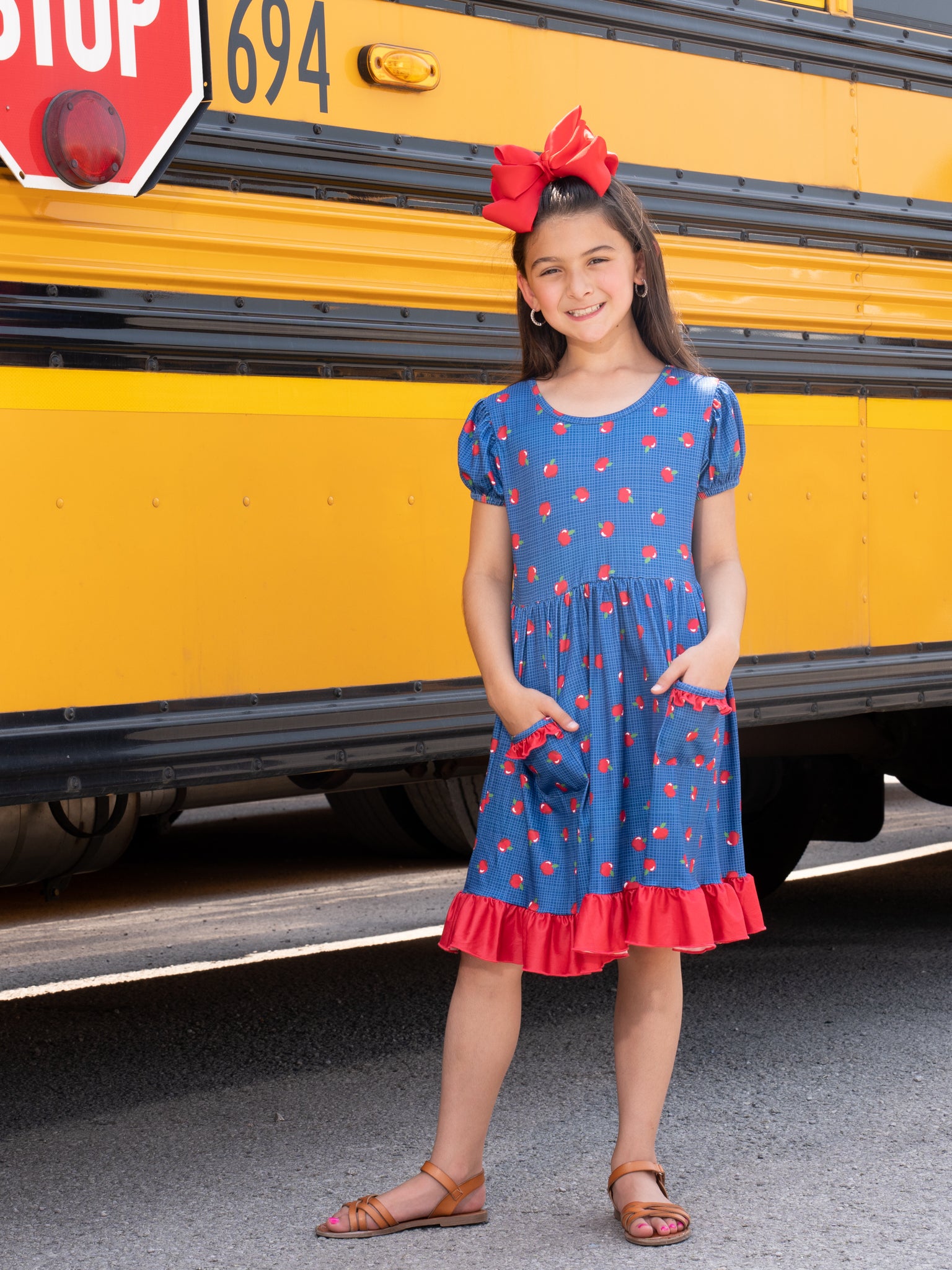 Let your little one dress to impress with the Blue & Red Apple Pocket Ruffle Dress - the perfect pick for fashion-forward kiddos! This adorable ribbed dress features stylish blue tones, red apple accents, and many ruffles!
