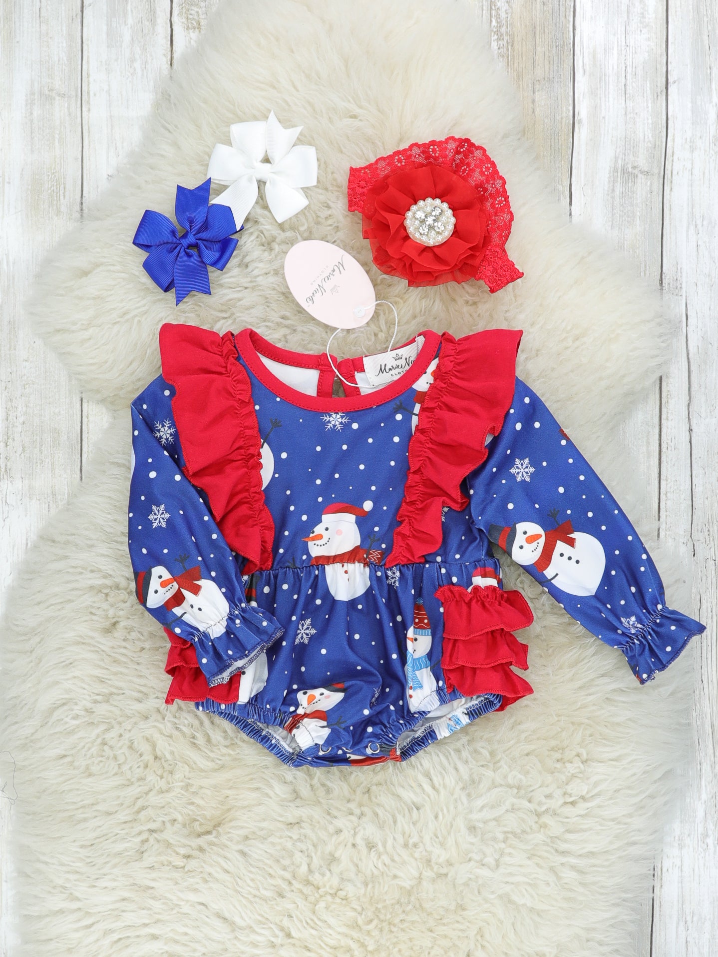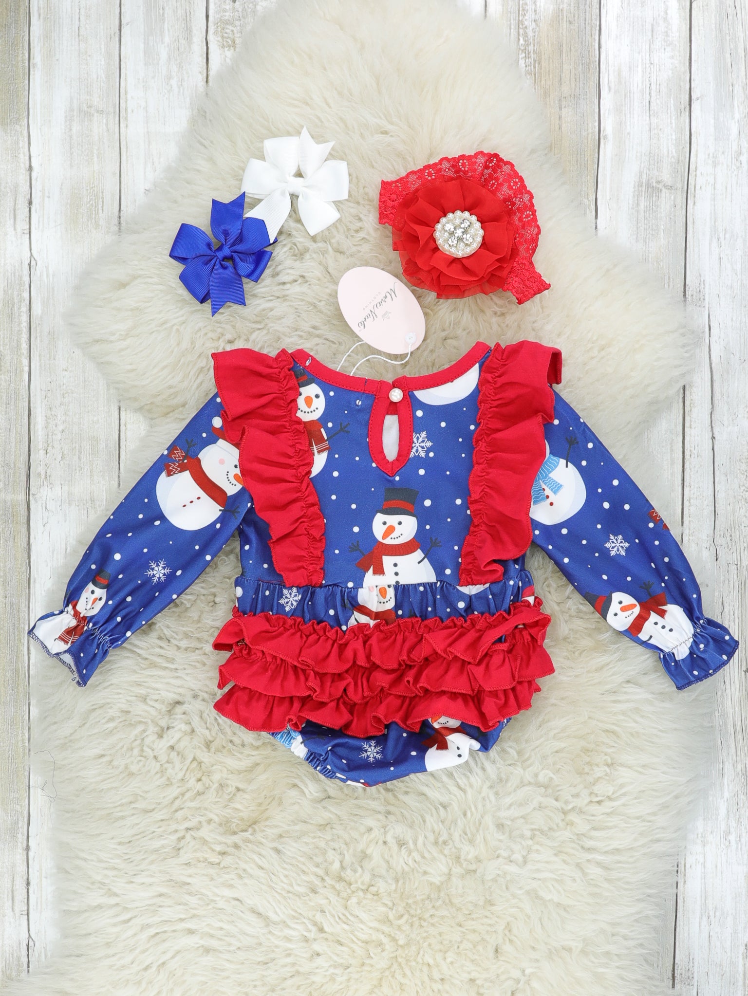 This adorable romper is SNOW very cute! This blue romper features snowman & snowflake details with red ruffle trim.