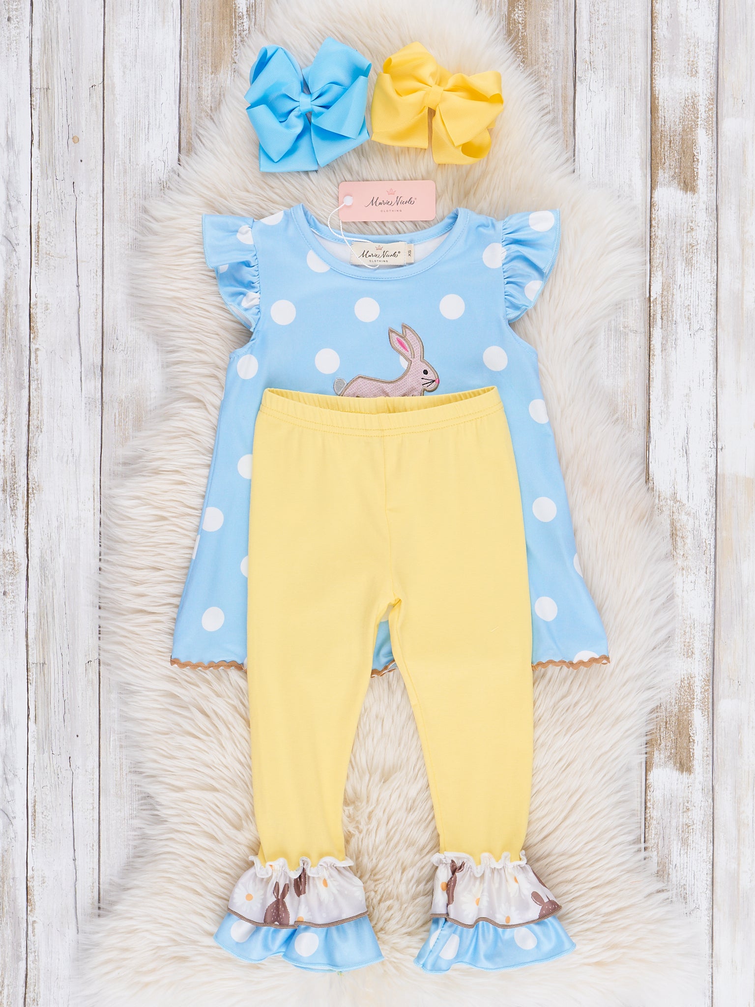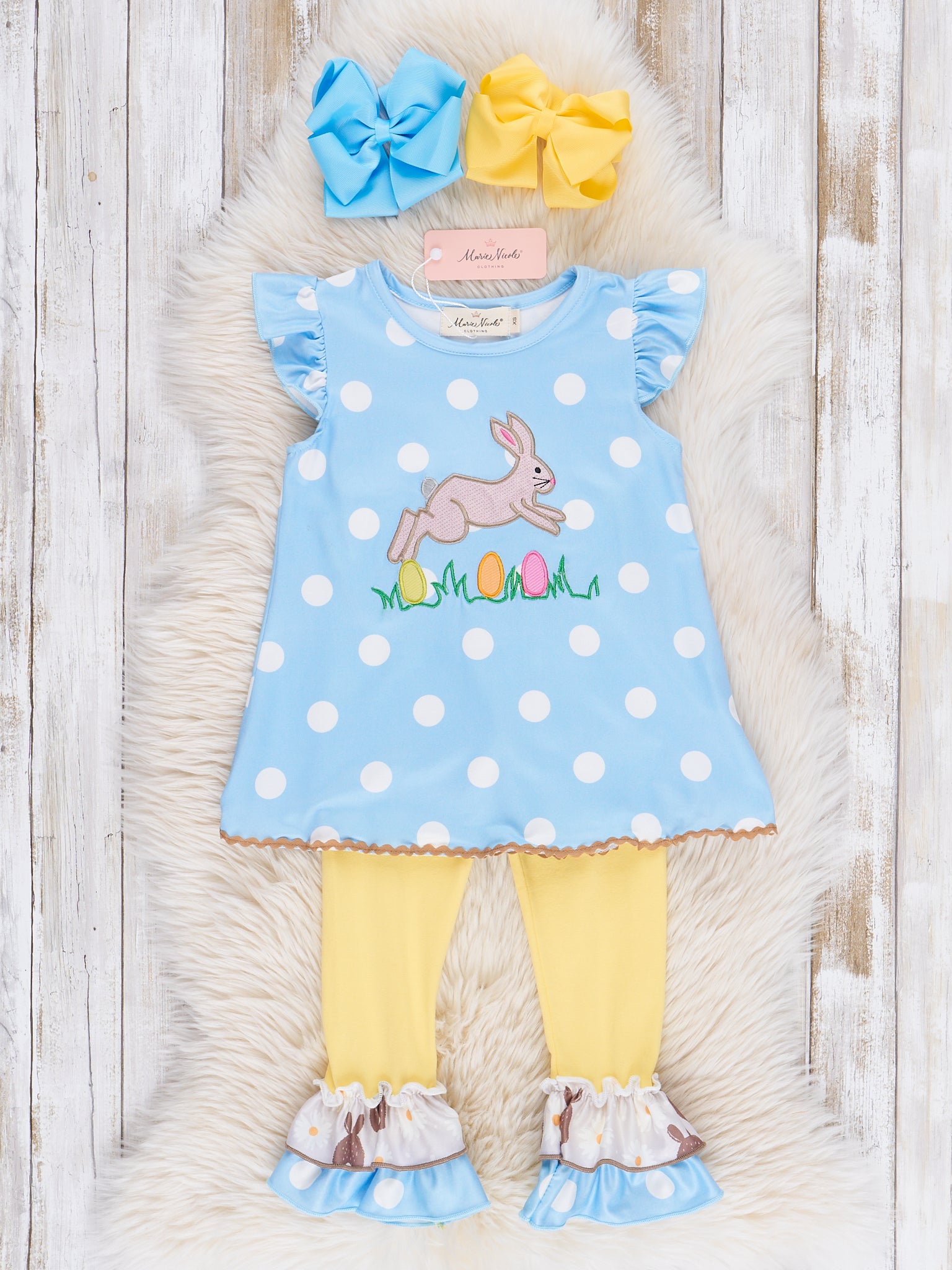 Be the cutest bunny in town with our Blue Bunny Hop outfit by Marie Nicole Clothing! This girls' outfit is perfect for spring and Easter, featuring a blue polka dot top with an embroidered bunny hopping through a field of Easter eggs. Complete the look with the included yellow leggings with ruffle ankles. Don't forget to check out our sibling set options!