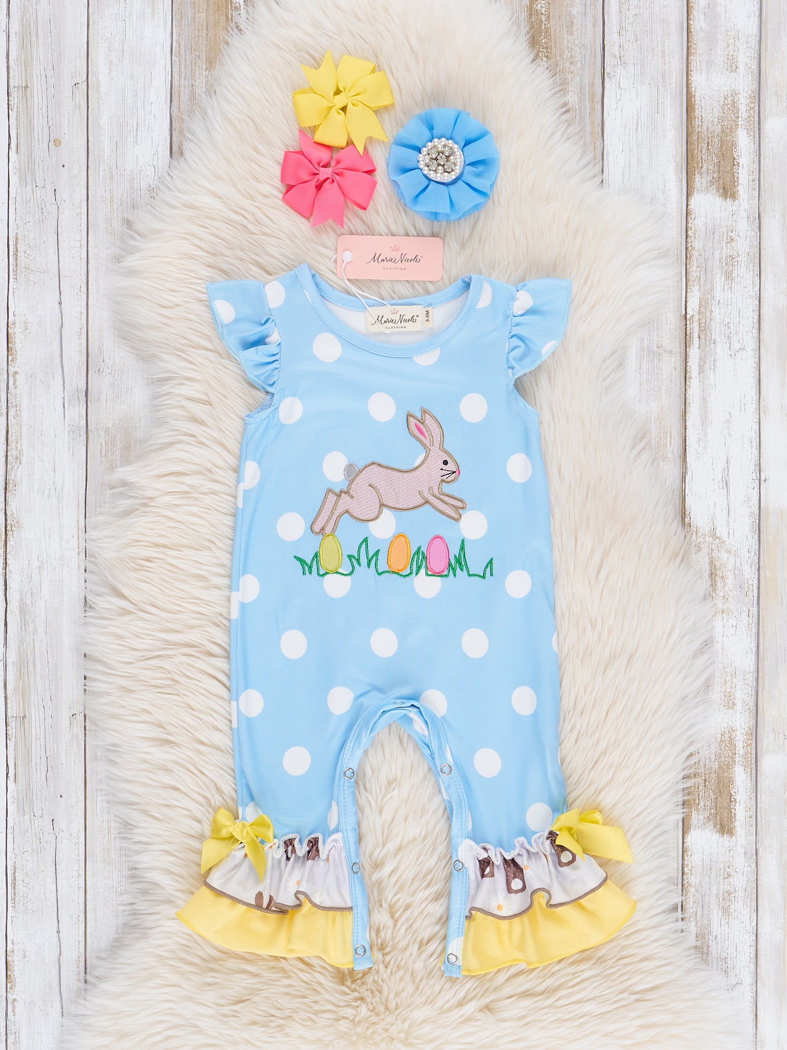 Be the cutest bunny in town with our Blue Bunny Hop Ruffle Romper by Marie Nicole Clothing! This girls' romper is perfect for spring and Easter, featuring a blue polka dot bodice with an embroidered bunny hopping through a field of Easter eggs. The look is completed with the yellow ruffle ankles. Don't forget to check out our sibling set options!