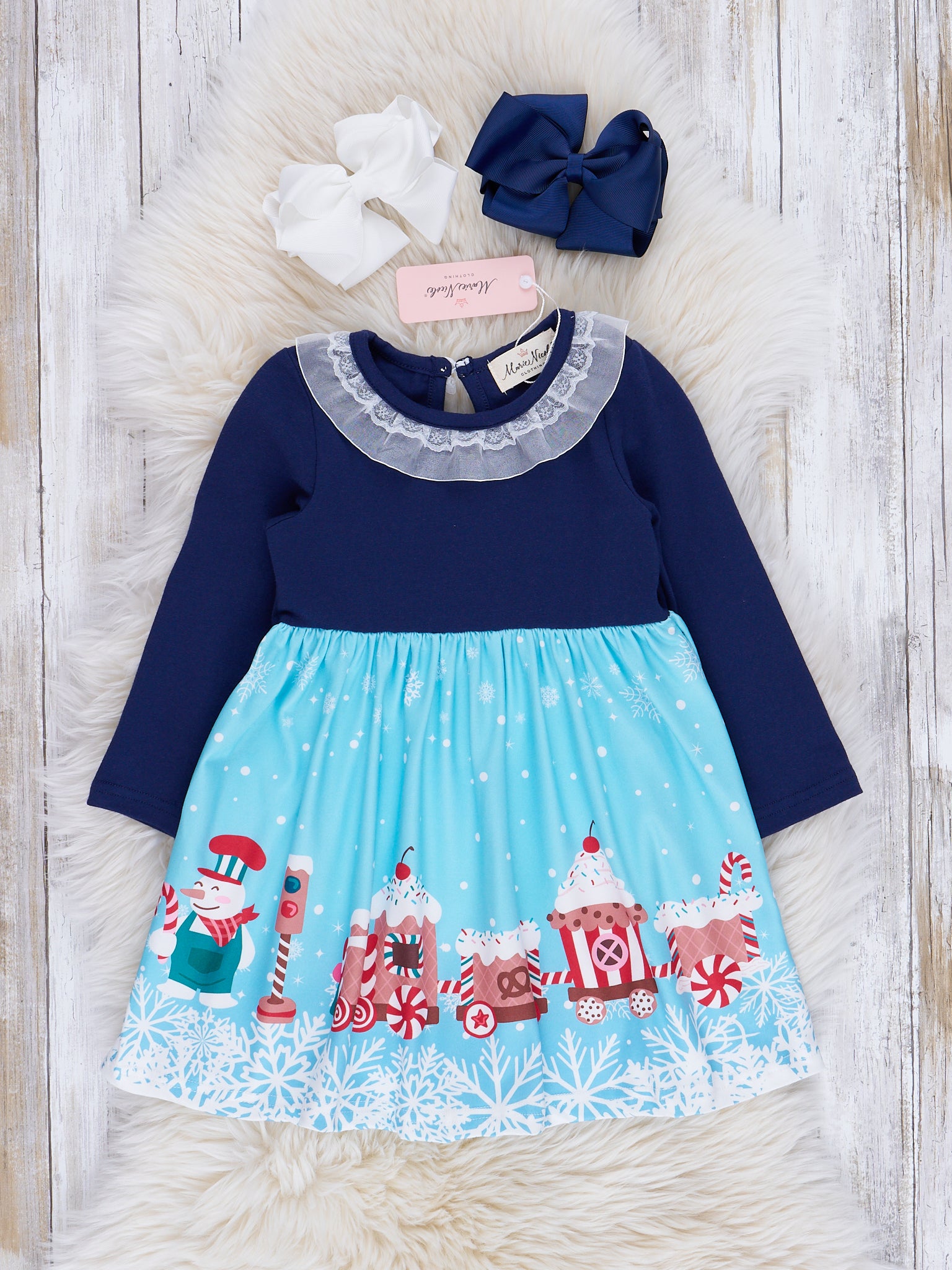 Introducing our Cocoa Express Dress – where a blue bodice meets a light blue skirt, adorned with a charming hot cocoa train print for a journey of sweetness and style! 🚂☕💙