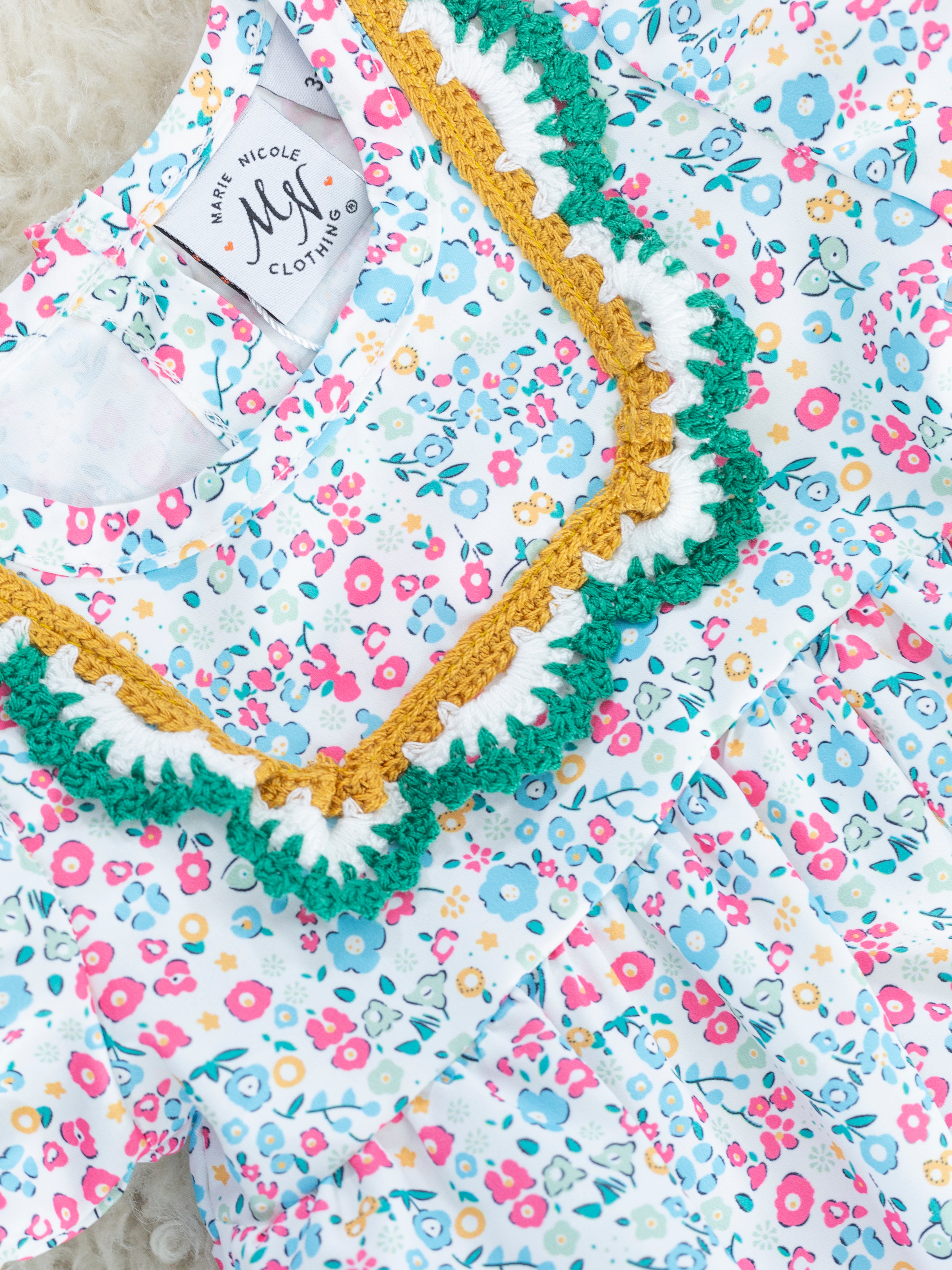 gorgeous sister set for your little flowers! This bubble features blue ditsy florals, crochet trim, & buttons at the nape of the neck for easy changing.