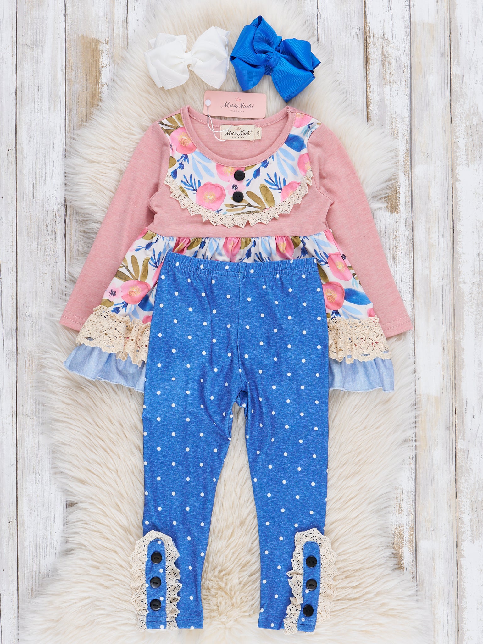 Get ready for some double the fun with our Blue Dots & Pink Florals sister set! This outfit features a mix of playful floral and polka dot prints in charming shades of pink and blue. Girls will love the ruffled detailing, while parents will appreciate the convenience of a coordinated set. Twirl your way into style with this delightful outfit!