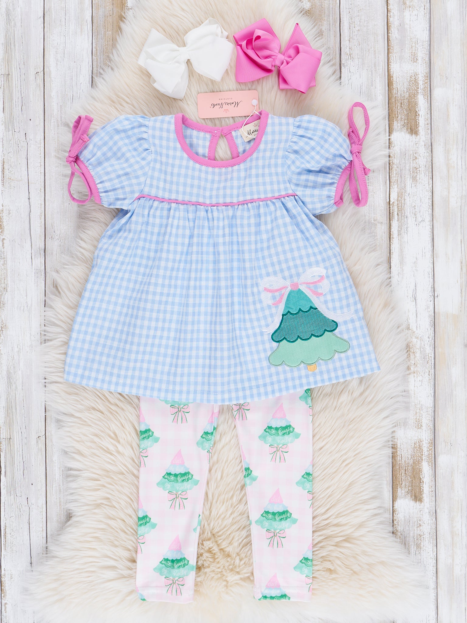 Get your little girl in the holiday spirit with this playful Blue Gingham Christmas Tree Bubble! The blue gingham top with pink accents add a touch of quirky charm, while the embroidered Christmas paired with Christmas tree print leggings makes it extra festive. Don't forget to check out the matching sister set!