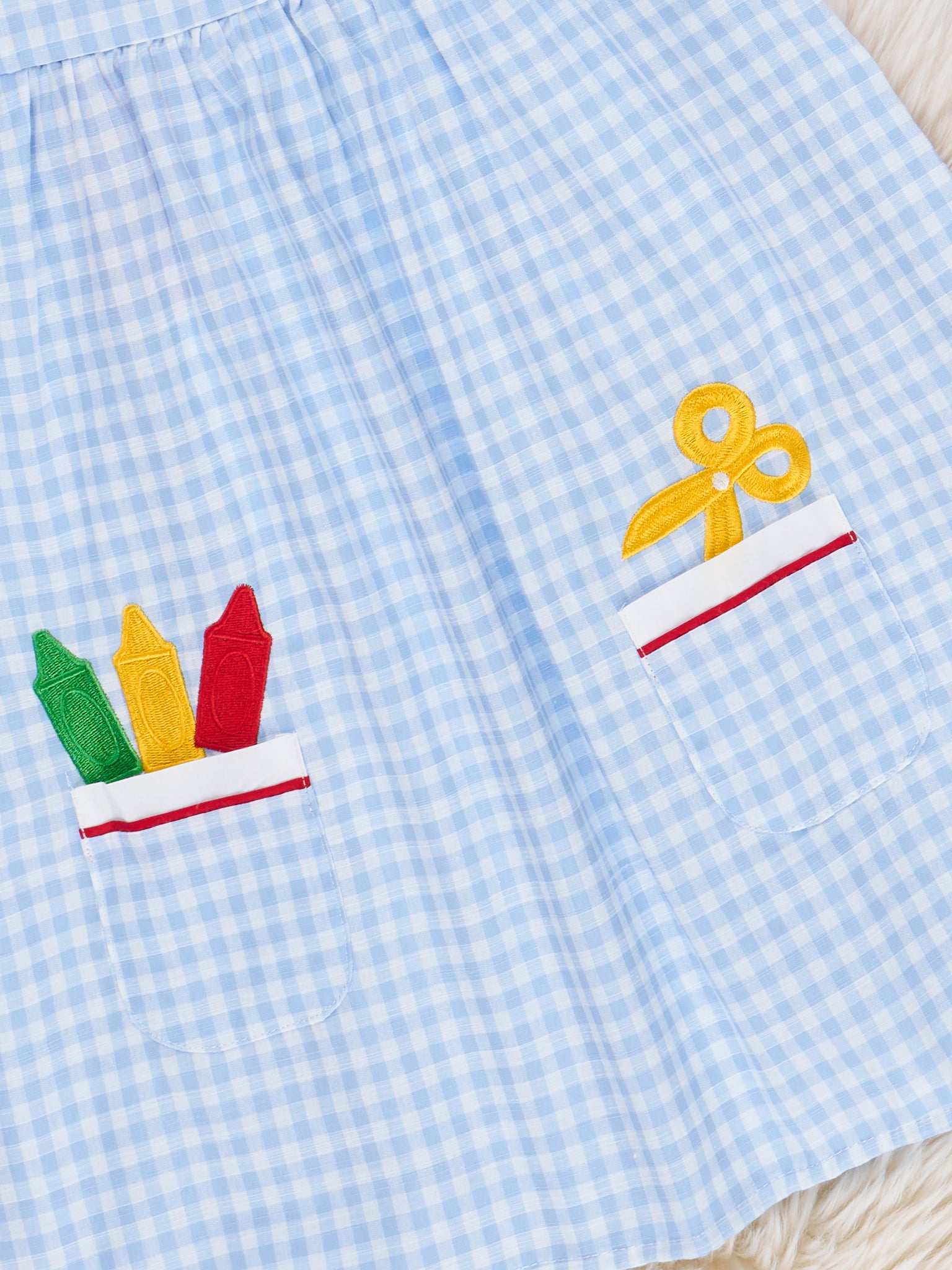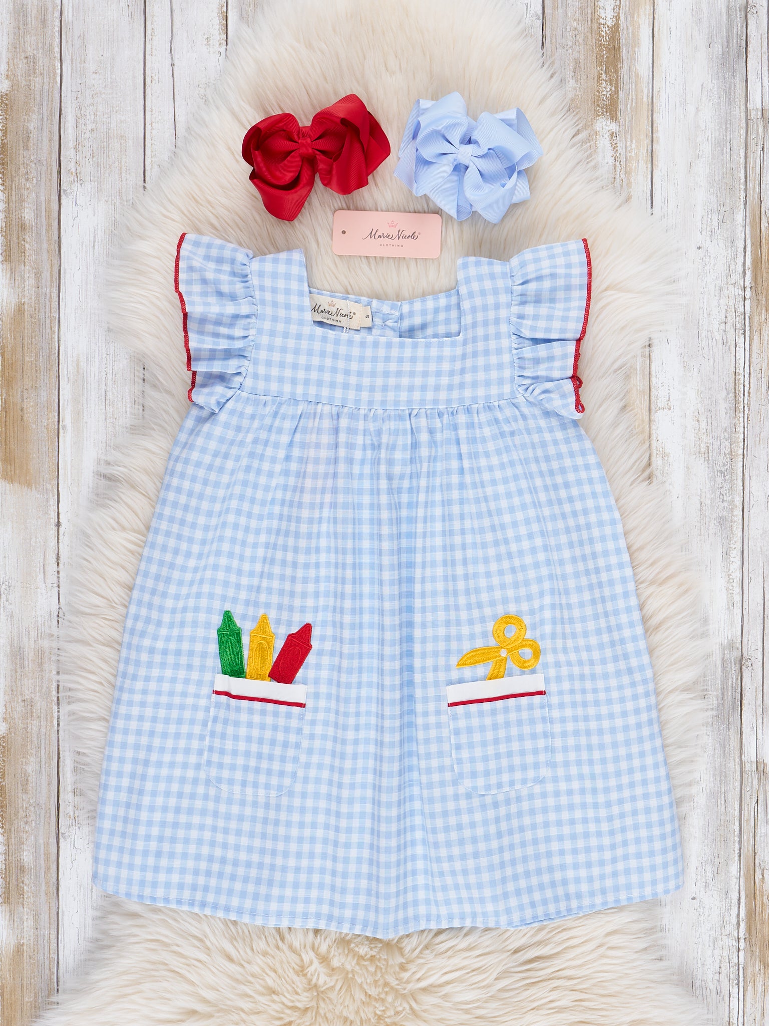Get your little ones ready for a new school year with this adorable sister set. The blue gingham dress features red trim ruffle sleeves and playful primary school supply embroidery, making your girl stand out in the classroom.