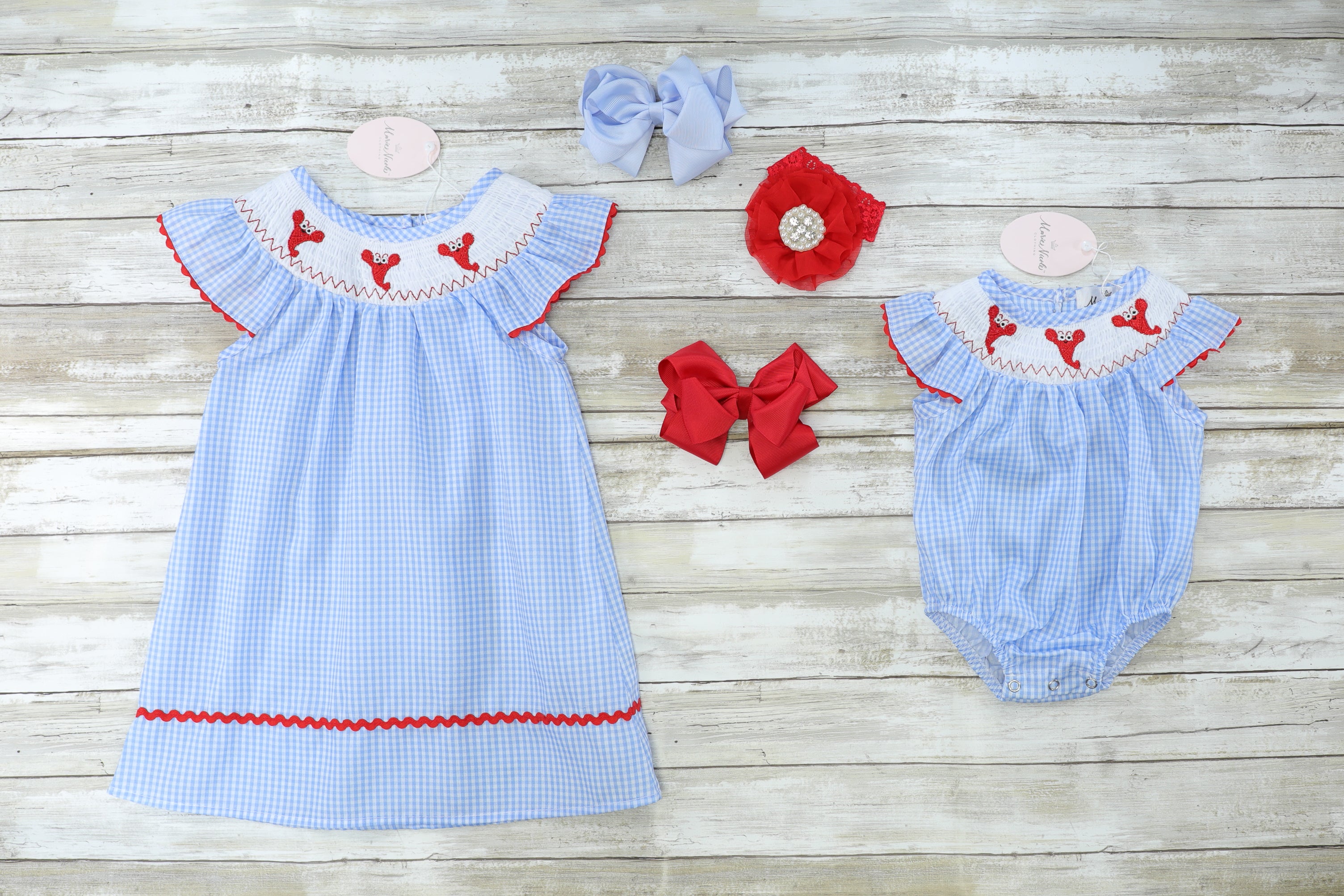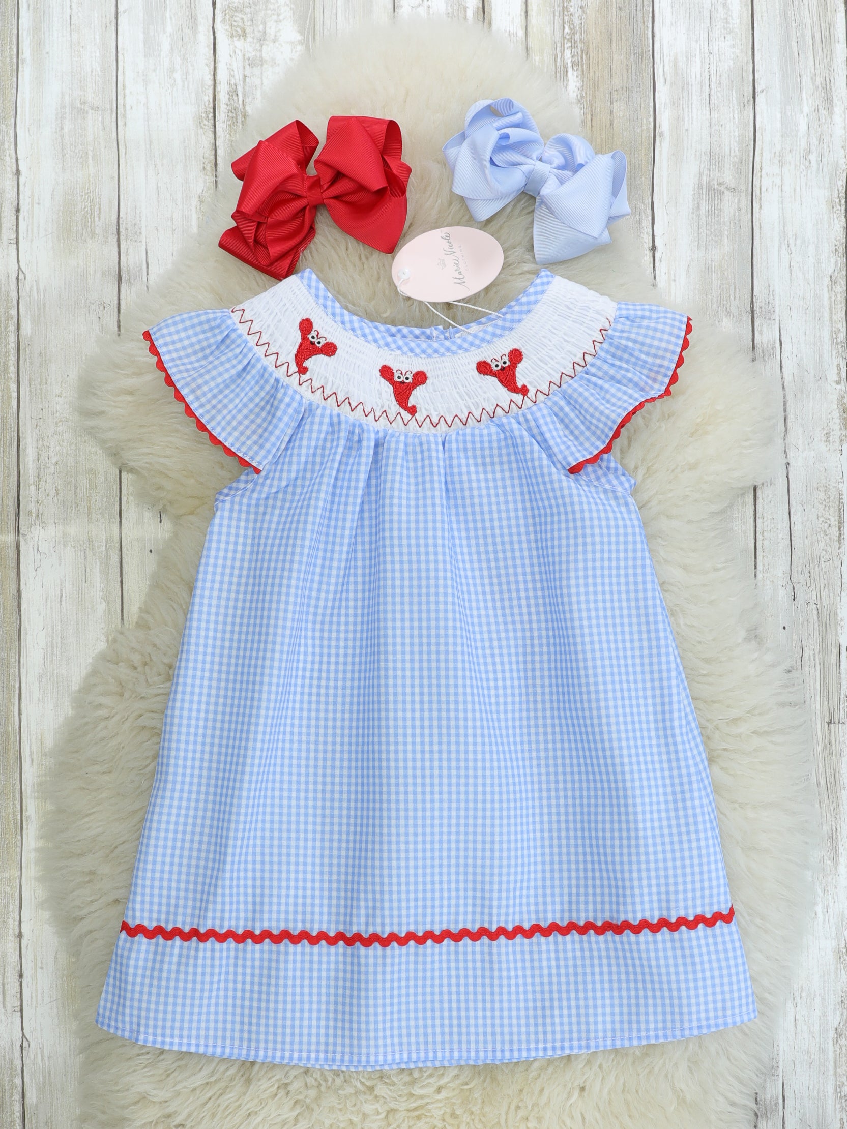 Lobsters don't share because they're SHELLFISH! Everyone in your group can wear one of these lobster smocked outfits. This sweet dress is blue gingham with embroidered lobsters on the smocked neckline.