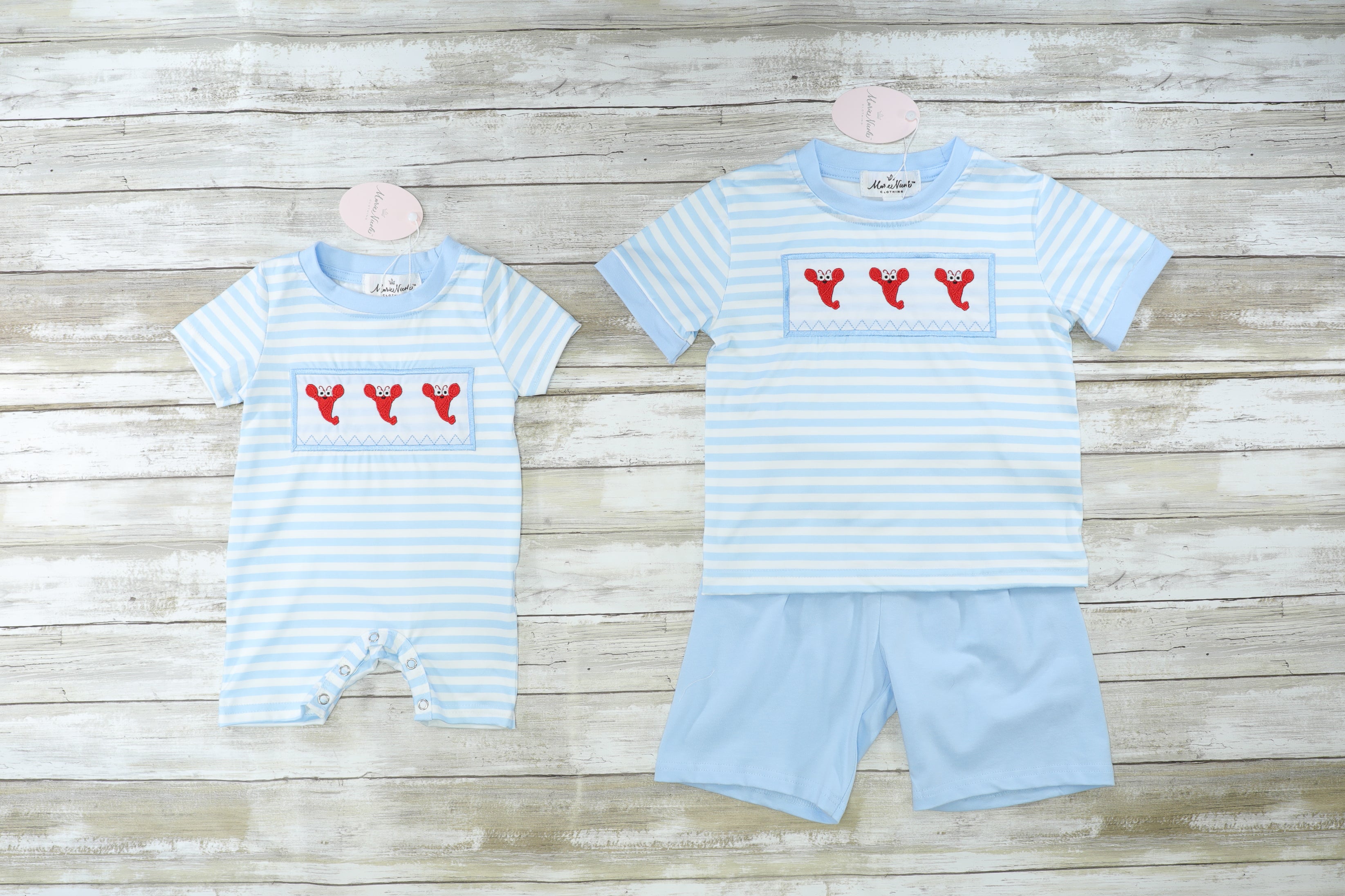 Lobsters don't share because they're SHELLFISH! Everyone in your group can wear one of these lobster smocked outfits. This sweet outfit is blue striped with a smocked lobster design.