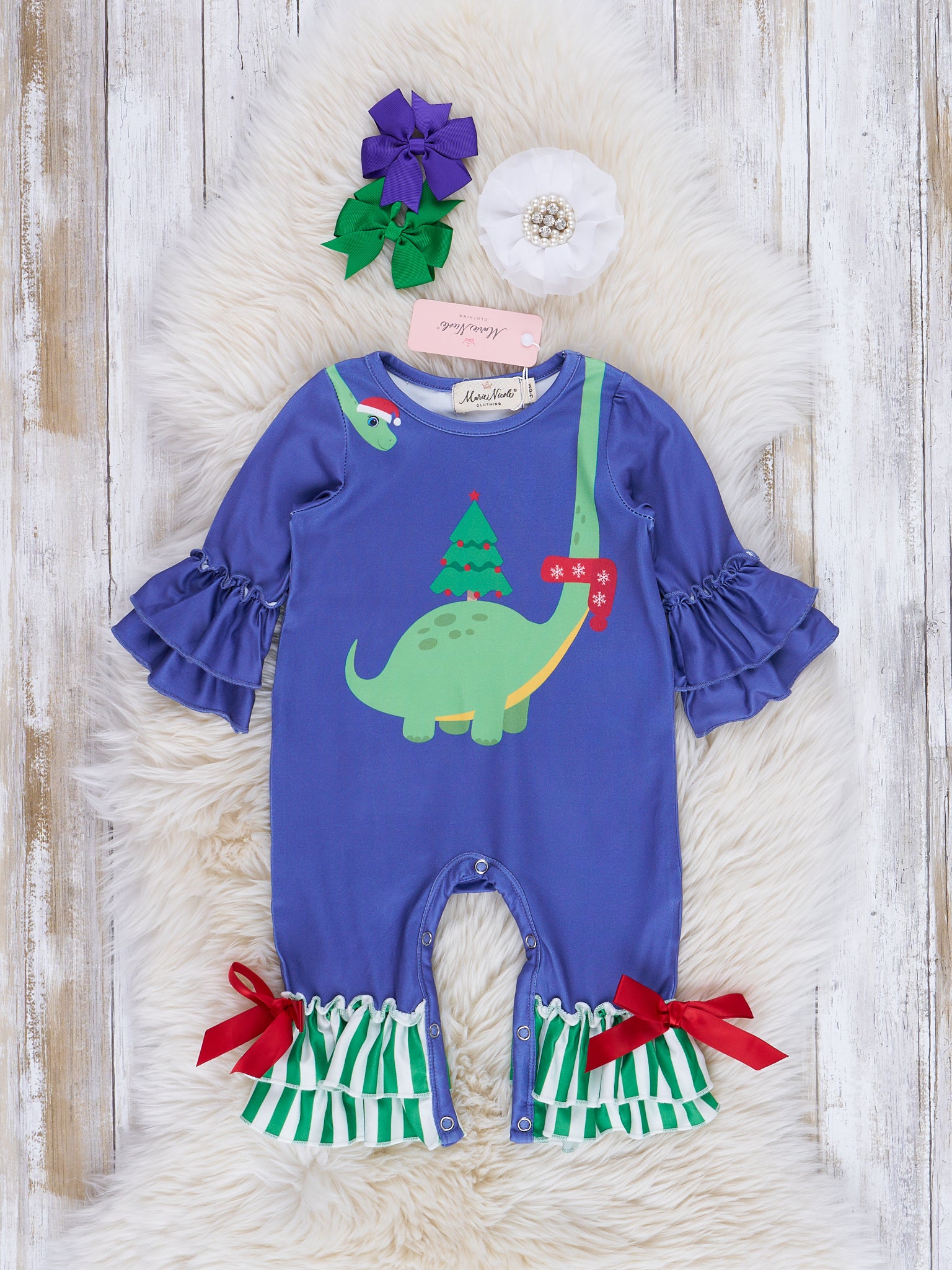 Blue & Green Holiday Dino Striped Ruffle Romper