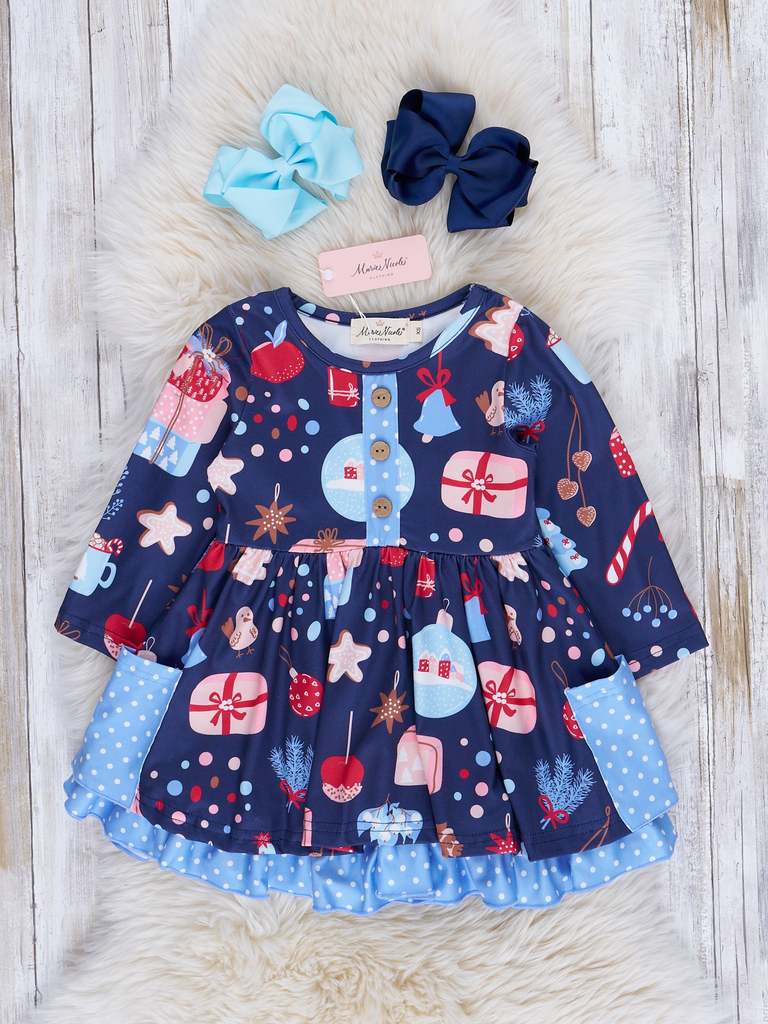 Adorned with subtle winter-themed accents, this sister set will bring a touch of magic to any holiday gathering. The delicate ruffles add a whimsical flair, making it a standout choice for your little fashionista. Whether she's unwrapping presents, posing for family photos, or simply enjoying the festive spirit, our Blue Joyful Holiday Ruffle Dress is the epitome of seasonal style and joy.