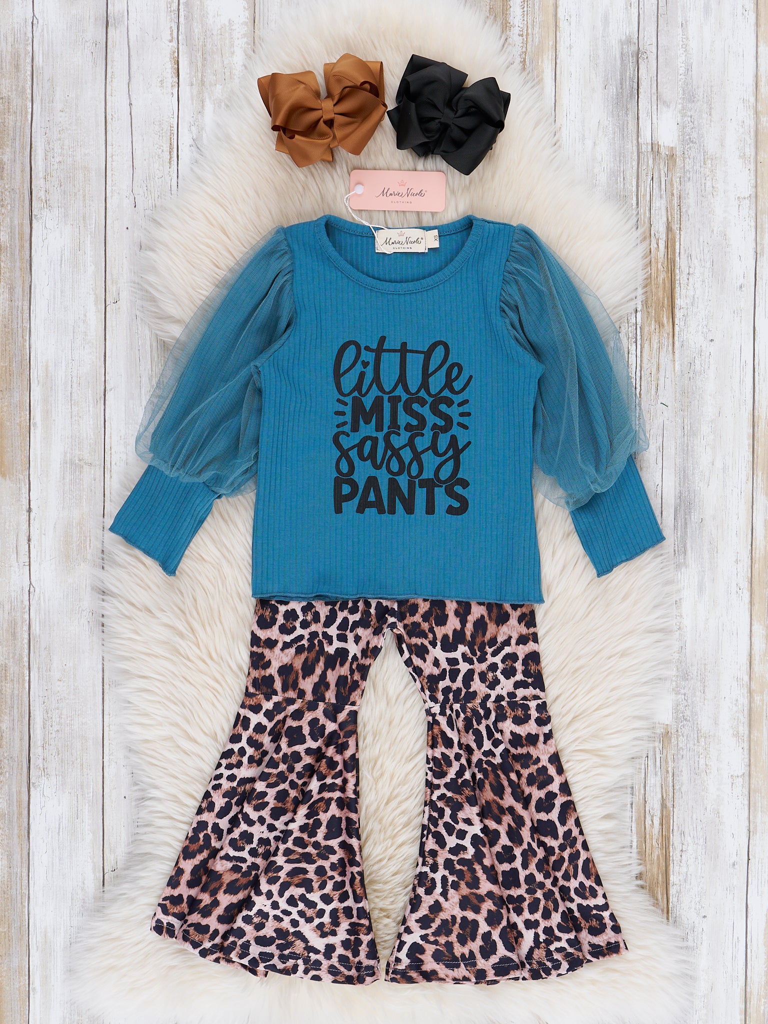 Unleash your little one's sassy style with our Blue & Leopard Sassy Pants Bell Bottoms Outfit! This trendy ensemble features a turquoise blue ribbed puff-sleeve top paired with playful leopard print bell bottoms. Perfect for the fashion-forward mini-diva in your life!