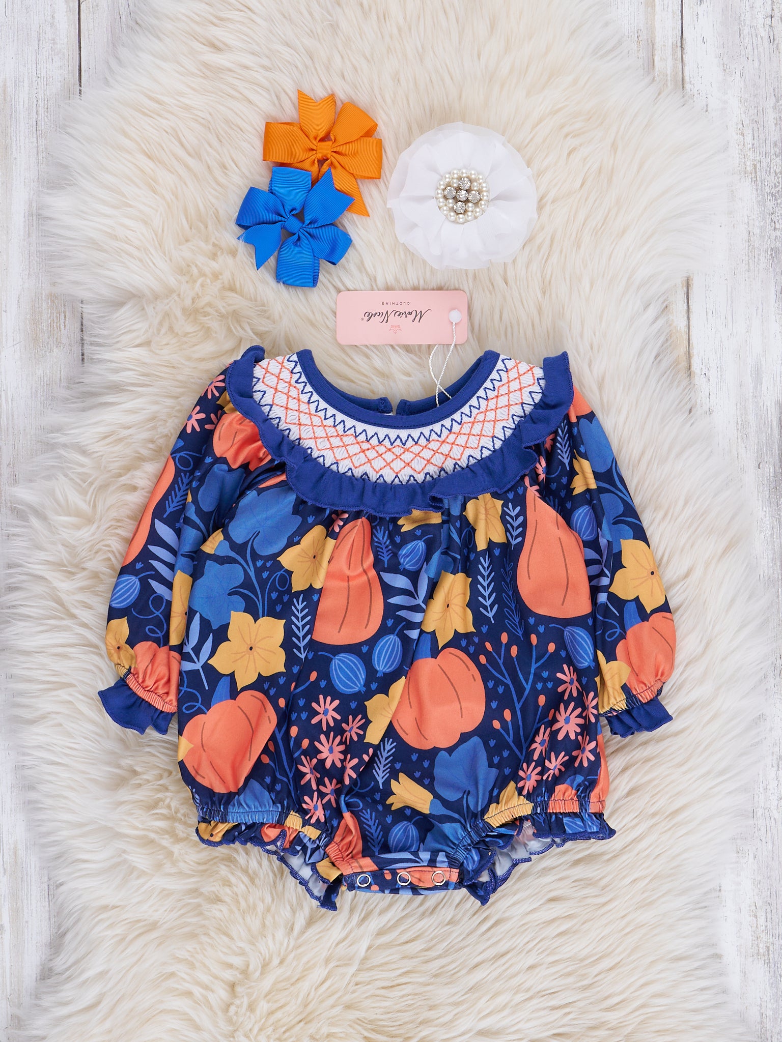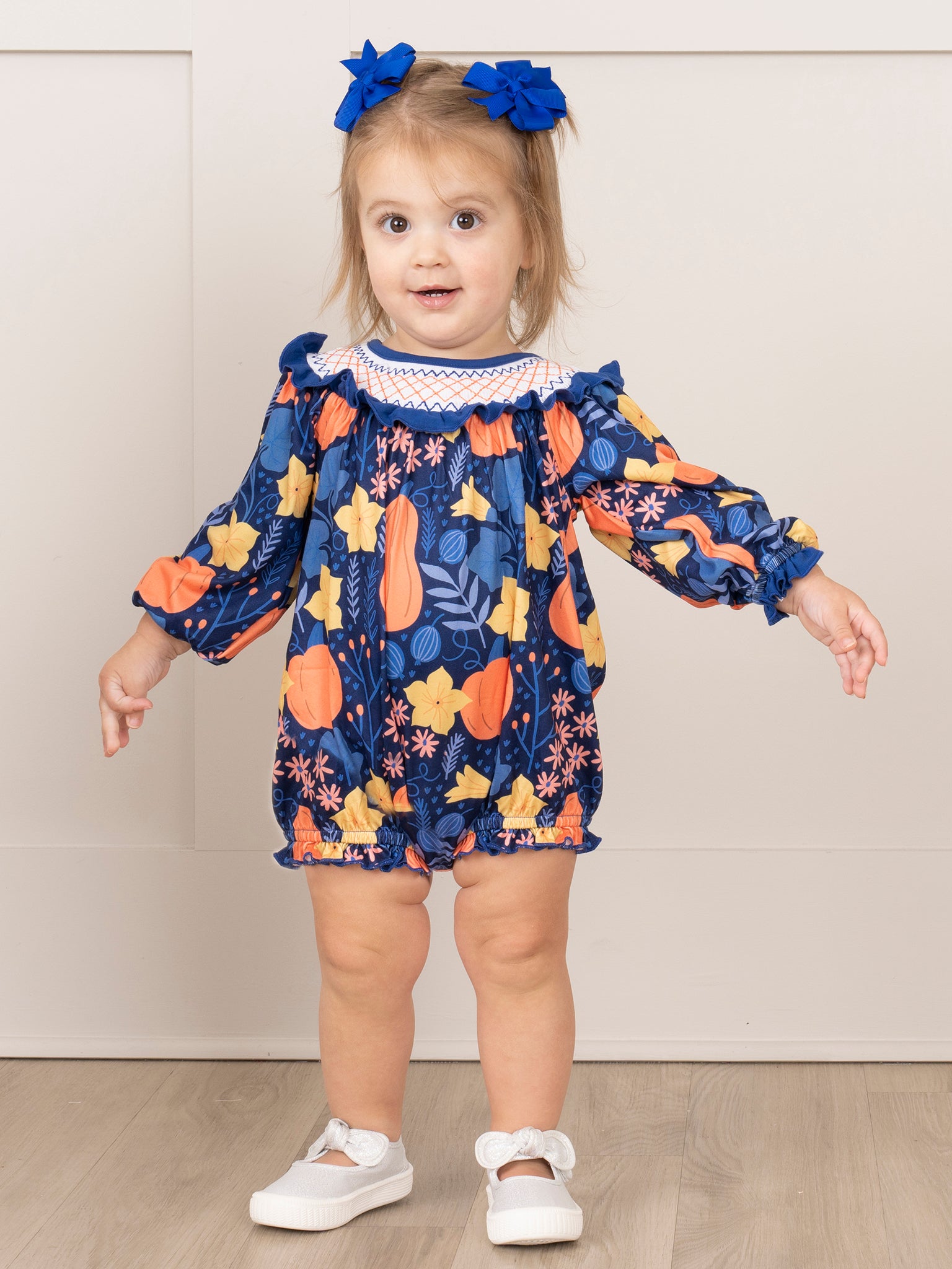 Introducing the Blue & Orange Smocked Gourds Bubble - perfect for your little fashionista! This playful girls bubble features a trendy gourds print and a stylish smocked collar. Don't forget to check out our sister set for a matching look.