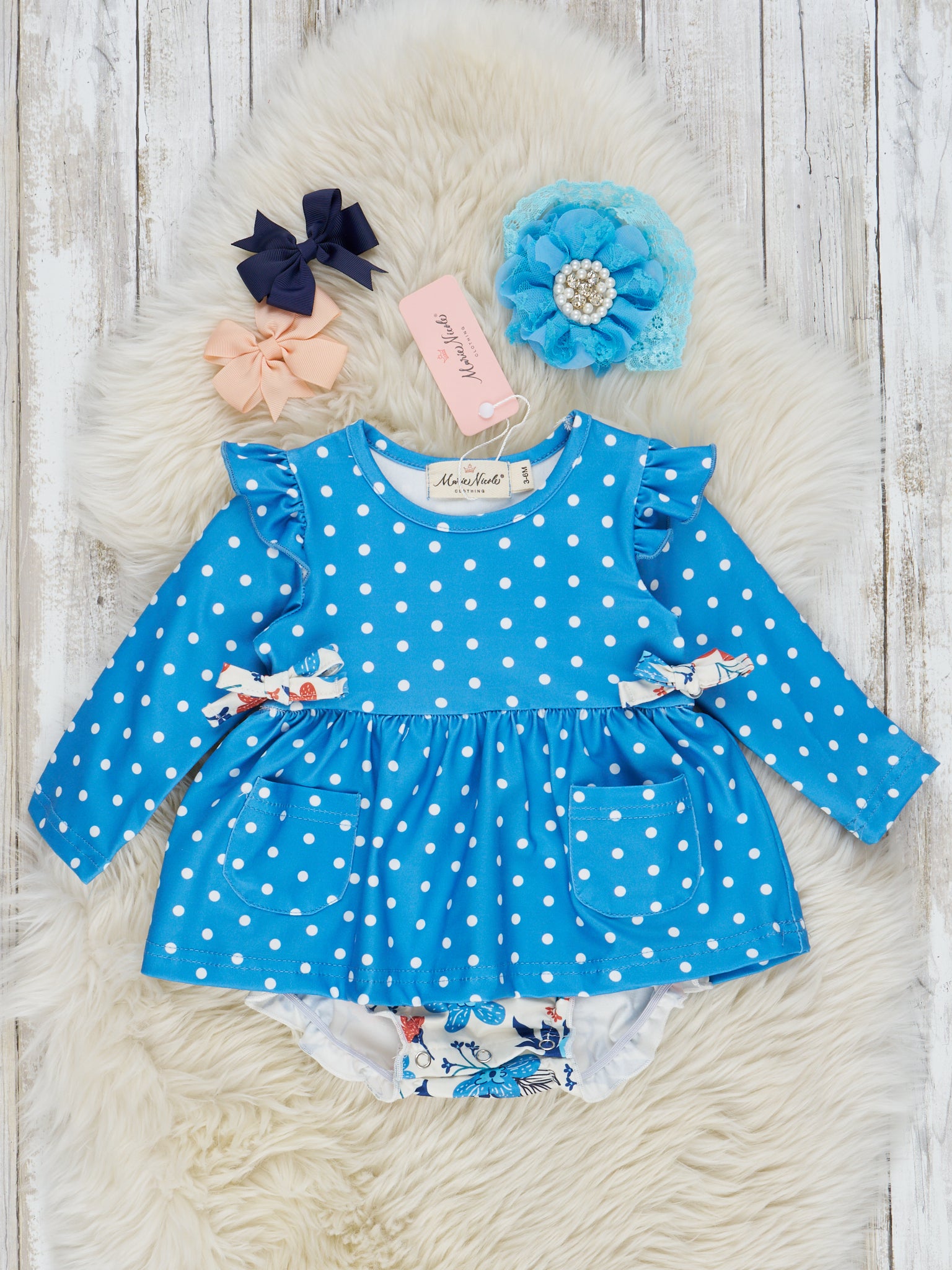 This precious bubble features a peplum polka dot top with bow details at the seam and a floral ruffle bottom. Shop the matching set here!