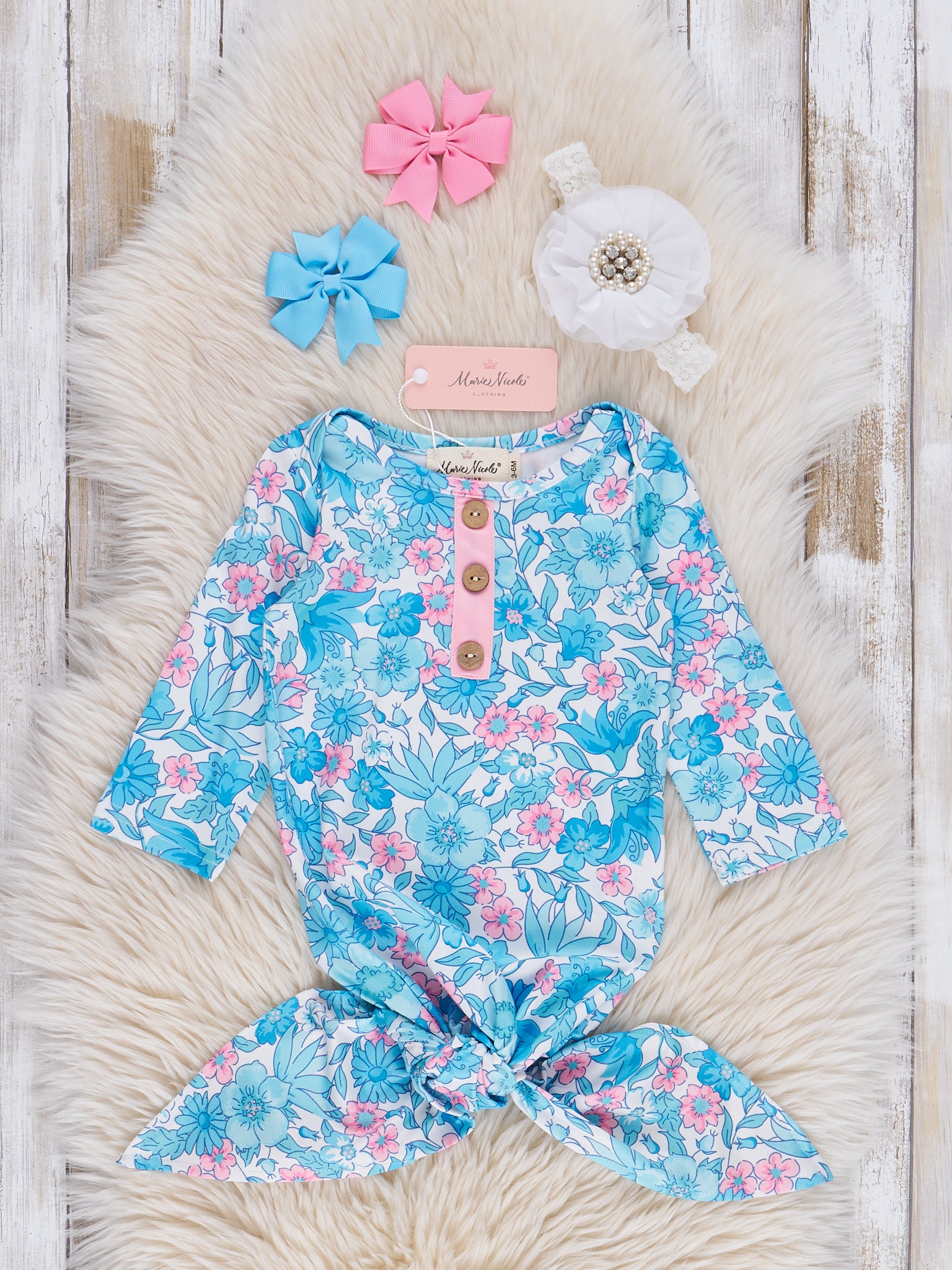 Get your little one ready for dreamland with our Blue Sleepy Garden Ruffle Knot Gown by Marie Nicole Clothing. Featuring a cute garden print with pink accents, this cozy sleep set will have them snoozing in style. The knot closure adds a sweet touch to this girls' sleep gown. Sweet dreams await!
