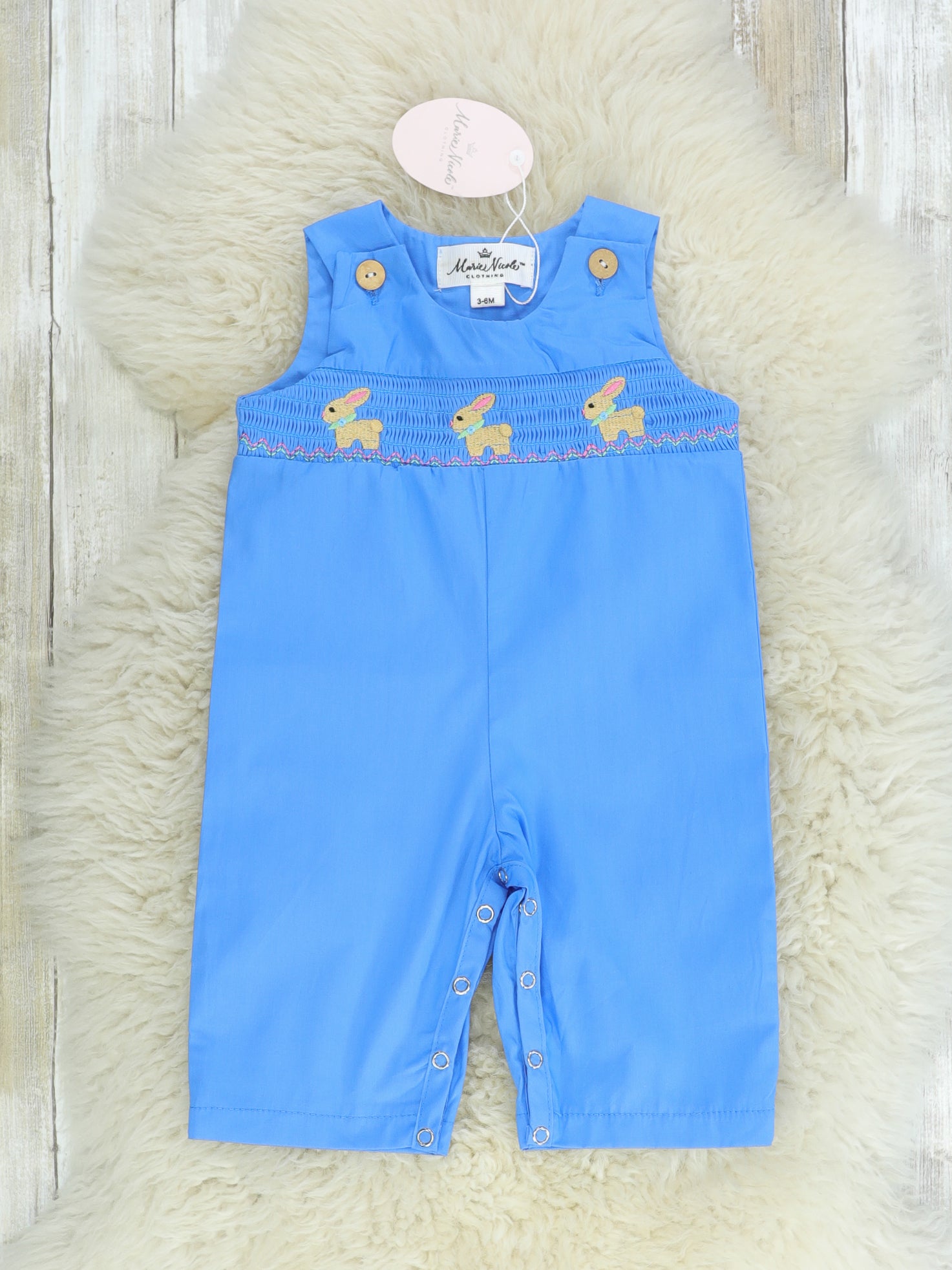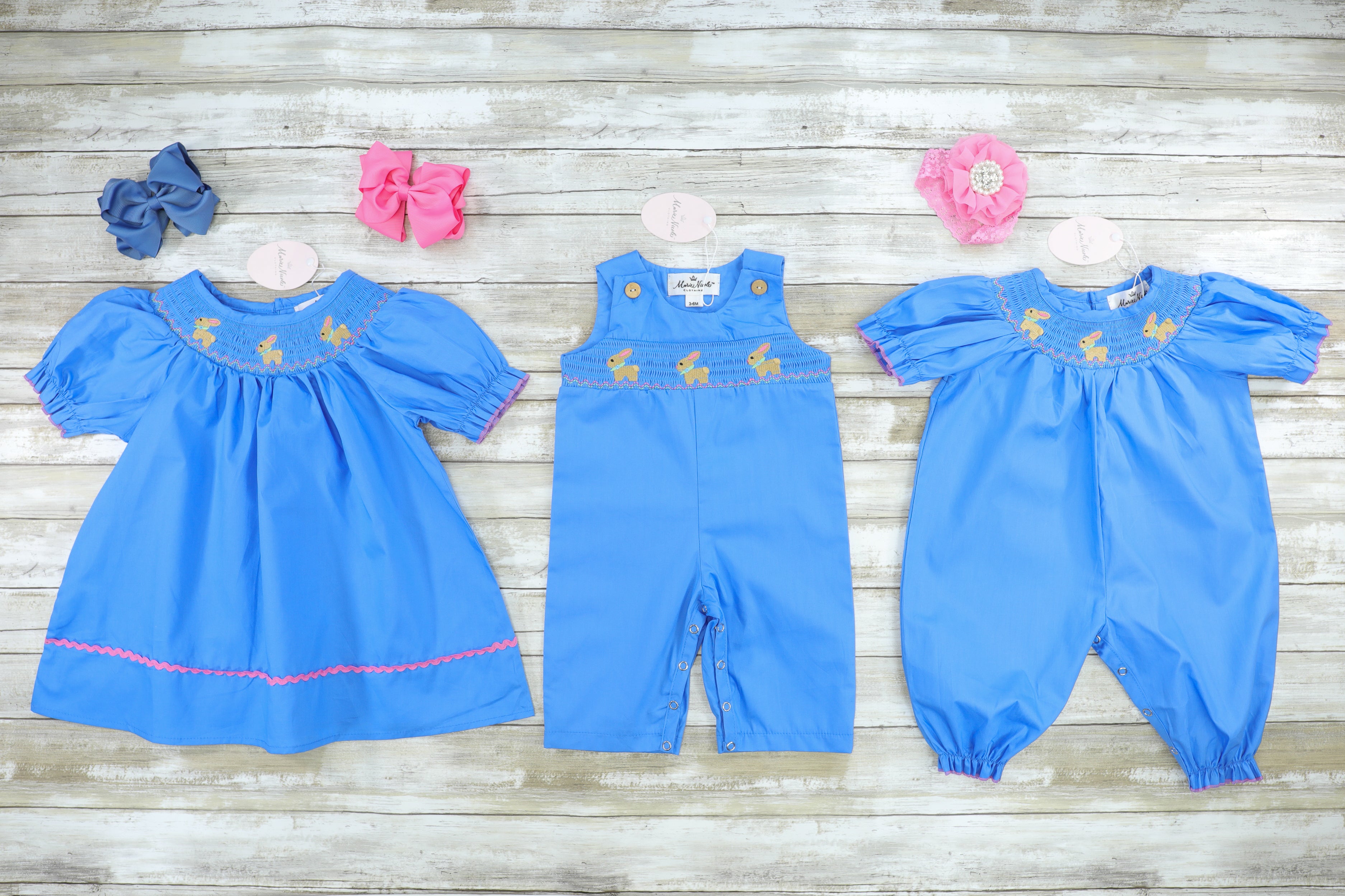 The cutest sibling set for all of your littles to match in this Easter! This blue Johnny features a smocked bunny design & snap buttons.