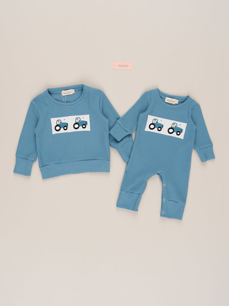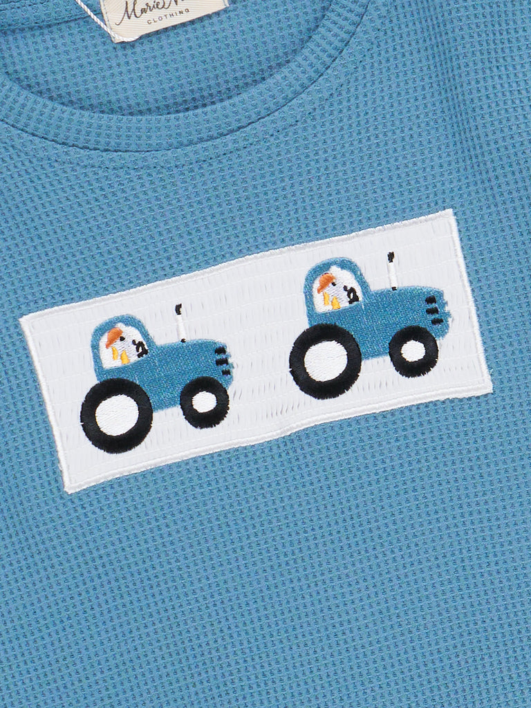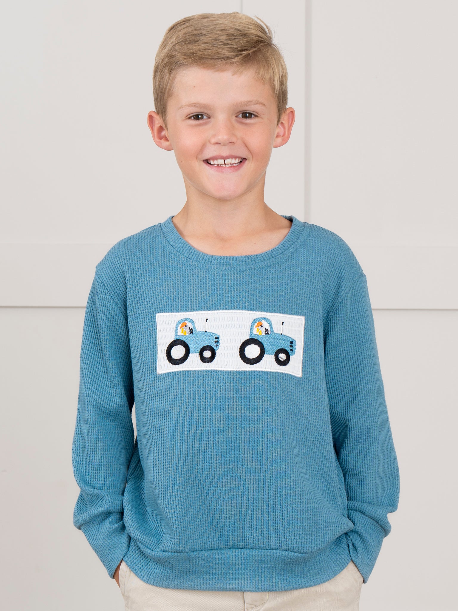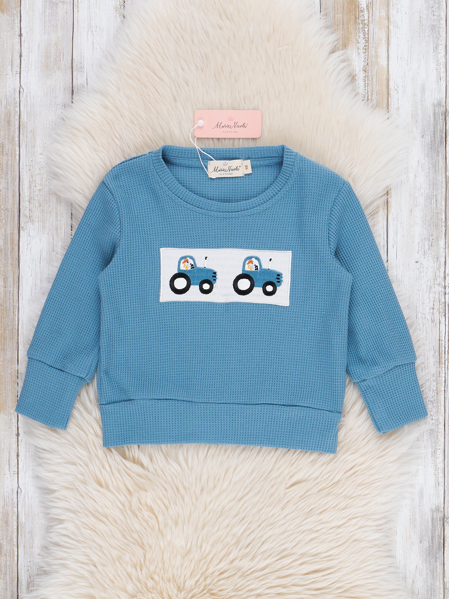 Get your little one ready for adventure with our charming Blue Skies Tractor Smocked Shirt! Featuring a playful embroidered tractor design over smocked detailing, this comfy waffle-knit shirt is perfect for your little boy. Yee-haw!