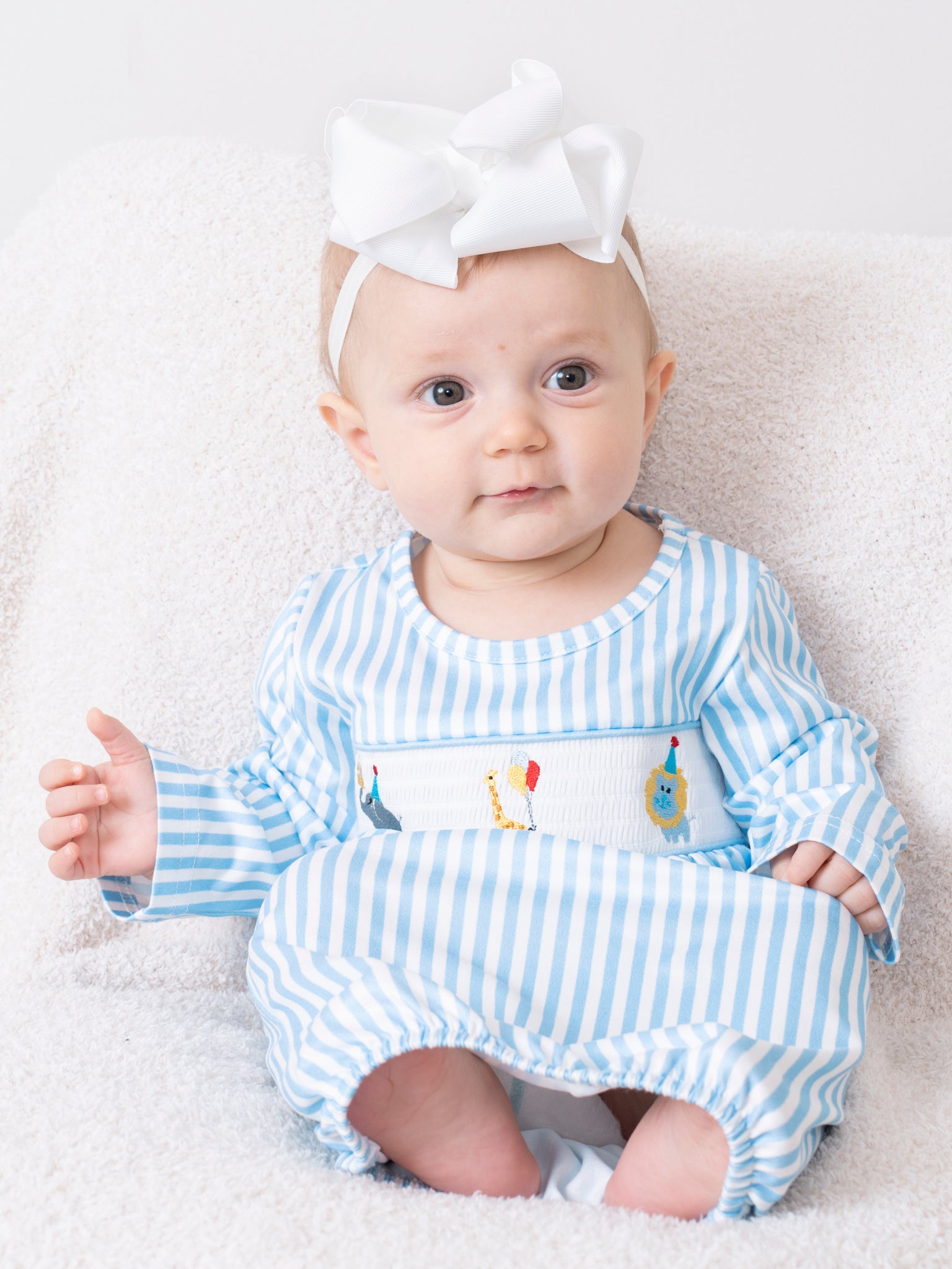 This sister set is carnival of joy! Featuring classic blue stripes and smocking with embroidered circus friends details, your little will have a ball in this gown!