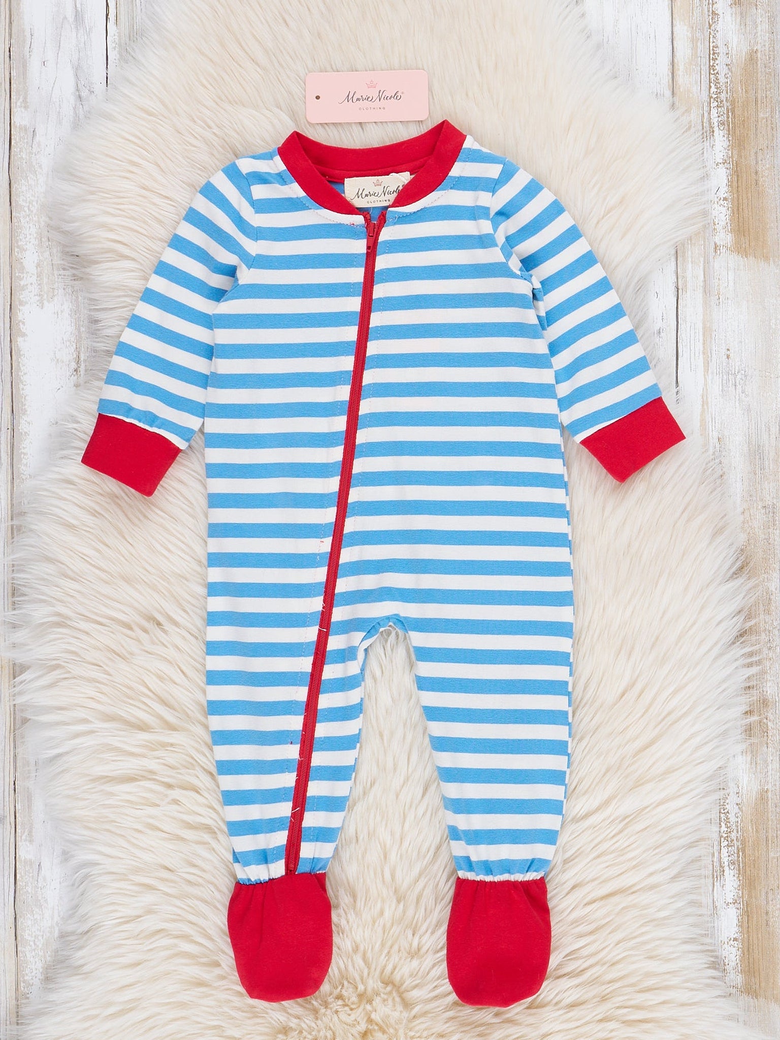 Get your little ones ready for the holiday season with this brother pajama set! These footed pajamas feature blue stripes and red trim, with an asymmetrical zipper for easy diaper changes. And the fun Santa cookies butt flap adds a playful touch to these Christmas pajamas. Perfect for keeping your little munchkin cozy and cute all season long.