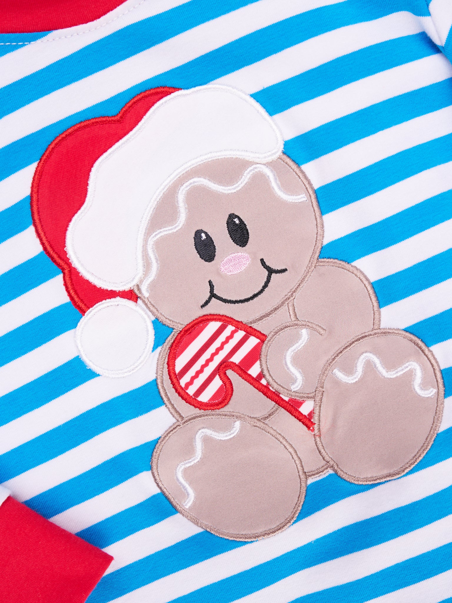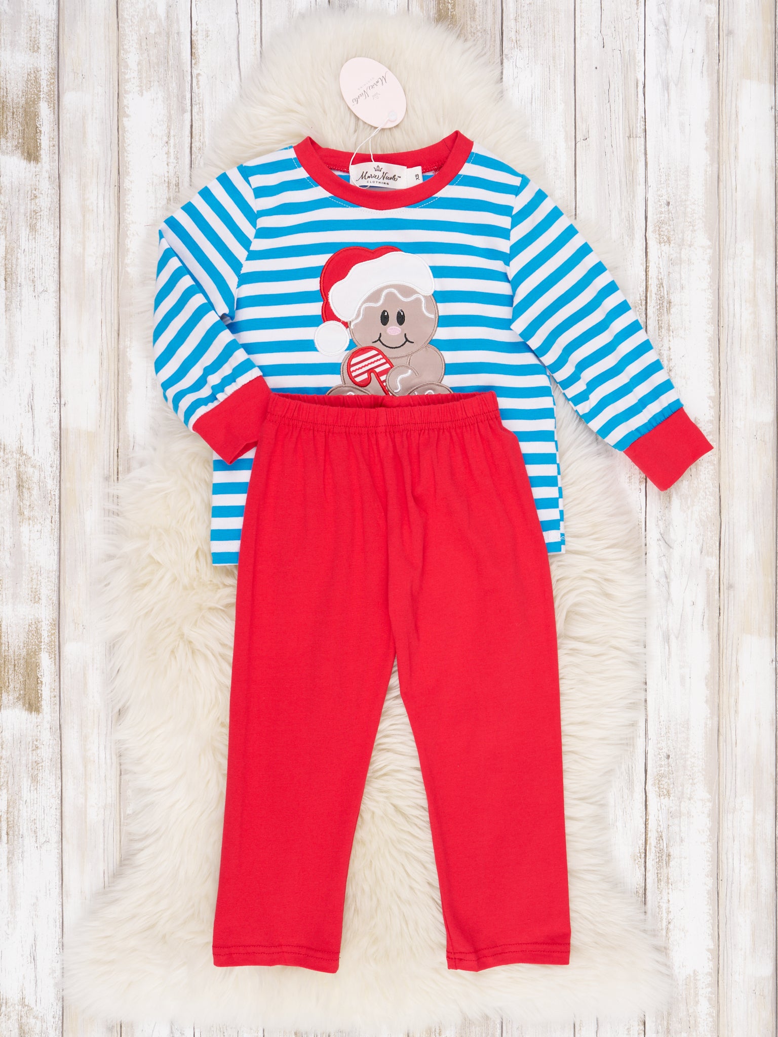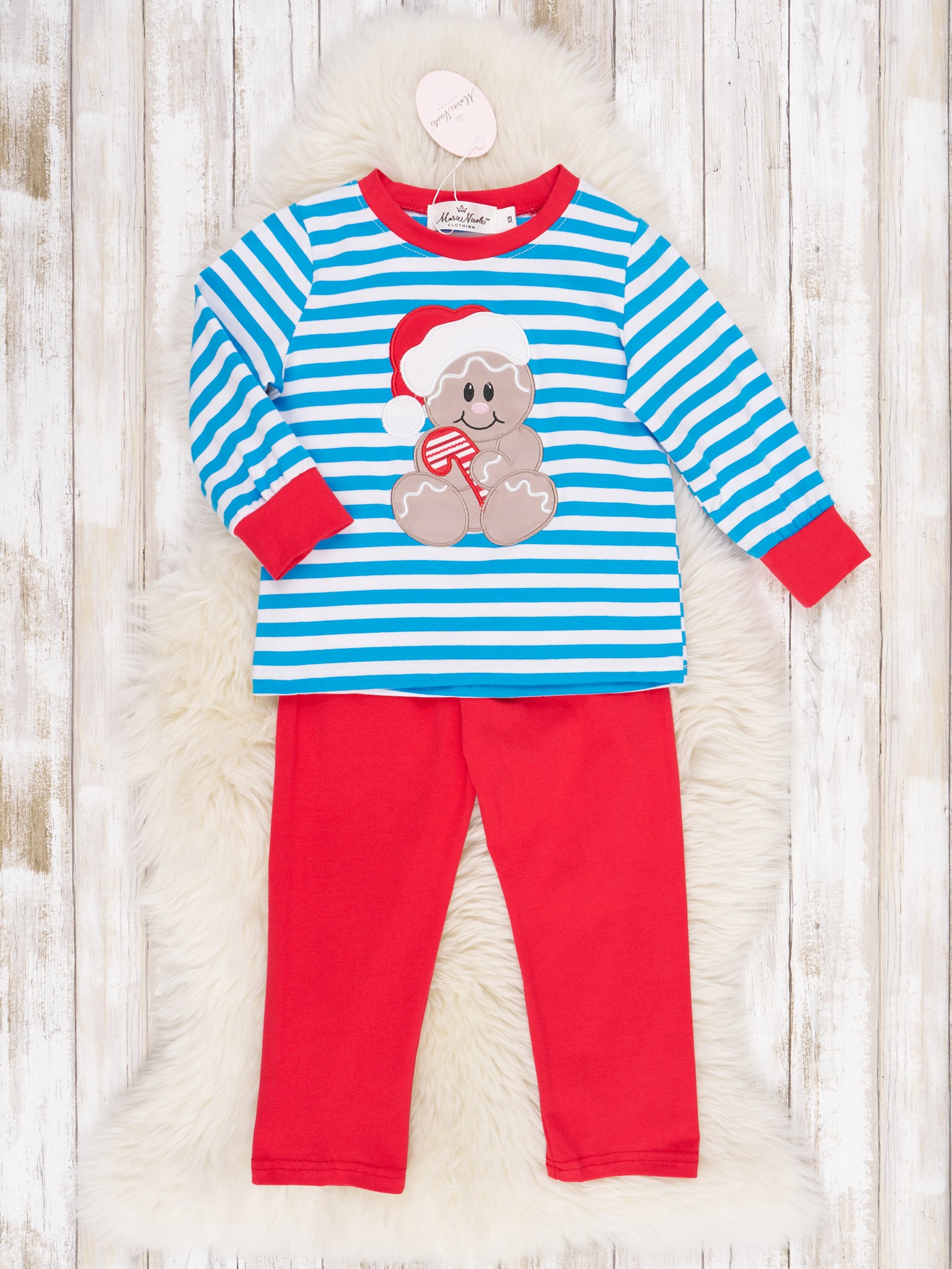 Dress your kids in the cutest confectionary outfit around: the Blue Striped Gingerbread Sibling Set! For siblings, each outfit is designed identically with blue stripes, a gingerbread appliqué, red trim, and red pants with an elastic waistband. This delicious duo will make your family look sweet on special occasions.