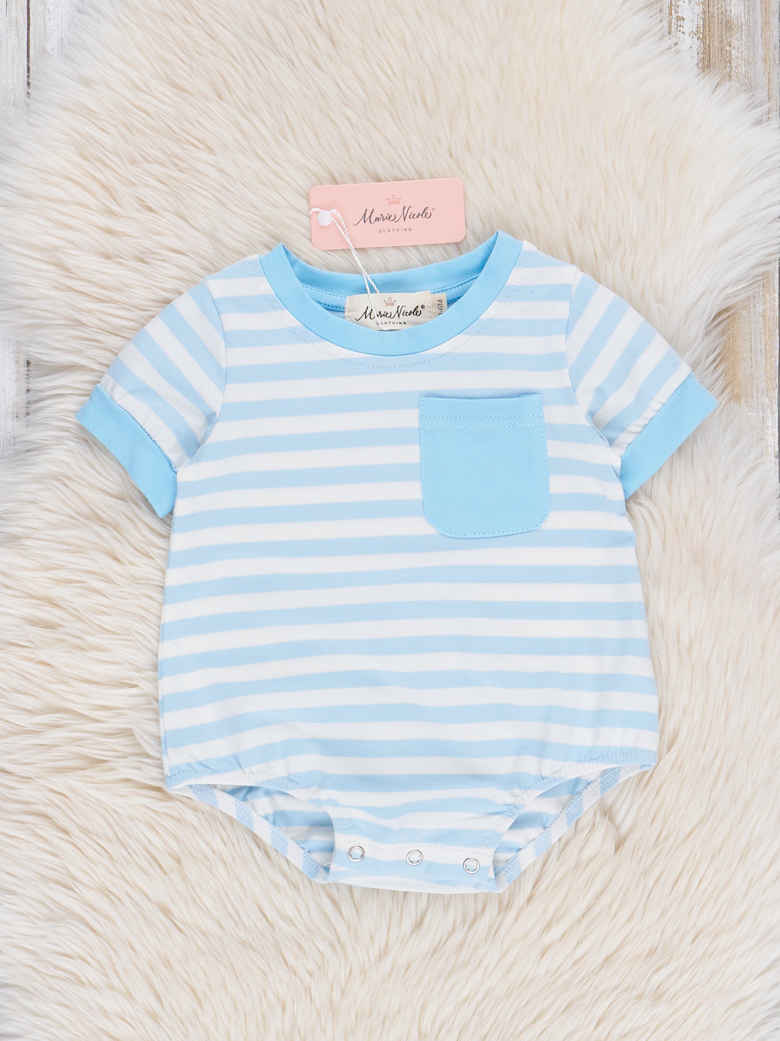 Get ready for the spring season with this adorable Blue Striped Pocket Bubble by Marie Nicole Clothing! Perfect for your little one, this boys bubble features a stylish blue striped bodice with blue trim and pocket detail. Complete the look with the matching brother set. Your kids will be the talk of the town in this fun and playful bubble!