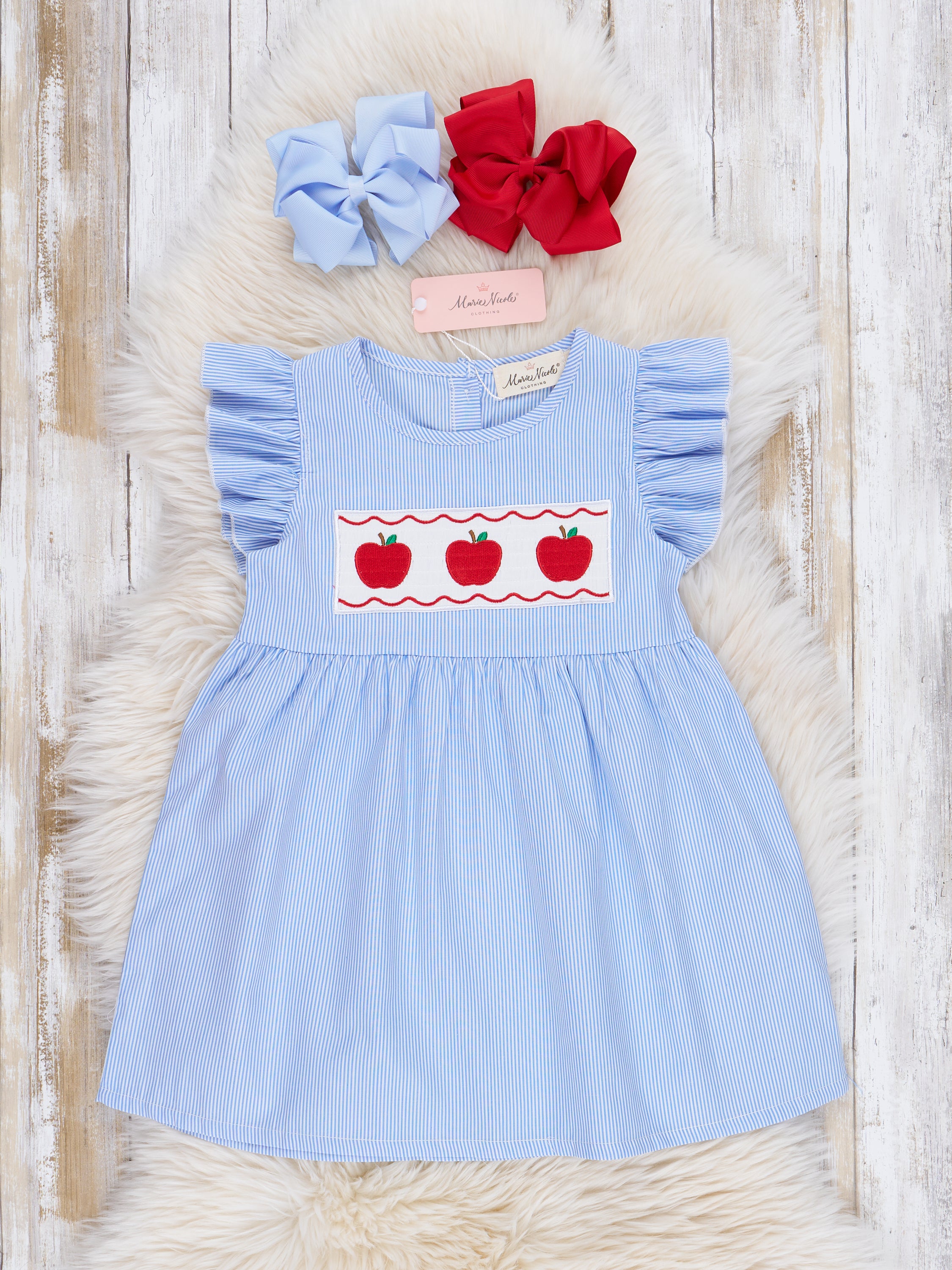 Stylish and sweet, this Smocked Pinstripe Apple Ruffle Dress is ready for a day at the park or the first day of school! Perfect for any fashionista, this dress features an eye-catching blue pinstripes, smocking, and fun embroidered apples! Plus, the ruffles & button back add a pop of pizzazz!