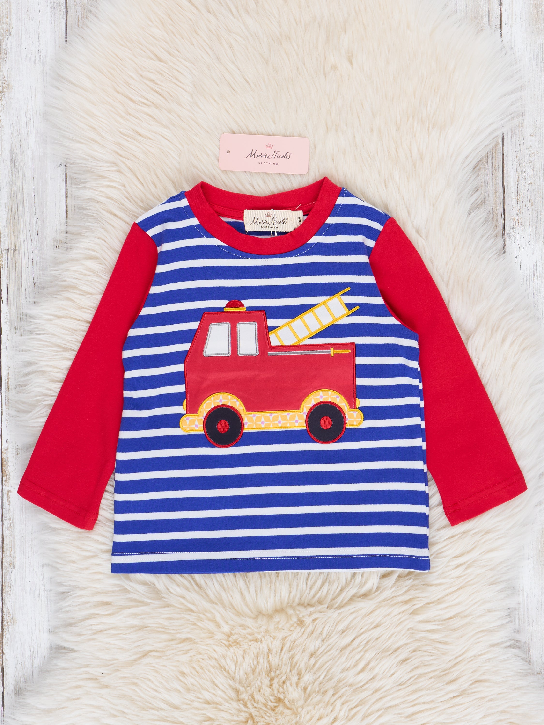 This sibling set will have your littles ready for a rescue adventure! The Blue Stripes & Red Fire Engine Shirt features bold blue stripes with red accents and an embroidered fire engine. Perfect for playtime or family outings, this romper combines fun and style.