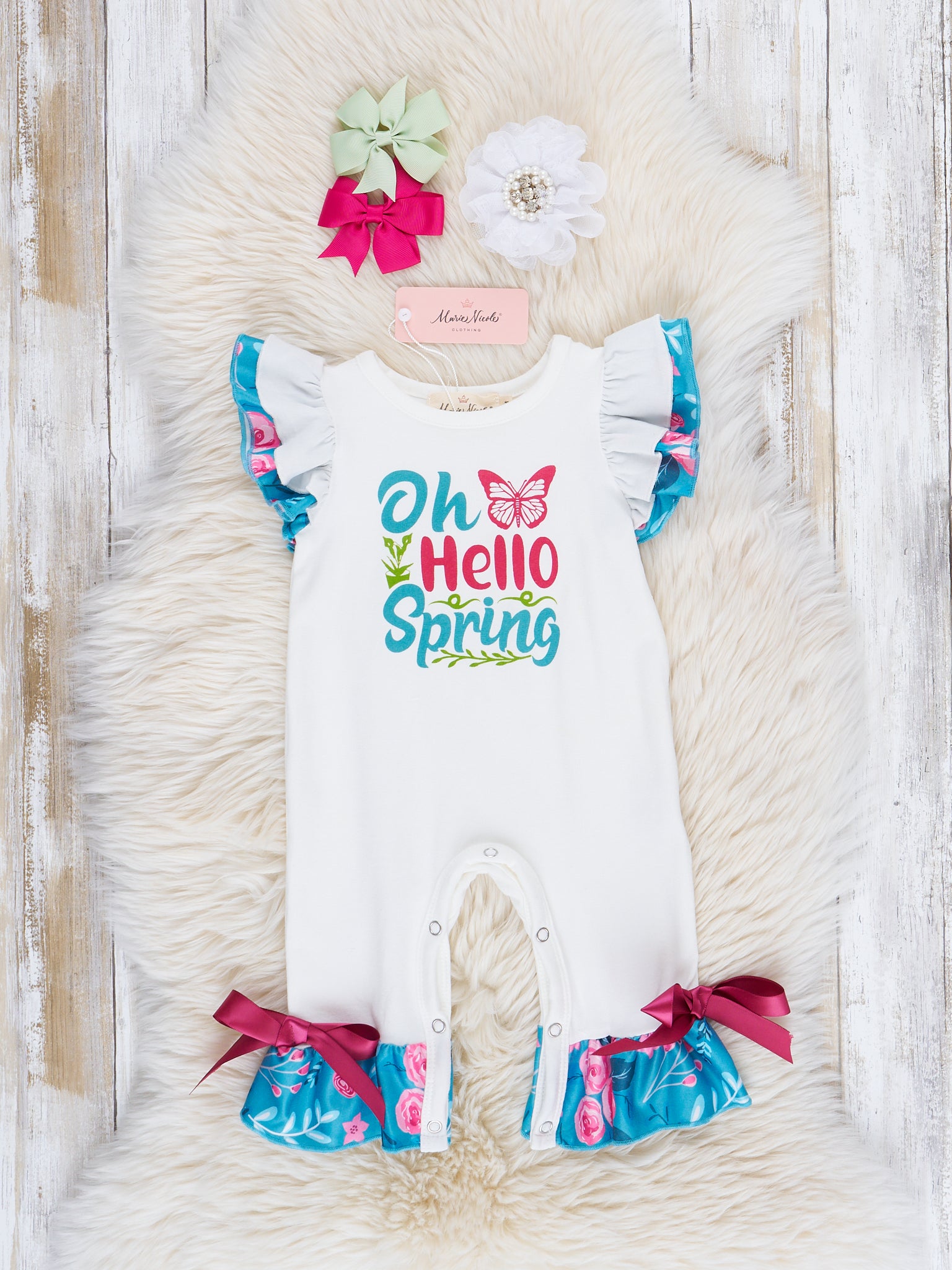 Say hello to spring in style with this playful Blue & White Floral Spring Greetings Ruffle Romper, perfect for sisters who want to match! This outfit's unique design and vibrant colors will make a statement wherever you go. Get ready to turn heads and welcome the new season with this must-have sister set!