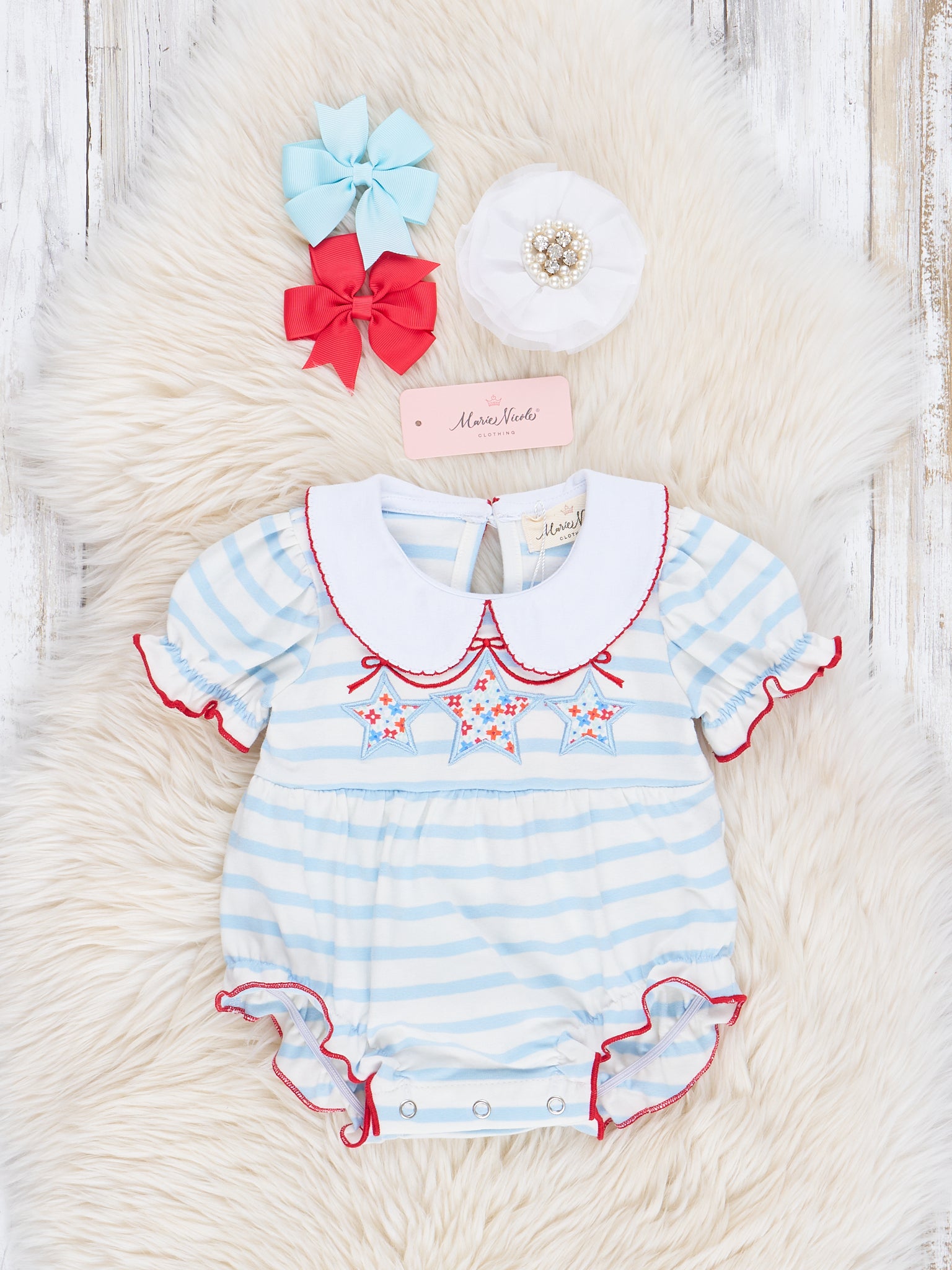 Rock the red, white, and blue with our Blue & White Striped Patriotic Stars Bubble! Featuring classic blue stripes, red trim, and a cute peter pan collar, this bubble is perfect for showing off your patriotic spirit. And for even more fun, get the matching sister set!