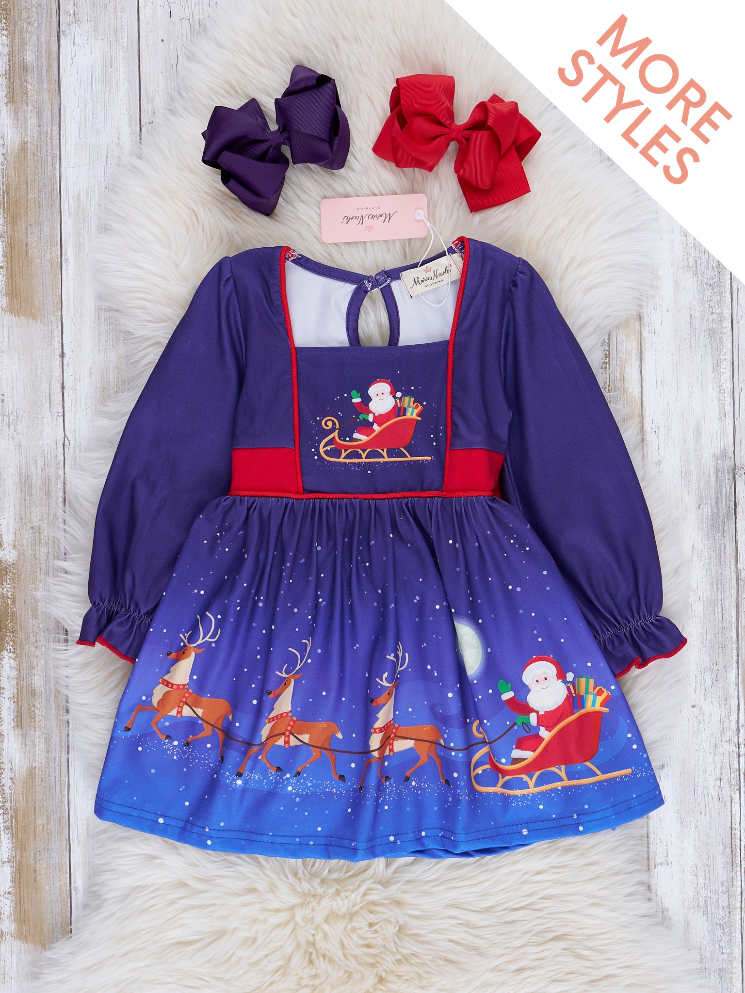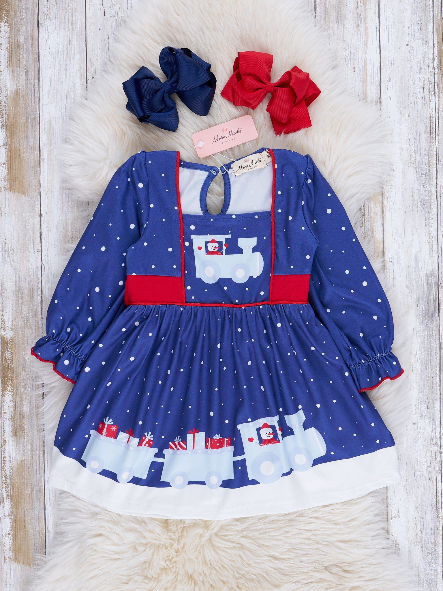 This girls dress is a delightful blend of whimsy and comfort, perfect for your little fashion explorer. The blue hues create a winter wonderland on the bodice, while the adorable illustration chugs along the skirt.
