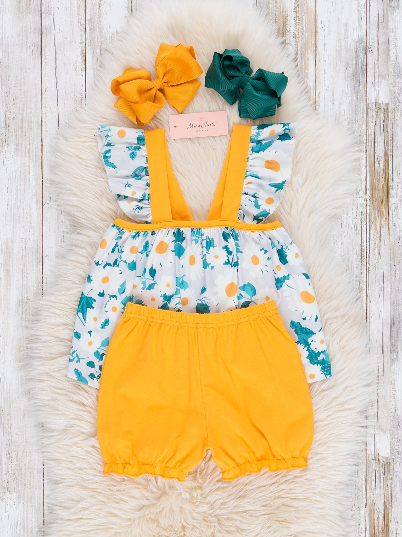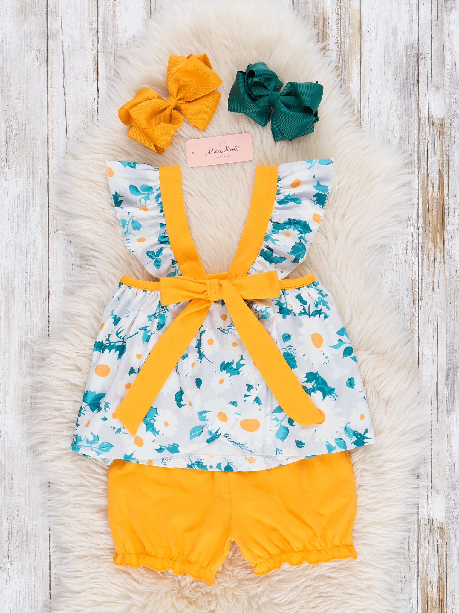 Get your little flower girl ready for spring with our Blue & Yellow Garden Ruffle Outfit! This adorable girls shorts set features a daisy print top with flutter sleeves paired with playful yellow ruffle shorts. The perfect sister set brought to you by Marie Nicole Clothing.