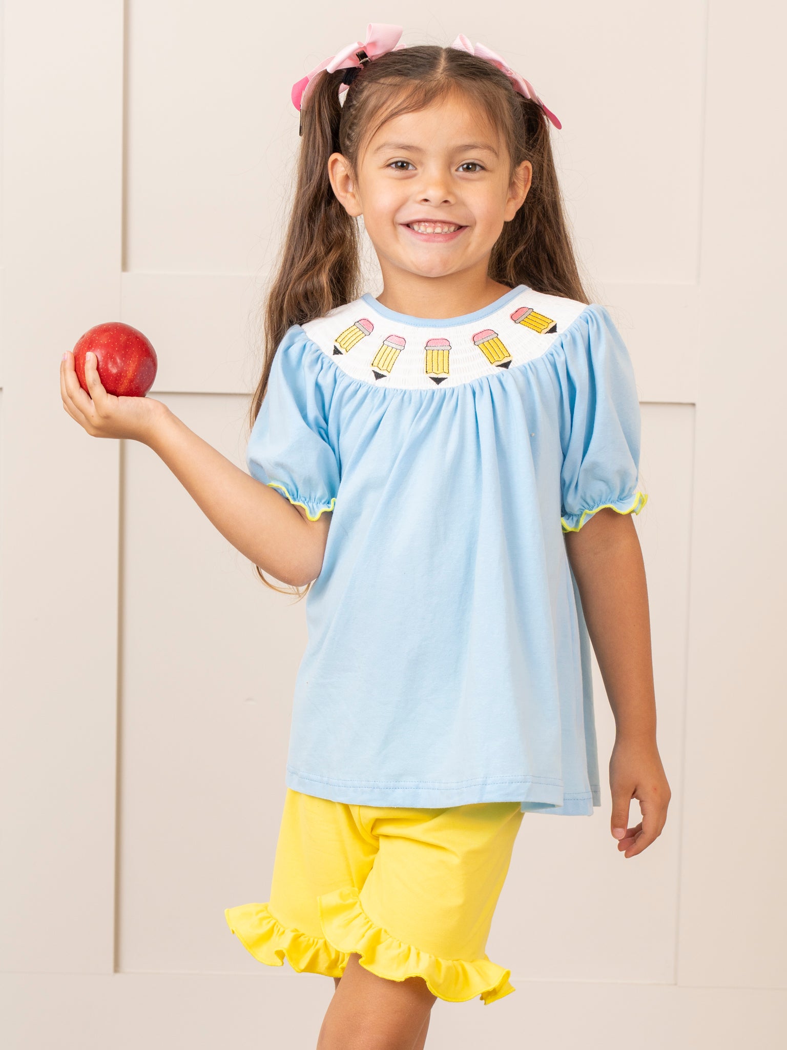 Rock the perfect back-to-school style with our Blue & Yellow Smocked Pencils Outfit! Perfect for girls, this outfit features cute embroidered pencils over a smocked neckline, and bright yellow ruffle hem shorts. Say goodbye to boring outfits and hello to quirky fashion!