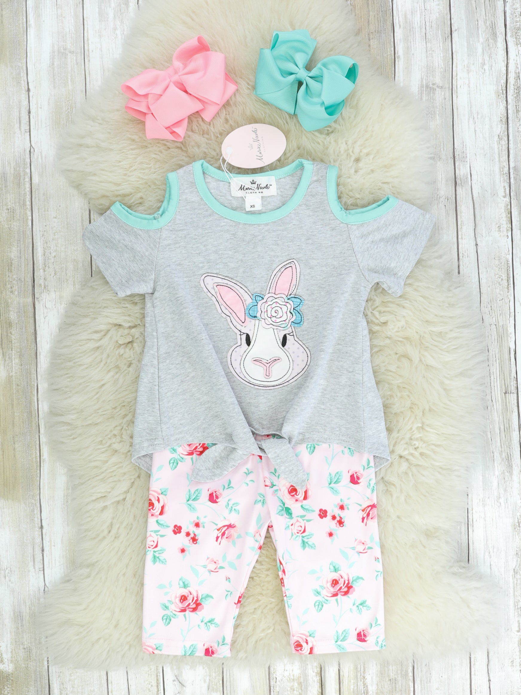 We love this adorable rose sister set! This outfit features a grey cold-shouldered top with mint trim, a bunny appliqué, and a knot tie detail. The blush bottoms are capri length with a gorgeous rose pattern.