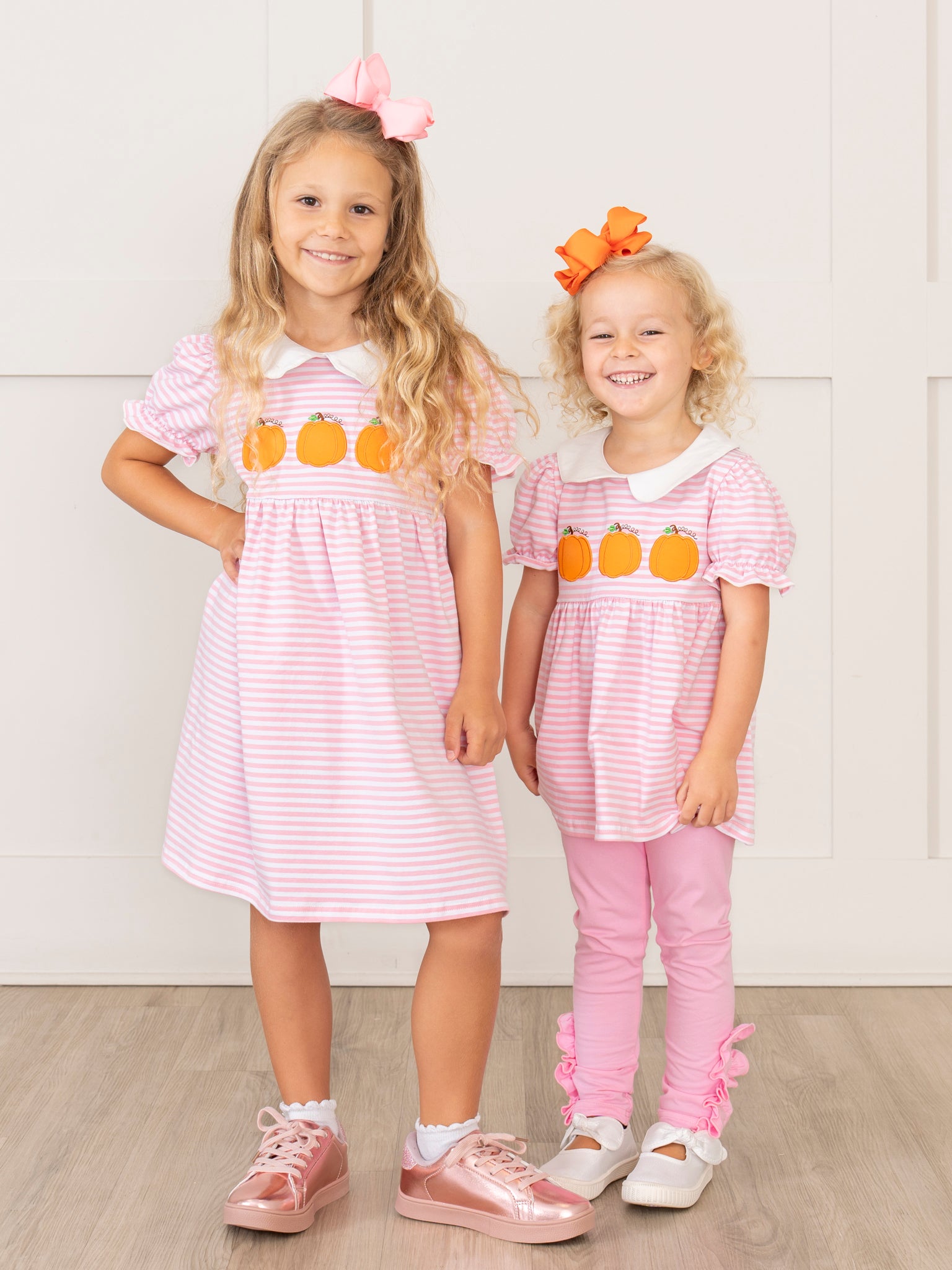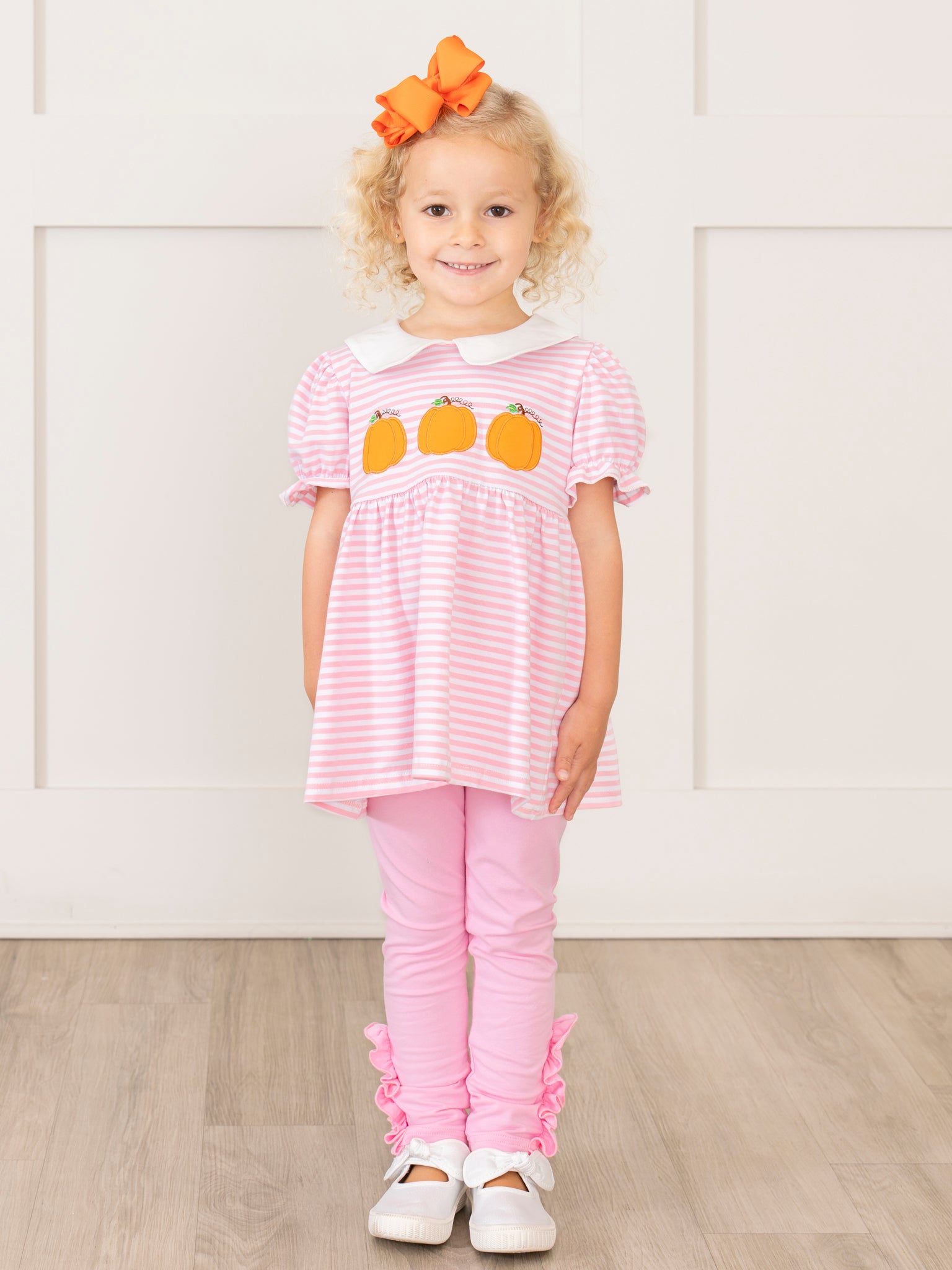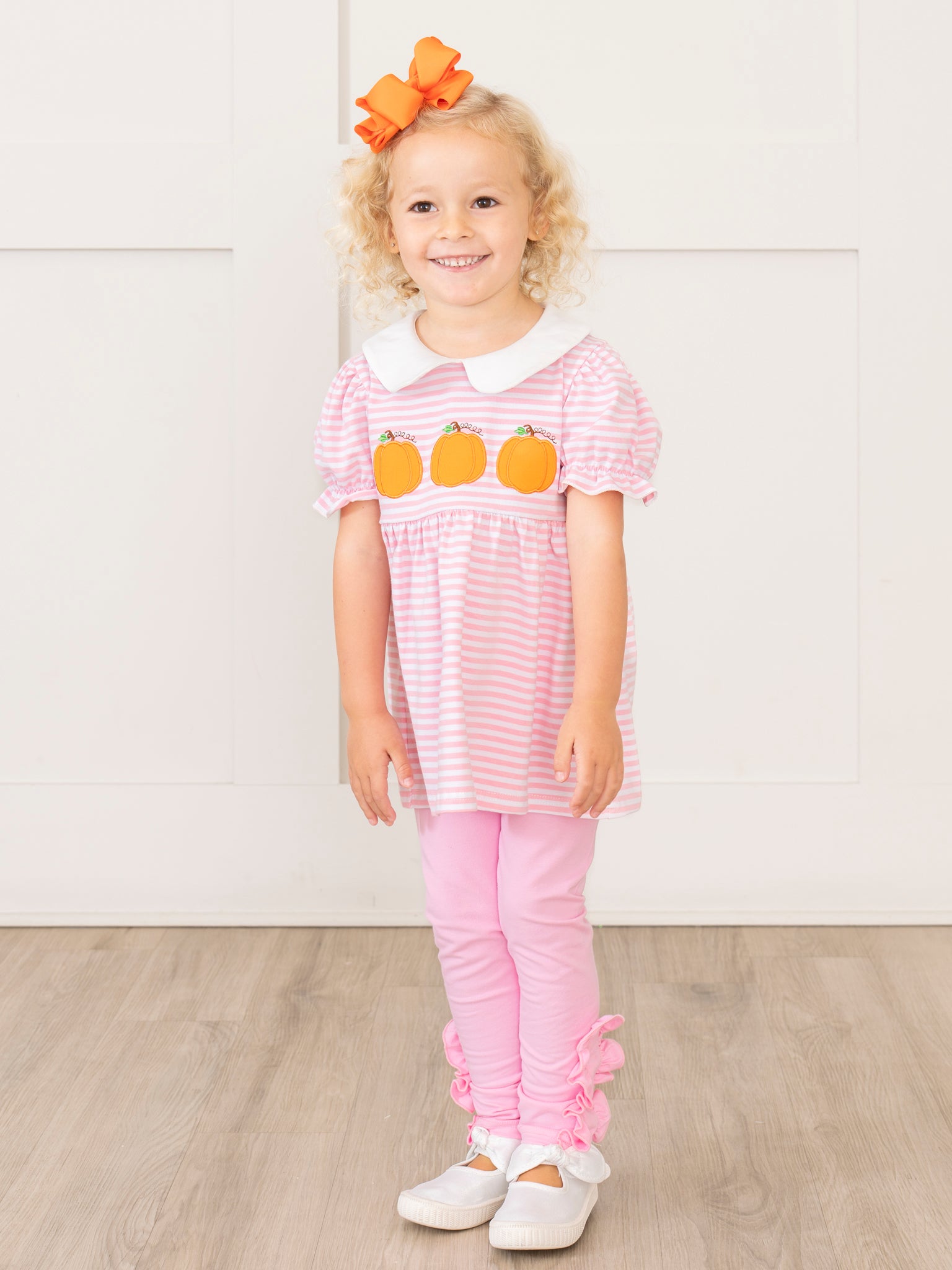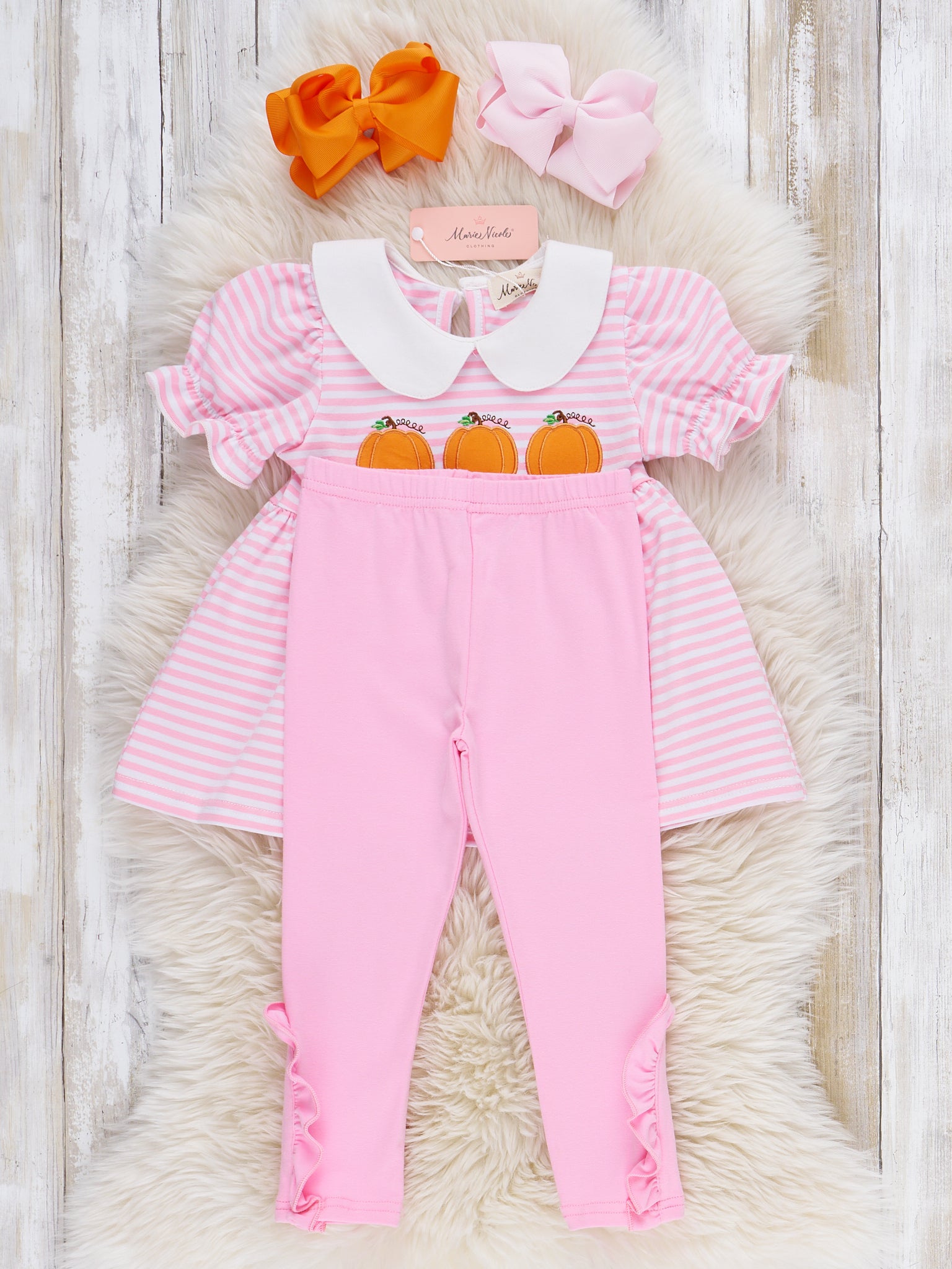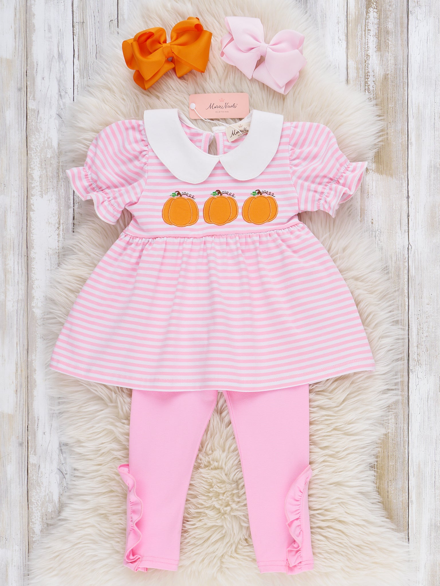 The Blushin’ in the Patch Embroidered Outfit is a lovely set for a sweet fall season. This outfit from Marie Nicole Clothing features a soft, felt, Peter Pan collar and adorable pumpkin embroidery. The pink-striped fabric is created from comfortable, stretchy material, making this outfit ideal for autumn playtime, charming fall photos, and visits to the pumpkin patch.