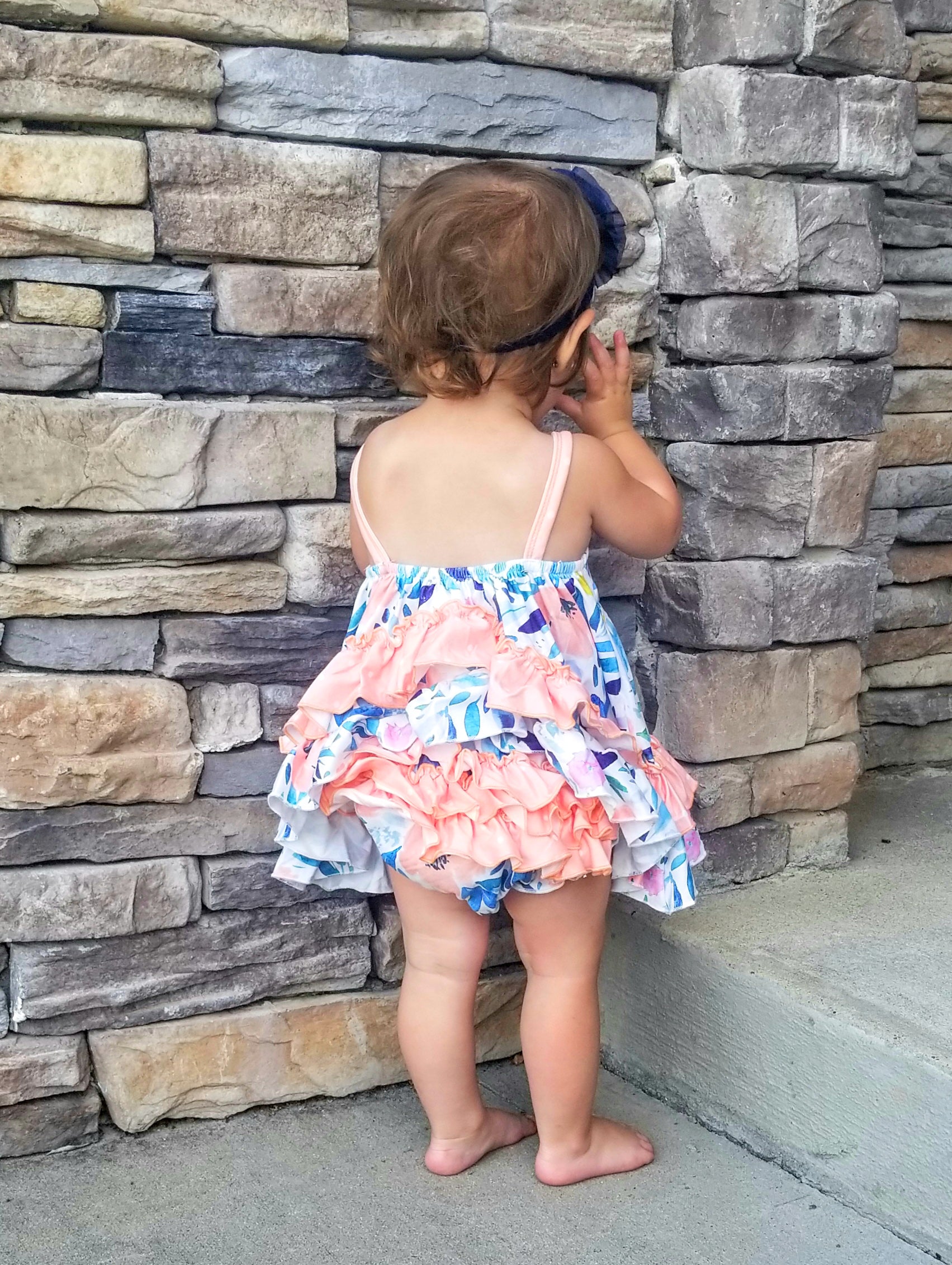 Kaylee is 21 pds., 30 in. tall wearing a size 6/12MOS. She sized down from her normal size.
